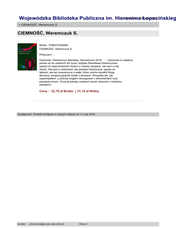 Utworzono : 02Łopacińskieg March 2017 Wojewódzka Biblioteka Publiczna im. Hieronima > CIEMNOŚĆ, Weremczuk S. CIEMNOŚĆ, Weremczuk S. Model : 9788372225900 CIEMNOŚĆ, Weremczuk S. Producent : Ciemność, Weremczuk Stanisław, Nornertinum 2016�� Ciemność to ostatnia, pisana aż do ostatnich dni życia, książka Stanisława Weremczuka, oparta na wspomnieniach Autora z czasów okupacji. Jak sam o niej mówił: „Nie jest to dokument, ale powieść historyczna, oparta na faktach, ale też rozszerzona o wątki, które można określić fikcją literacką, związaną jednak ściśle z tematem. Wszystko tak, jak zapamiętałem, a później mogłem skorygować z dokumentami oraz pamięcią innych. Chcę tę pamięć zostawić swoim dzieciom i młodemu pokoleniu”. Cena : 32,70 zł Brutto ( 31,14 zł Netto) Dostępność: Produkt dostępny w naszym sklepie od 11 July 2016 kontakt : - [email protected] Strona 1