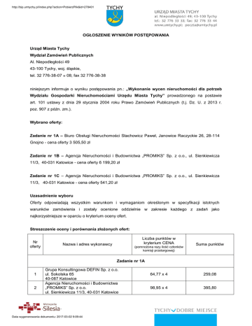 http://bip.umtychy.pl/index.php?action=PobierzPlik&id=278401 OGŁOSZENIE WYNIKÓW POSTĘPOWANIA Urząd Miasta Tychy Wydział Zamówień Publicznych Al. Niepodległości 49 43-100 Tychy, woj. śląskie, tel. 32 776-38-07 08; fax 32 776-38-38 niniejszym informuje o wyniku postępowania pn.: „Wykonanie wycen nieruchomości dla potrzeb Wydziału Gospodarki Nieruchomościami Urzędu Miasta Tychy” prowadzonego na postawie art. 101 ustawy z dnia 29 stycznia 2004 roku Prawo Zamówień Publicznych (t.j. Dz. U. z 2013 r. poz. 907 z późn. zm.). Wybrano oferty: Zadanie nr 1A – Biuro Obsługi Nieruchomości Stachowicz Paweł, Janowice Raczyckie 26, 28-114 Gnojno - cena oferty 3 505,50 zł Zadanie nr 1B – Agencja Nieruchomości i Budownictwa „PROMIKS” Sp. z o.o., ul. Sienkiewicza 11/3, 40-031 Katowice - cena oferty 6 199,20 zł Zadanie nr 1C – Agencja Nieruchomości i Budownictwa „PROMIKS” Sp. z o.o., ul. Sienkiewicza 11/3, 40-031 Katowice - cena oferty 541,20 zł Uzasadnienie wyboru Oferty odpowiadają wszystkim warunkom i wymaganiom określonym w specyfikacji istotnych warunków zamówienia i zostały ocenione oddzielnie w zakresie każdego z zadań jako najkorzystniejsze w oparciu o kryterium oceny ofert. Streszczenie oceny i porównania złożonych ofert: Nr oferty Liczba punktów w kryterium CENA Nazwa i adres wykonawcy (pomnożona razy ilość członków komisji przetargowej) Suma punktów Zadanie nr 1A 1 2 Grupa Konsultingowa DEFIN Sp. z o.o. ul. Sokolska 65 40-087 Katowice Agencja Nieruchomości i Budownictwa „PROMIKS” Sp. z o.o. ul. Sienkiewicza 11/3, 40-031 Katowice Data wygenerowania dokumentu: 2017-03-02 9:09:44 64,77 x 4 259,08 98,95 x 4 395,80 http://bip.umtychy.pl/index.php?action=PobierzPlik&id=278401 3 Biuro Obsługi Nieruchomości Stachowicz Paweł Janowice Raczyckie 26, 28-114 Gnojno 100 x 4 400 60 x 4 240 100 x 4 400 84,33 x 4 337,32 55 x 4 220 100 x 4 400 44 x 4 176 Zadanie nr 1B 1 2 3 Grupa Konsultingowa DEFIN Sp. z o.o. ul. Sokolska 65 40-087 Katowice Agencja Nieruchomości i Budownictwa „PROMIKS” Sp. z o.o. ul. Sienkiewicza 11/3, 40-031 Katowice Biuro Obsługi Nieruchomości Stachowicz Paweł Janowice Raczyckie 26, 28-114 Gnojno Zadanie nr 1C 1 2 4 Grupa Konsultingowa DEFIN Sp. z o.o. ul. Sokolska 65 40-087 Katowice Agencja Nieruchomości i Budownictwa „PROMIKS” Sp. z o.o. ul. Sienkiewicza 11/3, 40-031 Katowice Pracownia Projektów Budownictwa Janusz Przybyłka ul. Wschodnia 18, 43-100 Tychy Z poważaniem Zastępca Prezydenta Miasta ds. Gospodarki Przestrzennej mgr Igor Śmietański Sporządziła: Malicka Agnieszka Tychy, dnia 17.11.2015 r. Data wygenerowania dokumentu: 2017-03-02 9:09:44 Powered by TCPDF (www.tcpdf.org)