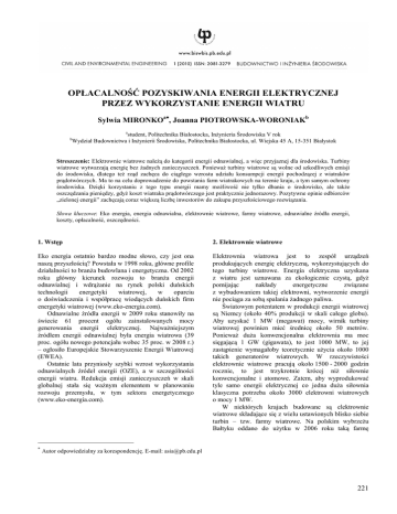 OPŁACALNOŚĆ POZYSKIWANIA ENERGII ELEKTRYCZNEJ PRZEZ WYKORZYSTANIE ENERGII WIATRU Sylwia MIRONKOa∗∗, Joanna PIOTROWSKA-WORONIAKb a student, Politechnika Białostocka, Inżynieria Środowiska V rok Wydział Budownictwa i Inżynierii Środowiska, Politechnika Białostocka, ul. Wiejska 45 A, 15-351 Białystok b Streszczenie: Elektrownie wiatrowe należą do kategorii energii odnawialnej, a więc przyjaznej dla środowiska. Turbiny wiatrowe wytwarzają energię bez żadnych zanieczyszczeń. Ponieważ turbiny wiatrowe są wolne od szkodliwych emisji do środowiska, dlatego też rząd zachęca do ciągłego wzrostu udziału konsumpcji energii pochodzącej z wiatraków prądotwórczych. Ma to na celu doprowadzenie do powstania farm wiatrakowych na terenie kraju, a tym samym ochrony środowiska. Dzięki korzystaniu z tego typu energii mamy możliwość nie tylko dbania o środowisko, ale także oszczędzania pieniędzy, gdyż koszt wiatraka prądotwórczego jest praktycznie jednorazowy. Pozytywne opinie odbiorców „zielonej energii” zachęcają coraz większą liczbę inwestorów do zakupu przyszłościowego rozwiązania. Słowa kluczowe: Eko energia, energia odnawialna, elektrownie wiatrowe, farmy wiatrowe, odnawialne źródła energii, koszty, opłacalność, oszczędności. 1. Wstęp 2. Elektrownie wiatrowe Eko energia ostatnio bardzo modne słowo, czy jest ona naszą przyszłością? Powstała w 1998 roku, główne profile działalności to branża budowlana i energetyczna. Od 2002 roku główny kierunek rozwoju to branża energii odnawialnej i wdrążanie na rynek polski duńskich technologii energetyki wiatrowej, w oparciu o doświadczenia i współpracę wiodących duńskich firm energetyki wiatrowej (www.eko-energia.com). Odnawialne źródła energii w 2009 roku stanowiły na świecie 61 procent ogółu zainstalowanych mocy generowania energii elektrycznej. Najważniejszym źródłem energii odnawialnej była energia wiatrowa (39 proc. ogółu nowego potencjału wobec 35 proc. w 2008 r.) – ogłosiło Europejskie Stowarzyszenie Energii Wiatrowej (EWEA). Ostatnie lata przyniosły szybki wzrost wykorzystania odnawialnych źródeł energii (OZE), a w szczególności energii wiatru. Redukcja emisji zanieczyszczeń w skali globalnej stała się ważnym elementem w planowaniu rozwoju przemysłu, w tym sektora energetycznego (www.eko-energia.com). Elektrownia wiatrowa jest to zespół urządzeń produkujących energię elektryczną, wykorzystujących do tego turbiny wiatrowe. Energia elektryczna uzyskana z wiatru jest uznawana za ekologicznie czystą, gdyż pomijając nakłady energetyczne związane z wybudowaniem takiej elektrowni, wytworzenie energii nie pociąga za sobą spalania żadnego paliwa. Światowym potentatem w produkcji energii wiatrowej są Niemcy (około 40% produkcji w skali całego globu). Aby uzyskać 1 MW (megawat) mocy, wirnik turbiny wiatrowej powinien mieć średnicę około 50 metrów. Ponieważ duża konwencjonalna elektrownia ma moc sięgającą 1 GW (gigawata), to jest 1000 MW, to jej zastąpienie wymagałoby teoretycznie użycia około 1000 takich generatorów wiatrowych. W rzeczywistości elektrownie wiatrowe pracują około 1500 - 2000 godzin rocznie, to jest trzykrotnie krócej niż siłownie konwencjonalne i atomowe. Zatem, aby wyprodukować tyle samo energii elektrycznej co jedna duża siłownia klasyczna potrzeba około 3000 elektrowni wiatrowych o mocy 1 MW. W niektórych krajach budowane są elektrownie wiatrowe składające się z wielu ustawionych blisko siebie turbin – tzw. farmy wiatrowe. Na polskim wybrzeżu Bałtyku oddano do użytku w 2006 roku taką farmę ∗ Autor odpowiedzialny za korespondencję. E-mail: [email protected] 221 Civil and Environmental Engineering / Budownictwo i Inżynieria Środowiska 1 (2010) 221-227 w miejscowości Tymień (25 wiatraków o sumarycznej mocy 50 MW, każdy z nich o mocy 2 MW). Opinia publiczna bywa niekiedy nieprzychylna takim inwestycjom, gdyż szpecą one krajobraz, generują uciążliwy hałas oraz stanowią zagrożenie dla ptaków (urazy mechaniczne oraz zakłócenia w ptasiej nawigacji). Dlatego też przyszłość elektrowni takiego typu jest niepewna. Jednak niewielkie pojedyncze turbiny mogą być dobrym źródłem energii w miejscach oddalonych od centrów cywilizacyjnych, gdzie brak jest połączenia z krajową siecią energetyczną. 2.1. Ocena mocy wiatru Ocena mocy wiatru dokonywana jest globalnie na podstawie pomiarów i wyników modeli numerycznych. W Polsce tylko w niewielu miejscach sezonowo prędkość wiatru przekracza 4 m/s, co uznawane jest za minimum, aby mogły pracować urządzenia prądotwórcze wiatraków energetycznych. Średnia prędkość wiatrów wynosi 2,8 m/s w porze letniej i 3,8 m/s w zimie. Konsekwencją niskiej wietrzności jest to, że elektrownia wiatrowa wybudowana w Danii dostarczy 100 kW podczas, gdy taka sama elektrownia wybudowana w rejonie Szczecina dostarczy tylko 17,3 kW (www.energie-odnawialne.net). 2.2. Zasoby energii wiatru na terenie Polski Na terenie Polski przeważają strefy ciszy wiatrowej. Najlepsze warunki wiatrowe w Polsce panują nad Bałtykiem, na Suwalszczyźnie oraz na Podkarpaciu. Polskimi „zagłębiami wiatrowymi” są przybrzeżne pasy w okolicach Darłowa i Pucka. Obecnie rola energii wiatrowej w bilansie energetycznym Polski jest niewielka, jednak sytuacja ta stopniowo ulega zmianie. Na rysunku 1 przedstawiono, przeprowadzone przez IMGiW w latach 1971 – 2000, zasoby energii wiatru na terenie kraju (Lewandowski, 2006). Najkorzystniejsze obszary w Polsce to: − Wybrzeże Kaszubskie- od Koszalina po Hel (5-6m/s), − Wyspa Uznam (5 m/s), − Suwalszczyzna (4,5-5 m/s), − Środkowa część Wielkopolski i Mazowsza (4-5 m/s). Wartości podane oznaczają średnia roczna prędkość wiatru na wysokości 30 m nad poziomem gruntu według danych IMGW. Poza wymienionymi powyżej obszarami istnieją miejsca, w których ze względu na specyficzne 