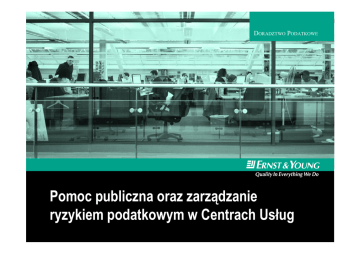 DORADZTWO PODATKOWE Pomoc publiczna oraz zarządzanie ryzykiem podatkowym w Centrach Usług Zakres usług prowadzonych przez Centra Usługi „Call Centre” § wsparcie i doradztwo techniczne § obsługa klienta § serwis posprzedażny § biura informacyjne § biura wsparcia sprzedaży § marketing 2 Centra Usług Administracyjnych Centra informatyczne oraz R&D § finanse § tworzenie oprogramowania § księgowość § testowanie aplikacji § zasoby ludzkie § opracowanie i wdrażanie aplikacji § badania i rozwój § zaplecze biurowoadministracyjne dla działalności bankowej i ubezpieczeniowej Pomoc publiczna 3 Mapa pomocy regionalnej – plan na lata 2007 - 2013 4 Maksymalne wsparcie Lokalizacja 30% mazowieckie 40% pomorskie zachodniopomorskie dolnośląskie wielkopolskie śląskie 50% reszta Specjalne strefy ekonomiczne 5 Specjalne Strefy Ekonomiczne (SSE) n Możliwe korzyści n Zwolnienie z podatku CIT: – nowe inwestycje – nawet do 50% nakładów inwestycyjnych (zakup gruntów, budynków i środków trwałych), lub – tworzenie miejsc pracy – nawet do 50% dwuletnich kosztów zatrudnienia – pod uwagę brane są wyższe z tych dwóch grup kosztów n Warunki finansowania – zezwolenie na prowadzenie działalności gospodarczej na terenie SSE – zezwolenie jest wydawane po przeprowadzeniu negocjacji z władzami SSE i oparte jest na procedurze przetargowej 6 Rodzaje działalności usługowych na terenie SSE Usługi rachunkowości i kontroli ksiąg (PKWiU 74.12.1) n Usługi w zakresie księgowości (PKWiU 74.12.2) n Usługi centrów telefonicznych (PKWiU 74.86) n Usługi informatyczne (PKWiU 72) n Usługi w zakresie badań i analiz technicznych (PKWiU 74.3) n Usługi badawczo – rozwojowe w dziedzinie nauk przyrodniczych i technicznych (PKWiU 73.1) UWAGA! n Nie obejmuje usług doradztwa podatkowego i sporządzania deklaracji podatkowych n Nie obejmuje sprzedaży detalicznej pakietów oprogramowania n Nie obejmuje działań doświadczalno – rozwojowych związanych z obronnością n 7 Finansowe wspieranie inwestycji * n Zakres dostępnych projektów – Inwestycje są rozumiane jako w w n tworzenie nowych lub poszerzanie działalności istniejących przedsiębiorstw rozpoczęcie działań polegających, w dużej mierze, na zmianach wydajności produkcji, procesu wytwarzania, zmianie produkowanych towarów lub usług Maksymalne wsparcie - % kosztów kwalifikowanych – 25% (połowa wielkości pomocy regionalnej) – n 4 000 EUR na każde nowe miejsce pracy Terminy i warunki – wniosek: Ministerstwo Gospodarki – kolejne terminy: w nowym okresie budżetowym 2007-2013 – przewidywany czas trwania postępowania: 4 miesiące *na podstawie dotychczasowych przepisów 8 Zarządzanie ryzykiem podatkowym w centrach usług księgowych 9 Funkcje standardowo włączane w centrum usług • rozliczenia z kontrahentami FINANSE HR IT Inne 10 • rozliczenia z pracownikami • sprawozdawczość i raportowanie • podatki • rozliczenia środków trwałych • rozliczenia gotówkowe i zarządzanie płynnością • budżetowanie • obsługa zakupów Podatki w centrach usług księgowych - główne wyzwania n n n n n n 11 Niejasny podział zadań pomiędzy centrum i klienta Nieefektywna komunikacja pomiędzy centrum i klientem Brak jasnych i skutecznych procedur podatkowych Niewykorzystane możliwości systemów informatycznych Brak doświadczonej kadry i jej rotacja Określenie i rozliczanie kryteriów sukcesu Podatki w centrach usług – identyfikacja głównych funkcji i procesów 0% •• Dążenie Dążenie do do maksymalizacji maksymalizacji efektywności efektywności przetwarzania przetwarzania danych danych kreuje kreuje ryzyko ryzyko podatkowe podatkowe •• W W pierwszej pierwszej kolejności kolejności powinny powinny zostać zostać zidentyfikowane zidentyfikowane funkcje funkcje ii procesy, procesy, które będą które będą obsługiwane obsługiwane przez przez centrum centrum •• Większość Większość zz takich takich procesów procesów wpływa wpływa na na rozliczenia rozliczenia podatkowe podatkowe klienta klienta Krytyczne dla podatków funkcje CUK 12 20% 40% 60% 80% 100% AP Księgowość Rozliczenia w grupie AR Rozliczanie delegacji Środki trwałe Zarządzanie gotówką Ściąganie należności Zapasy Kredyty Sprawozdawczość podatkowa Fakturowanie Payroll Wysyłki towarów Księgowanie zamówień 2005 2004 Źródło: The Hackett Group – European Finance SSO Study, 2005 Źródła i skutki ryzyk podatkowych Przyczyna Ø niejasny podział obowiązków i zadań pomiędzy centrum usług i klientem Ø nieterminowy przepływ informacji i dokumentów Ø brak monitorowania zmian w przepisach i interpretacjach podatkowych Ø Ø 13 braki w kompetencjach personelu oraz nieefektywna polityka szkoleniowa system oceny efektywności pracowników centrum Skutek Øpodejmowanie decyzji co do traktowania podatkowego w oparciu o niekompletne informacje Økonieczność korekt deklaracji Ønieefektywność podatkowa Ø braki w wiedzy podatkowej powodujące ryzyko popełniania błędu w zakresie rozliczeń transakcji Ø automatyzm działania - brak „czujności” dla transakcji sporadycznych i nietypowych Obszary zarządzania ryzykiem podatkowym ProcessTitle: 2RemittancesbetweenCHDandPOL Inputs: Annual branchcashforecasts Purpose: Toensureoptimal level ofsupplyof Key Physical Cash Electronic Cash Start/end of process P E Outputs: Weekly cashholdingreturn notesandcoinstoPOcountersand minimise overnight cashholdingat POL. Start: Annual branchcashforecasts End: Reconciledremittancesbetweenbranches&CC's Departments POL Branch Timeline 10.30am Daily Cash position assessment 5.00pm I Surplus/ Deficit Yes Note: When abranch InformCCof isinsurplus,theCC Surplus/ may not alwayscollect Deficit unlesssignificant No Cash Centre Despatch/ collect Standard Remittance I Start Inventory Management (Retail-CHD) I Amend Operational Plan to meet needs 14 Process Input/ output Documentused 