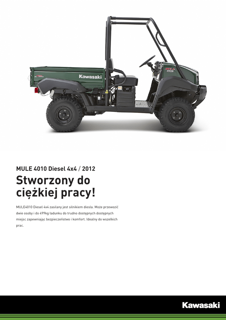 MULE 4010 Diesel 4x4 / 2012 Stworzony do ciężkiej pracy! MULE4010 Diesel 4x4 zasilany jest silnikiem diesla. Może przewozić dwie osoby i do 499kg ładunku do trudno dostępnych dostępnych miejsc zapewniając bezpieczeństwo i komfort. Idealny do wszelkich prac. 53 800 PLN Opis MULE 4010 Diesel 4x4 / 2012 Szczelne schowki Moment obrotowy i oszczędność Blokada dyferencjału Wybór napędu 2WD/4WD Oprzyrządowanie Czyste i chłodne powietrze Więcej Wytrzymałość i komfort więcej informacji na: www.kawasaki.pl/DieselMULE © 2012 Kawasaki Motors Europe N.V. Akcesoria Podpora przedniej szyby. MULE 4010 Diesel 4x4 / 2012 Wykładzina skrzyni ładunkowej Kabina już od Więcej akcesoriów Dach MULE 4010 i zestaw montażowy Szyba przednia MULE 4010 Drzwi do MULE 4010, zestaw montażowy System ogrzewania Wyciągarka (Warn 3000lb/1360kg) Wyciągarka (Warn 2500Lb/1134kg) już od Płyta montażowa do wyciągarki Zaczep - kula (50mm) Gumowa wykładzina podłogowa Rolki prowadzące Oświetlenie robocze, przód Światło robocze, tył Wycieraczka przedniej szyby. Światło ostrzegawcze więcej informacji na: www.kawasaki.pl/DieselMULE © 2012 Kawasaki Motors Europe N.V. Specyfikacja MULE 4010 Diesel 4x4 / 2012 Silnik Typ silnika Chłodzony cieczą, trzycylindrowy OHV Diesel, 4-suwowy Pojemność silnika 953cm3 Układ zasilania Wtrysk typu Denso VE Przeniesienie napędu Układ przeniesienia napędu 2-biegowy automat plus bieg wsteczny, napęd na 4 koła Przełożenie napędu Przedni dyferencjał o ograniczonym uślizgu, tylny dyferencjał pracujący w dwóch trybach Rama Skok przedniego zawieszenia 100mm Skok tylnego zawieszenia 70mm Opony, przód 23 x 11-10 (bezdętkowe) Opony, tył 23 x 11-10 (bezdętkowe) Zawieszenie Przednie zawieszenie Niezależna kolumna MacPhersona Tylne zawieszenie Pół-niezależne, oś De Dion Hamulce Hamulce przednie Podwójne bębny hydrauliczne Hamulce tylne Podwójne bębny hydrauliczne Wymiary Wymiary (D x S x W) 3,005 x 1,575 x 1,925mm Rozstaw osi 1,870mm Prześwit 175mm Pojemność zbiornika paliwa 24,2 l Masa pojazdu gotowego do użytku 788 kg Osiągi Moc maksymalna 17.7 kW [24 KM]/3,600rpm Maksymalny moment obrotowy 52 N·m [5.3 Kgf·m]/2,800rpm więcej informacji na: www.kawasaki.pl/DieselMULE © 2012 Kawasaki Motors Europe N.V.