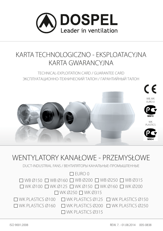 KARTA TECHNOLOGICZNO - EKSPLOATACYJNA KARTA GWARANCYJNA TECHNICAL-EXPLOITATION CARD / GUARANTEE CARD ЭКСПЛУАТАЦИОННО-ТЕХНИЧЕСКИЙ ТАЛОН / ГАРАНТИЙНЫЙ ТАЛОН WB, WK EURO 0 WK PLASTICS WENTYLATORY KANAŁOWE - PRZEMYSŁOWE DUCT-INDUSTRIAL FANS / ВЕНТИЛЯТОРЫ КАНАЛЬНЫЕ-ПРОМЫШЛЕННЫЕ EURO 0 WB Ø200 WB Ø250 WB Ø315 WB Ø160 WK Ø150 WK Ø200 WK Ø125 WK Ø160 WK Ø250 WK Ø315 WK PLASTICS Ø100 WK PLASTICS Ø125 WK PLASTICS Ø150 WK PLASTICS Ø160 WK PLASTICS Ø200 WK PLASTICS Ø250 WK PLASTICS Ø315 WB Ø150 WK Ø100 ISO 9001:2008 REW. 7. - 01.08.2014 005-0838 PL Opis urządzenia i instalacja - obudowy wykonanej z blachy ocynkowanej lub ocynkowanej malowanej proszkowo odpornej na korozję i uszkodzenia mechaniczne, Statyczne i dynamiczne wyważenie turbiny gwarantuje niezawodną trwałość wentylatora. Dziękujemy Państwu za zakup naszego produktu. Wyrażamy przekonanie, że spełni on wszelkie Państwa oczekiwania. Życzymy bezawaryjnej eksploatacji i zadowolenia z dokonanego wyboru. Zachęcamy też do podzielenia się z nami wszystkimi uwagami, jakie mają Państwo, na temat wyrobu i naszej firmy. Na Państwa komentarze czekamy pod numerem telefonu: +48 (34) 365 98 43. Można też kierować je do nas drogą elektroniczną na adres: [email protected]. Firma DOSPEL - Lider Wentylacji pragnie zaprezentować Państwu rodzinę wentylatorów kanałowych-przemysłowych. Są to wentylatory promieniowe - EURO 0, WK, WK Plastics oraz wentylatory osiowe WB. Instalacja: Typ: EURO 0, WK, WK Plastics, WB - pomiędzy kanałami wentylacyjnymi (WB, WK, WK Plastics, Euro 0), - bezpośrednio w ścianie budynku - część kanału (WB). Po rozpakowaniu wentylatora należy sprawdzić: - trwałość połączeń w puszce przyłączeniowej, - stan obudowy wentylatora (wgniecenia, zniekształcenia), - turbina nie powinna ocierać się o obudowę (EURO 0, WK, WK Plastics), - śmigło nie powinno ocierać się o tunel (WB), - dane techniczne na tabliczce znamionowej powinny odpowiadać parametrom instalacji elektrycznej. Zastosowanie: Wentylatory są stosowane w wentylacji nawiewno-wywiewnej. Stosować je można zarówno w pomieszczeniach użyteczności publicznej (sklepy, restauracje, bary), pomieszczeniach sanitarnych, jak i w lokalach mieszkalnych oraz obiektach przemysłowych (hale, magazyny, warsztaty, garaże). Do wentylatorów EURO 0, WK, WK Plastics można podłączyć regulator obrotów RN/RP. Zaleca się dokonania powyższych czynności ze względu na ewentualne uszkodzenia powstałe podczas transportu. Jeżeli nie stwierdzono wyżej wymienionych usterek można przystąpić do instalacji wentylatora w miejscu docelowym: - przygotować przyłącza elektryczne pod wentylator, - umocować wentylator w kanale wentylacyjnym, - nałożyć kanały z dwóch stron na obudowę, - ścisnąć elastyczne kanały przy użyciu opaski zaciskowej i wkrętaka (tak aby opaska znalazła się w wytłoczeniach w obudowie) (WB), - dokręcić wkręty, - podłączenie do instalacji elektrycznej musi być wykonane przez wykwalifikowany personel z uprawnieniami! Budowa: EURO 0 składa się z: - silnika indukcyjnego jednofazowego z kondensatorem rozruchowym o klasie szczelności IP X4, przystosowanego do pracy ciągłej S-1, charakteryzującego się cichą pracą w stosunku do wydajności, łopatki zakrzywione do tyłu, - typ łożyska: kulkowe, - obudowy wykonanej z tworzywa ABS, odpornego na korozję i uszkodzenia mechaniczne. WB składa się z: - silnika indukcyjnego asynchronicznego jednofazowego, przystosowanego do pracy ciągłej S-1, charakteryzującego się cichą pracą w stosunku do wydajności, - śmigła aluminiowego, profilowanego, - typ łożyska: ślizgowe, - obudowy wykonanej z blachy ocynkowanej, odpornej na korozję i uszkodzenia mechaniczne, przystosowanej do montażu kanałowego. Eksploatacja: Wentylatory EURO 0, WK, WK Plastics, WB nie wymagają częstych i szczegółowych przeglądów*, nie rzadziej jednak niż raz do roku. Przystosowane są do pracy ciągłej. * W zależności od warunków panujących w miejscu pracy wentylatora. Konserwacja: W celu usunięcia zanieczyszczeń z wnętrza wentylatora należy: - odłączyć wentylator od sieci elektrycznej, - zdemontować wentylator odkręcając wkręty mocujące, - umyć wszystkie detale wilgotną szmatką z małą ilością detergentu, uważając aby nie zamoczyć silnika, - dokładnie wytrzeć szmatką do sucha wszystkie elementy wentylatora, - zamocować wentylator w miejscu docelowym, - podłączyć wentylator do sieci. WK Plastics składa się z: - silnika indukcyjnego jednofazowego z kondensatorem rozruchowym o klasie szczelności IP X4, przystosowanego do pracy ciągłej S-1, charakteryzującego się cichą pracą w stosunku do wydajności, łopatki zakrzywione do tyłu, - obudowy wykonanej z polipropylenu odpornego na korozję i uszkodzenia mechaniczne, - typ łożyska: kulkowe, - statyczne i dynamiczne wyważone turbiny gwarantujące niezawodną trwałość wentylatora. Przeglądu powinna dokonywać osoba do tego uprawiona, z odpowiednimi kwalifikacjami. Sprawdzić należy: opór izolacji i uzwojenia, opór uziemienia, stan łożysk. WK składa się z: - silnika indukcyjnego jednofazowego z kondensatorem rozruchowym o klasie szczelności IP X4, przystosowanego do pracy ciągłej S-1, charakteryzującego się cichą pracą w stosunku do wydajności, łopatki zakrzywione do tyłu, - typ łożyska: kulkowe, 2 PL Warunki gwarancji Zakres i zasięg terytorialny gwarancji: Firma DOSPEL zapewnia sprawne działanie urządzenia zgodnie z warunkami techniczno - eksploatacyjnymi dołączonymi do gwarancji. Gwarancją objęte są wady montażowe oraz wady materiałowe urządzeń. Niniejsza gwarancja obowiązuje na terytorium Rzeczypospolitej Polskiej. Reklamowany produkt powinien: - być dostarczony do specjalist ycznego, autoryzowanego serwisu - preferowanego przez firmę DOSPEL, konsulta