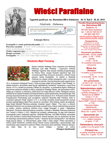 Wieści Parafialne Tygodnik parafii pw. św. Stanisława BM w Sobikowie Nr 13 Rok II 29. 03. 2015 Niedziela Palmowa Parafia Rzymskokatolicka św. Stanisława BM Sobików 15 05-530 Góra Kalwaria tel. + 48 22 726 83 27 +48 884 062 057 parafia.sobikow @gmail.com www.sobikow.parafia. info.pl Liturgia Słowa Duszpasterze: Ewangelia w czasie poświęcenia palm: Mk 11,1-10 (Wjazd do Jerozolimy) Pierwsze czytanie: Iz 50,4-7 (Nie zasłoniłem mojej twarzy przed zniewagami i wiem, że nie doznam wstydu) Psalm responsoryjny: Ps 22,8-9.17-18a.19-20.23-24 Drugie czytanie: Flp 2,6-11 (Chrystus uniżył samego siebie…) Ewangelia: Mk 14,1-15,47 (Opis Męki Pańskiej) Niedziela Męki Pańskiej Szósta niedziela Wielkiego Postu nazywana jest Niedzielą Palmową, czyli Męki Pańskiej, i rozpoczyna obchody Wielkiego Tygodnia. Była zawsze niedzielą przygotowującą do Paschy Pana. Liturgia Kościoła wspomina tego dnia uroczysty wjazd Pana Jezusa do Jerozolimy, o którym mówią wszyscy czterej Ewangeliści. To właśnie w Niedzielę Palmową ma miejsce obrzęd poświęcenia palm i uroczysta procesja do kościoła. Zwyczaj święcenia palm pojawił się ok. VII w. na terenach dzisiejszej Francji. Z kolei procesja wzięła swój początek z Ziemi Świętej. To właśnie Kościół w Jerozolimie starał się jak najdokładniej "powtarzać" wydarzenia z życia Pana Jezusa. W IV w. istniała już procesja z Betanii do Jerozolimy, co poświadcza Egeria. Według jej wspomnień patriarcha wsiadał na oślicę i wjeżdżał do Świętego Miasta, zaś zgromadzeni wierni, witając go w radości i w uniesieniu, ścielili przed nim swoje płaszcze i palmy. Następnie wszyscy udawali się do bazyliki Anastasis (Zmartwychwstania), gdzie sprawowano uroczystą liturgię. Owa procesja rozpowszechniła się w całym Kościele mniej więcej do XI w. W Rzymie szósta niedziela Przygotowania Paschalnego była początkowo wyłącznie Niedzielą Męki Pańskiej, kiedy to uroczyście śpiewano Pasję. Dopiero w IX w. do liturgii rzymskiej wszedł jerozolimski zwyczaj procesji upamiętniającej wjazd Pana Jezusa do Jerusalem. Obie tradycje szybko się połączyły, dając liturgii Niedzieli Palmowej podwójny charakter (wjazd i Męka) . Przy czym, w różnych Kościołach lokalnych owe procesje przyjmowały rozmaite formy: biskup szedł piechotą lub jechał na osiołku, niesiono ozdobiony palmami krzyż, księgę Ewangelii, a nawet i Najświętszy Sakrament. Pierwszą udokumentowaną wzmiankę o procesji w Niedzielę Palmową przekazuje nam Teodulf z Orleanu (+ 821). Niektóre też przekazy zaświadczają, że tego dnia biskupom przysługiwało prawo uwalniania więźniów. Niedziela Palmowa, czyli Męki Pańskiej, wprowadza nas coraz bardziej w nastrój Świąt Paschalnych. Kościół zachęca, aby nie ograniczać się tylko do radosnego wymachiwania palmami i krzyku: " Hosanna Synowi Dawidowemu!", ale wskazuje drogę jeszcze dalszą - ku Wieczernikowi, gdzie "chleb z nieba zstąpił". Potem wprowadza w ciemny ogród Getsemani, pozwala odczuć dramat Jezusa uwięzionego i opuszczonego, daje zasmakować Jego cierpienie w pretorium Piłata i odrzucenie przez człowieka. Wreszcie zachęca, aby pójść dalej, aż na sam szczyt Golgoty i wytrwać do końca. /Grzegorz Gęsikowski/ Proboszcz: ks. prałat Włodzimierz Czerwiński Wikariusz: ks. Mariusz Białęcki Pomoc duszpasterska: Ks. prof. Cezary Smuniewski Kancelaria parafialna: poniedziałek - środy, piątek godz. 17.00 – 19.00 sobota 14.00 – 16.00 W czwartek kancelaria nieczynna Msze św. Niedziela * w kaplicy w Czachówku: 8.30 * w kościele: 10.00, 12.00, 13.15 Dni powszednie 18.00(17.00 –1X-1IV) W czwartki o godz. 7.30 Nabożeństwa stałe: *Godzinki o NP NMP – I sobota miesiąca o 7.10 *Nowenna do MBNP środa o 17.30 *Nabożeństwo do Niep. Serca NMP I sobota miesiąca o 7.30 *Adoracja Najśw. Sakramentu: - I niedziela miesiąca po Mszy św. o godz. 10.00 Spowiedź św. - podczas każdej Mszy św. - w 1. piątek miesiąca od godz. 17.00 Odwiedziny chorych 1. piątek m-ca od godz. 9.30 Chrzest św. w każdą niedzielę podczas Mszy św. o godz. 12.00 Wielki Post na nowo odkrywany (6) Wielki Post powoli zbliża się ku końcowi. Przypomina nam o tym V Niedziela Wielkiego Postu, zwana Niedzielą Pasyjną. Za tydzień Niedziela Palmowa, wraz z doroczną procesją z palmami i przejmującym opisem Męki Pańskiej, którą rozpoczniemy obchody Wielkiego Tygodnia. Niedziela Palmowa to niedziela szczególna w roku liturgicznym, ale i chyba nieco dziwna w swojej liturgicznej formie. Bo oto z jednej strony wspomina się uroczysty wjazd do Jerozolimy i tryumf Chrystusa, przed którym rzucano gałązki palmowe (stąd nazwa: Niedziela Palmowa), a z drugiej strony niedzielę tę nazywa się Niedzielą Męki Pańskiej i śpiewa się Pasję, opis męki i śmierci naszego Zbawiciela. Czy więc oficjalna nazwa VI Niedzieli Wielkiego Postu "Niedziela Palmowa, czyli Męki Pańskiej" nie jest już sama w sobie sprzeczna? Czy oba te aspekty uroczystości nie wykluczają się nawzajem? Oczywiście, że nie. Podwójny charakter Niedzieli Palmowej wynika z faktu, że ukształtowały ją dwie tradycje: jerozolimska i rzymska. Początków uroczystego świętowania Niedzieli Palmowej trzeba szukać w Jerozolimie w IV w., a może nawet jeszcze wcześniej, kiedy starano się możliwie jak najdokładniej "odtwarzać" sceny z ziemskiego życia Pana Jezusa w tych miejscach, gdzie historycznie się one wydarzyły. Egeria w swoim dzienniku podróży do Ziemi Świętej opisuje, że w Kościele Jerozolimskim w sobotę wieczorem (a więc w wigilię Niedzieli Palmowej) odbywała się procesja z Betanii do Jerozolimy, do bazyliki Anastasis. Procesja ta miała charakter radosnego powitania Chrystusa, z udziałem dzieci i ich śpiewami. Z Jerozolimy procesja rozprzestrzeniła się na cały Wschód chrześcijański, gdzie zaczęto do niej wprowadzać różne elementy dramatyzujące. I tak w Egipcie niesio