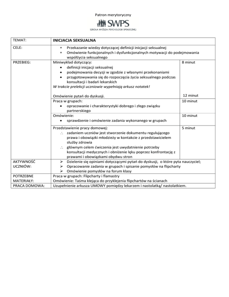 Patron merytoryczny TEMAT: CELE: PRZEBIEG: INICJACJA SEKSUALNA Przekazanie wiedzy dotyczącej definicji inicjacji seksualnej Omówienie funkcjonalnych i dysfunkcjonalnych motywacji do podejmowania współżycia seksualnego Miniwykład dotyczący: 8 minut definicji inicjacji seksualnej podejmowania decyzji w zgodzie z własnymi przekonaniami przygotowywania się do rozpoczęcia życia seksualnego podczas konsultacji i badań lekarskich W trakcie prelekcji uczniowie wypełniają arkusz notatek! Omówienie pytań do dyskusji. Praca w grupach: opracowanie i charakterystyki dobrego i złego związku partnerskiego Omówienie: sprawdzenie i omówienie zadania wykonanego w grupach AKTYWNOŚĆ UCZNIÓW: POTRZEBNE MATERIAŁY: PRACA DOMOWA: 12 minut 10 minut 10 minut Przedstawienie pracy domowej: 5 minut zadaniem uczniów jest stworzenie dokumentu regulującego prawa i obowiązki młodzieży w kontakcie z przedstawicielem służby zdrowia głównym celem ćwiczenia jest uwydatnienie potrzeby konsultacji medycznych i obniżenie lęku poprzez konfrontację z prawami i obowiązkami obydwu stron Dzielenie się opiniami dotyczącymi pytań do dyskusji, o które pyta nauczyciel; Opracowanie zadania w grupach i spisanie pomysłów na flipcharty Omówienie pomysłów na forum klasy Praca w grupach: Flipcharty i flamastry Omówienie: Taśma klejąca do przyklejenia flipchartów na ścianach Uzupełnienie arkusza UMOWY pomiędzy lekarzem i nastolatką/ nastolatkiem. Patron merytoryczny M I N I W Y K Ł A D I. INICJACJA SEKSUALNA – DEFINICJA Inicjacja seksualna to pierwszy stosunek płciowy, któremu zazwyczaj towarzyszy przerwanie błony dziewiczej u kobiety. Inicjacja seksualna najczęściej poprzedzona jest innymi zachowaniami seksualnymi – najpierw masturbacją (która służy rozładowaniu popędu seksualnego, pojawiającego się w okresie dojrzewania w wyniku zmian hormonalnych i poznaniu swojego ciała i jego reakcji), snami o tematyce seksualnej, a później zachowaniami z partnerem: pocałunkami, uściskami, pettingiem. Seksuolodzy mówią, że inicjacja seksualna „oznacza zgodę na fizyczną bliskość z drugim człowiekiem, posuniętą aż do największej intymności” (zdanie to można napisać na tablicy przed rozpoczęciem miniwykładu). Z tego powodu jest jednym z najbardziej znaczących wydarzeń w życiu każdego człowieka. Nieudana inicjacja seksualna może być wynikiem szeregu sytuacji, np.: zbyt małej wiedzy na temat erotyki i seksualności człowieka; podjęciem decyzji o inicjacji seksualnej z niewłaściwych powodów, nie będąc jeszcze na to gotowym. Doświadczenia, jakie partnerzy wynoszą z inicjacji seksualnej wpływają na ich późniejsze życie seksualne i wzajemną relację oraz ewentualne kolejne związki. II. INICJACJA JEST TYLKO RAZ. NAJWAŻNIEJSZA JEST WIERNOŚĆ SOBIE Młode osoby często podejmują decyzję o rozpoczęciu współżycia z niewłaściwych powodów, m.in. presji otoczenia, chęci dołączenia do jakiejś ważnej dla siebie grupy rówieśników, chcąc dać partnerowi „dowód miłości. Będziemy dziś rozmawiać o tych powodach. Seksuolodzy i psycholodzy mówią też, że nastolatki często żałują swoich decyzji dotyczących rozpoczynania współżycia. Będę Was prosić o zapisywanie ważnych zdań dotyczących inicjacji seksualnej na karcie notatek. Zapiszcie teraz pierwsze zdanie: Inicjację seksualną przeżywa się raz. Nie da się tego doświadczenia powtórzyć i poprawić – warto czekać na NAJLEPSZY moment. Patron merytoryczny III. INICJACJA SEKSUALNA ZACZYNA SIĘ W GABINECIE LEKARSKIM Seks często kojarzy się z aktywnością spontaniczną, niezaplanowaną, wynikającą z chwilowego uniesienia. Gdy kochamy i chcemy być blisko, moment rozpoczęcia współżycia przychodzi czasem niezaplanowany, czasem ma miejsce pod wpływem chwili lub w wyniku rozluźnienia po zażyciu alkoholu. Tym bardziej, warto pamiętać, że inicjacja seksualna może nieść za sobą szereg konsekwencji mogących mieć wpływ na nasze emocje i ZDROWIE. Na szczęście większość osób mile wspomina pierwsze kontakty erotyczne i choć pełną przyjemność z seksu ludzie zazwyczaj uczą się czerpać wraz z czasem i nabieraniem doświadczenia, na długo zapamiętują ten „pierwszy raz”. Trzeba jednak pamiętać o tym, że pierwszy stosunek seksualny (i każdy kolejny też!) może skończyć się niepowodzeniem, rozczarowaniem, a także ciążą lub zakażeniem się chorobą przenoszoną drogą płciową, przed którymi można i warto się zabezpieczyć. Każdy człowiek – kobieta i mężczyzna mają prawo zaplanować swoją inicjację seksualną i odbyć ją w najlepszym dla siebie momencie! Patron merytoryczny Pytania do dyskusji (nauczyciel powinien najpierw wysłuchać opinii uczniów, a potem powiedzieć jak jest naprawdę i dlaczego): Co wpływa na chęć podjęcia współżycia seksualnego wśród młodzieży? o Nauczyciel: Potrzeba biologiczna- związana z silnym napięciem seksualnym Fascynacja drugą osobą, pożądanie Presja otoczenia Ciekawość, chęć przeżycia czegoś nowego, ekscytującego o Nauczyciel mówi: „Ludzie decydują się inicjować seksualnie i uprawiać seks z wielu powodów – żeby czuć bliskość z partnerem, żeby doświadczyć fizycznej przyjemności. Jest też wiele powodów, dla których ludzie decydują się nie uprawiać seksu – bo mają takie przekonania religijne, bo nie czują się jeszcze gotowi, albo czują, że nie znaleźli jeszcze właściwej osoby. To jest zawsze Wasza DECYZJA – uprawiać seks czy nie – za pierwszym razem i za każdym razem” o Uczniowie zapisują zdanie 2 i 3 na Karcie Notatek. Jakie pytania warto zadać SOBIE przed rozpoczęciem współżycia? o Nauczyciel: Czy jestem w zdrowym związku, czuję się szanowany/a i ufam partnerowi/partnerce? Czy czuję, że w moim związku jest dobra komunikacja i mogę rozmawiać z moim partnerem o swoich obawach? Czy decyzja o inicjacji seksu