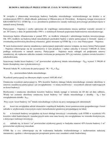 BUDOWA MIESZKAŃ PRZEZ OTBS SP. Z O.O. W NOWEJ FORMULE W związku z planowaną inwestycją budowy budynku mieszkalnego wielorodzinnego na działce o nr ewidencyjnym 4991/2, obręb olkuski, położonej w Olkuszu przy ul. Dworskiej – Kolejowej, księga wieczysta nr KR1O/00076373/2. OTBS Sp. z o.o. przedstawia podstawowe zasady realizacji powyższego przedsięwzięcia w ramach nowej formuły. Partycypant – Najemca i osoby zgłoszone do wspólnego zamieszkania muszą spełniać warunki zawarte w art. 30 Ustawy z dnia 26 października 1995 r. o niektórych formach popierania budownictwa mieszkaniowego. Inwestycja będzie sfinansowana w ponad 50% ze środków własnych i udzielonego kredytu inwestycyjnego. Ok. 50% środków na budowę lokali mieszkalnych pochodzić będzie z umów partycypacji w formule najmu z ewentualną możliwością docelowej własności, gdzie stronami są OTBS Sp. z o.o. oraz Partycypant – Najemca. W razie konieczności umowę zasadniczą o partycypacji poprzedzi umowa wstępna, na mocy której Partycypant – Najemca zobowiązuje się do uczestnictwa w tym projekcie i wpłaci zaliczkę w kwocie 5 000,00 zł, która podlega rozliczeniu w ramach umowy. Partycypant – Najemca może odstąpić od podpisania umowy zasadniczej, ale wpłacona zaliczka zostanie zwrócona po potrąceniu 20% jej wartości, tytułem zwrotu kosztów i odszkodowania. Szacowany średni koszt budowy 1 m2 powierzchni użytkowej lokalu mieszkalnego - ŚKB wynosi 3 390,00 zł brutto (kompletny stan wykończeniowy). Wartość lokalu W1 wyliczona do partycypacji: Wl = Pm x ŚKB Pm – powierzchnia lokalu mieszkalnego. Wysokość partycypacji na obecnym etapie wynosi 1695,00 zł/m2. Ostateczna wysokość partycypacji tj. 50% kosztów budowy danego lokalu mieszkalnego zostanie określona w umowie zasadniczej partycypacji ( po uwzględnieniu - w miarę możliwości – wszystkich zdarzeń wpływających na koszt budowy). Rozliczenie i ostateczne określenie kosztów budowy lokalu nastąpi w terminie do 60 dni od daty odbioru. Wtedy też zostanie określony ostateczny koszt budowy 1m2 lokalu mieszkalnego z działką – kbl i bez uwzględnienia działki– kbm. Przy czym koszt budowy 1m2 lokalu mieszkalnego wylicza się przy następujących założeniach: a) koszt ten uwzględnia udział elementów wspólnych budynku, koszt pomieszczenia gospodarczego i koszt udziału w użytkowaniu wieczystym części nieruchomości gruntowej przypadającej na lokal, b) w kosztach budowy uwzględnia się koszt obsługi inwestycji i ewentualny zysk OTBS w wysokości 4% kosztów robót budowlanych i instalacyjnych netto oraz inne koszty nie uwzględniane we wniosku kredytowym, a dotyczące realizacji inwestycji, c) zakłada się, że koszt 1 m2 powierzchni użytkowej garaży w budynku stanowi 45% kosztu budowy 1 m2 powierzchni użytkowej mieszkań. OTBS Sp. z o.o. zobowiązuje się do wykonania budynku wielorodzinnego z zachowaniem należytej staranności, zgodnie z obowiązującymi przepisami prawa oraz zasadami sztuki budowlanej. Wysokość czynszu określi uchwała Walnego Zgromadzenia Wspólników zgodnie z obowiązującymi przepisami. Podpisanie umowy najmu będzie poprzedzone wpłatą kaucji zabezpieczającej w wysokości 12krotności czynszu oraz złożeniem notarialnego oświadczenia o dobrowolnym poddaniu się egzekucji, eksmisji z lokalu w przypadku nieuregulowania czynszu i innych opłat za lokal powyżej 3 miesięcy. Szacowana wysokość czynszu w chwili oddania do użytku budynku, to 11,00 zł/m2 i w prawie 70 % przeznaczona jest na spłatę raty kredytowej (wykup obligacji). Rozwiązanie umowy najmu mieszkania przez Partycypanta-Najemcę może nastąpić nie wcześniej niż po upływie 12 miesięcy od momentu jej zawarcia. Wtedy to OTBS Sp. z o.o. dokona zwrotu partycypacji w wysokości K1 = Pm x k x Wod1 , gdzie: Pm - powierzchnia lokalu mieszkalnego, k – ostateczny współczynnik procentowy jaki stanowiła kwota partycypacji przypadająca za 1 m 2 lokalu w chwili oddania go do użytku, do obowiązującego wtedy wskaźnika przeliczeniowego kosztu odtworzenia 1m2 powierzchni użytkowej budynków mieszkalnych dla miasta Krakowa oraz województwa małopolskiego, z wyłączeniem miasta Krakowa - Wod, Wod1 - wartość wskaźnika przeliczeniowego kosztu odtworzenia 1m2 powierzchni użytkowej budynków mieszkalnych dla miasta Krakowa oraz województwa małopolskiego, z wyłączeniem miasta Krakowa w chwili rezygnacji z lokalu mieszkalnego. Zwrot partycypacji w wysokości K1 nastąpi z dniem podpisania umowy z kolejnym Partycypantem – Najemcą, nie później jednak niż 12 miesięcy od dnia opuszczenia lokalu. Jeżeli rozwiązanie umowy partycypacji nastąpi w okresie do zasiedlenia, kwota partycypacji pomniejszona o karę umowną 5% zostanie zwrócona w ciągu 14 dni od rozwiązania umowy partycypacji. OTBS Sp. z o.o. zobowiąże się na wniosek Partycypanta-Najemcy do wyodrębnienia i ustanowienia odrębnej własności lokalu mieszkalnego w stanie wolnym od obciążeń i przeniesienie własności (zbycie) aktem notarialnym na jego rzecz, jednak nie wcześniej niż z upływem 5 lat od dnia uzyskania pozwolenia na użytkowanie budynku, po spełnieniu następujących warunków: a) uregulowaniu wszystkich zobowiązań wynikających z umowy najmu, b) zapłaty za przedmiot najmu na rzecz OTBS Sp. z o.o. kwoty (ceny) za lokal i udział w nieruchomości wspólnej budowlanej oraz udział w wieczystym użytkowaniu (lub własności) w odpowiadającej mu części nieruchomości gruntowej, kwoty wyliczonej według poniższego wzoru: Cm = (kb x Pm x kbm + Kd) x a + Km + Wd gdzie: Cm – Cena lokalu mieszkalnego brutto (łącznie), kb = (1-Uk) x Wodb/ Wod , gdzie : Uk - współczynnik procentowy jaki stanowiła kwota kredytu (obligacji) w koszcie budowy lokali mieszkalnych, Wod – wartość wskaźnika przeliczeniowego kosztu odtworzenia 1m 2 powierzchni użytkowej budynków mieszkalnych dla miasta Krakowa oraz województ