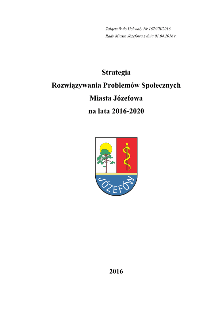 Załącznik do Uchwały Nr 167/VII/2016 Rady Miasta Józefowa z dnia 01.04.2016 r. Strategia Rozwiązywania Problemów Społecznych Miasta Józefowa na lata 2016-2020 2016 Strategia Rozwiązywania Problemów Społecznych Miasta Józefowa na lata 2016-2020 SPIS TREŚCI WSTĘP ………………………………………………………………………………………………..3 I. CZĘŚĆ WPROWADZAJĄCA............................................................................................ 4 1. STRUKTURA STRATEGII................................................................................................... 4 2. UWARUNKOWANIA ZEWNĘTRZNE TWORZENIA STRATEGII ................................. 5 II. CZĘŚĆ ANALITYCZNO-DIAGNOSTYCZNA............................................................ 16 1. CHARAKTERYSTYKA MIASTA...................................................................................... 16 2. DEMOGRAFIA.................................................................................................................... 17 3. INFRASTRUKTURA TECHNICZNA …………………………………………………...19 4. KOMUNIKACJA I TRANSPORT....................................................................................... 20 5. GOSPODARKA ................................................................................................................... 20 6. ZASOBY I WARUNKI MIESZKANIOWE ........................................................................ 21 7. EDUKACJA I KULTURA ................................................................................................... 22 8. OCHRONA ZDROWIA....................................................................................................... 25 9. SPORT, REKREACJA I TURYSTYKA.............................................................................. 28 10. BEZPIECZEŃSTWO PUBLICZNE .................................................................................. 33 11. POMOC SPOŁECZNA ...................................................................................................... 35 12. SEKTOR POZARZĄDOWY ............................................................................................. 46 13. PROBLEMY SPOŁECZNE W OPINII ŚRODOWISKA LOKALNEGO......................... 48 14. BEZROBOCIE ................................................................................................................... 51 15. BEZDOMNOŚĆ................................................................................................................. 54 16. PROBLEMY UZALEŻNIEŃ I PRZEMOCY W RODZINIE............................................ 54 17. PROBLEMY RÓWNOŚCI PŁCI ....................................................................................... 58 18. SYTUACJA DZIECKA...................................................................................................... 65 19. SYTUACJA OSÓB STARSZYCH .................................................................................... 70 20. SYTUACJA OSÓB NIEPEŁNOSPRAWNYCH ............................................................... 73 21. ANALIZA SWOT .............................................................................................................. 76 22. PODSUMOWANIE ........................................................................................................... 84 III. CZĘŚĆ PROGRAMOWA .............................................................................................. 91 1. MISJA, CELE STRATEGICZNE I OPERACYJNE, KIERUNKI DZIAŁAŃ .................... 91 2. WDROŻENIE STRATEGII, MONITOROWANIE JEJ REALIZACJI............................. 105 3. RAMY FINANSOWE ........................................................................................................ 106 4. PROGRAMY I PROJEKTY............................................................................................... 106 IV. UWAGI KOŃCOWE .................................................................................................... 107 2 Strategia Rozwiązywania Problemów Społecznych Miasta Józefowa na lata 2016-2020 WSTĘP Strategia rozwiązywania problemów społecznych pozwala na racjonalizację lokalnej polityki społecznej, określa misję oraz wyznacza cele strategiczne i działania, których wdrożenie powinno w znaczny sposób przyczynić się do złagodzenia lub rozwiązania wielu problemów społecznych oraz zminimalizować skutki szeroko rozumianych kwestii społecznych. Dokument stanowi podstawę do realizacji stosunkowo trwałych wzorów interwencji społecznych, które zmierzają do poprawy warunków życia mieszkańców, w szczególności tych, którzy są zagrożeni marginalizacją i wykluczeniem społecznym, oraz prowadzą do integracji społecznej. Przedłożony materiał został opracowany w Miejskim Ośrodku Pomocy Społecznej w Józefowie przy merytorycznym wsparciu Ośrodka Kształcenia Służb Publicznych i Socjalnych – Centrum AV w Częstochowie. Pomoc zewnętrzna polegała głównie na doradztwie i systematyzacji układu głównych elementów wypracowanego dokumentu. Strategia jest dokumentem uspołecznionym. W pracach nad nim uczestniczyli przedstawiciele samorządu lokalnego, środowisk pomocy społecznej, rynku pracy, oświaty, kultury, ochrony zdrowia, Policji i sądownictwa, przedstawiciele organizacji pozarządowych, Kościoła, mieszkańcy miasta oraz eksperci. Na potrzeby opracowania niniejszego dokumentu przeprowadzono badania ankietowe wśród mieszkańców. Do analizy wykorzystano ankiety, w których do wybranych zagadnień dotyczących sytuacji społecznej w mieście odnieśli się losowo wybrani mieszkańcy oraz osoby mające wpływ na kształt lokalnej polityki społecznej (m.in. radni, pracownicy Urzędu Miasta, członkowie komisji rozwiązywania problemów alkoholowych, przedstawiciele placówek oświaty, kultury, pomocy społecznej, służby zdrowia, Policji, organi