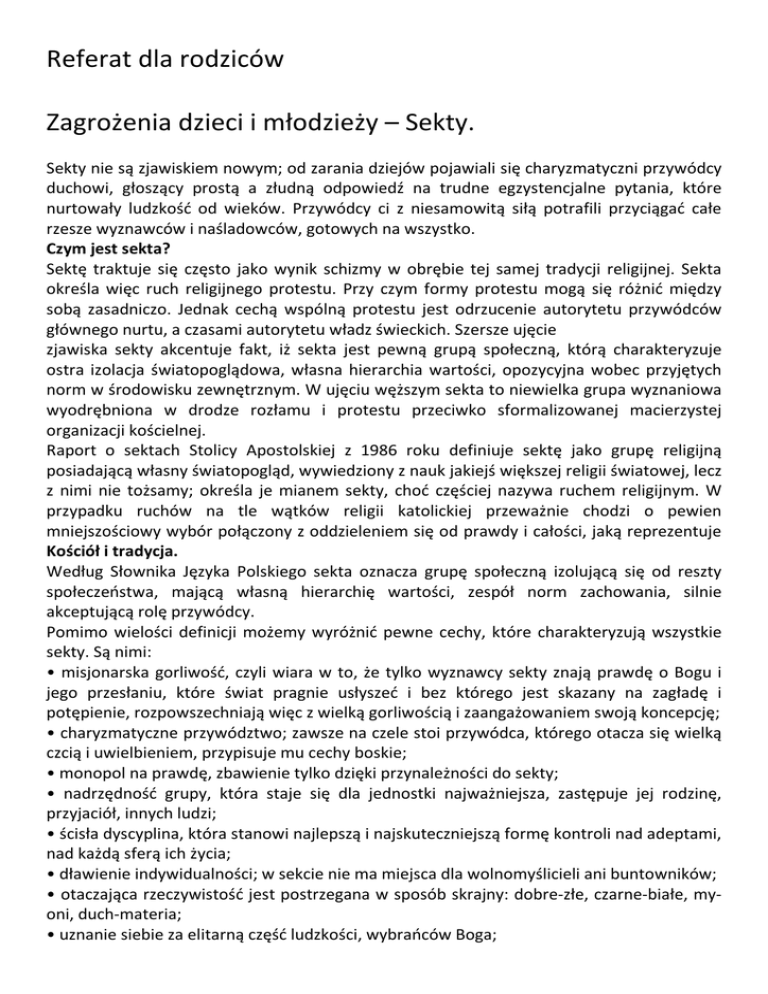 Referat dla rodziców Zagrożenia dzieci i młodzieży – Sekty.