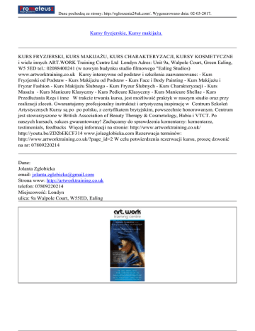 Dane pochodzą ze strony: http://ogloszenia24uk.com/. Wygenerowano dnia: 02-03-2017. Kursy fryzjerskie, Kursy makijażu. KURS FRYZJERSKI, KURS MAKIJAŻU, KURS CHARAKTERYZACJI, KURSY KOSMETYCZNE i wiele innych ART.WORK Training Centre Ltd Londyn Adres: Unit 9a, Walpole Court, Green Ealing, W5 5ED tel.: 02088400241 (w nowym budynku studio filmowego "Ealing Studios) www.artworktraining.co.uk Kursy intensywne od podstaw i szkolenia zaawansowane: - Kurs Fryzjerski od Podstaw - Kurs Makijażu od Podstaw - Kurs Face i Body Painting - Kurs Makijażu i Fryzur Fashion - Kurs Makijażu Ślubnego - Kurs Fryzur Ślubnych - Kurs Charakteryzacji - Kurs Masażu - Kurs Manicure Klasyczny - Kurs Pedicure Klasyczny - Kurs Manicure Shellac - Kurs Przedłużania Rzęs i inne W trakcie trwania kursu, jest możliwość praktyk w naszym studio oraz przy realizacji zleceń. Gwarantujemy profesjonalny instruktaż i artystyczną inspirację w Centrum Szkoleń Artystycznych Kursy są po po polsku, z certyfikatem brytyjskim, powszechnie honorowanym. Centrum jest stowarzyszone w British Association of Beauty Therapy & Cosmetology, Habia i VTCT. Po naszych kursach, sukces gwarantowany! Zachęcamy do sprawdzenia komentarzy: komentarze, testimonials, feedbacks Więcej informacji na stronie: http://www.artworktraining.co.uk/ http://youtu.be/ZD2bEKCF314 www.jolazglobicka.com Rezerwacja terminów: http://www.artworktraining.co.uk/?page_id=2 W celu potwierdzenia rezerwacji kursu, proszę dzwonić na nr: 07809220214 Dane: Jolanta Zglobicka email: [email protected] Strona www: http://artworktraining.co.uk telefon: 07809220214 Miejscowość: Londyn ulica: 9a Walpole Court, W55ED, Ealing