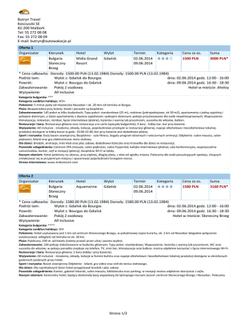 Butryn Travel Kosciuszki 5E 82-200 Malbork Tel: 55 272 08 08 Fax: 55 272 08 09 E-mail: [email protected] Oferta 1 Organizator Kierunek Hotel Wylot Termin Kategoria Cena za os. Suma Bułgaria Midia Grand Gdańsk 02.06.2014 1500 PLN 3000 PLN* Słoneczny Resort 09.06.2014 Brzeg * Cena całkowita: Dorosły: 1500.00 PLN (13.02.1984) Dorosły: 1500.00 PLN (13.02.1984) Podróż tam: Wylot z: Gdańsk do Bourgas dnia: 02.06.2014 godz. 12:00 - 16:00 Powrót: Wylot z: Bourgas do Gdańsk dnia: 09.06.2014 godz. 16:30 - 18:30 Zakwaterowanie: Pokój 2 osobowy Hotel w mieście: Aheloy Wyżywienie: All Inclusive Kategoria bułgarska: *** Kategoria sun&fun holidays: SF3+ Położenie: 5 minut jazdy od miasteczka Nessebar i ok. 20 min od lotniska w Burgas. Plaża: Bezpośrednio przy hotelu; leżaki i parasole są bezpłatne. Zakwaterowanie: 145 pokoi w kilku budynkach; Typy pokoi: standardowe (25 m), rodzinne (jednopokojowe, ok 50 m2), apartamenty z jedną sypialnią i pokojem dziennym, a także apartamenty z dwoma sypialniami i pokojem dziennym; pokoje przystosowane dla osób niepełnosprawnych; Wyposażenie: klimatyzacja, telewizor, minibar, łącze internetowe (płatne), łazienka z wanną lub prysznicem, suszarka do włosów, balkon. Restauracje i bary: Restauracja główna oraz restauracja a la carte (specjały bułgarskie); 4 bary - lobby bar, bar przy basenie. Wyżywienie: All inclusive - śniadania, obiady, kolacje, popołudniowe przekąski w restauracji głównej; napoje alkoholowe i bezalkoholowe lokalnej produkcji dostępne w lobby barze w godz. 10.00-22.00; bar przy basenie jest dodatkowo płatny. Sport i rozrywka: Duży basen zewnętrzny; Bezpłatnie - sala fitness, bogaty program dziennych i wieczornych animacji; Odpłatnie -salon masażu, salon piękności, bilard oraz gry elektroniczne; tenis stołowy. Dla dzieci: Brodzik, animacje, mini klub oraz plac zabaw; dodatkowo łóżeczka oraz krzesełka dla dzieci w restauracji. Pozostałe udogodnienia: Centrum SPA (masaże, salon piękności, salon fryzjerski); kafejka internetowa (płatna), sala konferencyjna, wypożyczalnia samochodów, kantor, sejf w recepcji (płatny); bezpłatne Wi-Fi w lobby. Naszym zdaniem: Hotel położony na uboczu, przy pięknej, długiej plaży, z dala od zgiełku miasta. Polecamy dla osób poszukujących spokoju, chcących zrelaksować się w przyjemnym miejscu i spacerować popołudniami brzegiem morza. Strona internetowa: www.midiaresort.com Oferta 2 Organizator Kierunek Hotel Wylot Termin Kategoria Cena za os. Suma Bułgaria Aquamarine Gdańsk 02.06.2014 1580 PLN 3160 PLN* Słoneczny 09.06.2014 Brzeg * Cena całkowita: Dorosły: 1580.00 PLN (13.02.1984) Dorosły: 1580.00 PLN (13.02.1984) Podróż tam: Wylot z: Gdańsk do Bourgas dnia: 02.06.2014 godz. 12:00 - 16:00 Powrót: Wylot z: Bourgas do Gdańsk dnia: 09.06.2014 godz. 16:30 - 18:30 Zakwaterowanie: Pokój 2 osobowy Hotel w mieście: Słoneczny Brzeg Wyżywienie: All Inclusive Kategoria bułgarska: **** Kategoria sun&fun holidays: SF4 Położenie: Hotel usytuowany jest 1 km od centrum Słonecznego Brzegu, w południowej części kurortu, ok. 2 km od Nessebar (dogodne połączenie autobusowe); odległość od lotniska to ok. 30 km. Plaża: Publiczna, 250 m. od hotelu (należy przejść przez ulicę i pasmo wydm). Zakwaterowanie: 104 pokoje zlokalizowane w budynku głównym; Typy pokoi: standardowe; Wyposażenie: łazienka z wanną lub prysznicem, WC oraz suszarka do włosów; w pokoju ponadto znajduje się telefon, TV, mini bar, klimatyzacja oraz balkon; można odpłatnie korzystać z łącza internetowego Wi-Fi. Restauracje i bary: Restauracja główna; 2 bary (lobby i przy basenie). Wyżywienie: All inclusive - śniadania, obiady, kolacje w formie bufetu oraz napoje alkoholowe i bezalkoholowe lokalnej produkcji dostępne w określonych godzinach podanych przez hotel. Sport i rozrywka: Basen zewnętrzny Odpłatnie - bilard, gry video oraz stół do tenisa stołowego. Dla dzieci: Dla najmłodszych Gości hotel przygotował brodzik i plac zabaw. Pozostałe udogodnienia: Kantor, gabinet lekarski, salon masażu, biblioteczka oraz parking; w recepcji można odpłatnie skorzystać z sejfu. Naszym zdaniem: Kameralny hotel, będący doskonałą bazą wypadową do tętniącego nocnym życiem centrum Słonecznego Brzegu i Nessebar. Polecamy Strona 1/2 Butryn Travel Kosciuszki 5E 82-200 Malbork Tel: 55 272 08 08 Fax: 55 272 08 09 E-mail: [email protected] go szczególnie osobom młodym. Strona internetowa: www.aquamarine.bg Oferta 3 Organizator Kierunek Hotel Wylot Termin Kategoria Cena za os. Suma Bułgaria Victoria Palace Gdańsk 02.06.2014 1915 PLN 3830 PLN* Słoneczny 09.06.2014 Brzeg * Cena całkowita: Dorosły: 1915.00 PLN (13.02.1984) Dorosły: 1915.00 PLN (13.02.1984) Podróż tam: Wylot z: Gdańsk do Bourgas dnia: 02.06.2014 godz. 12:00 - 16:00 Powrót: Wylot z: Bourgas do Gdańsk dnia: 09.06.2014 godz. 16:30 - 18:30 Zakwaterowanie: Pokój ekonomiczny z widokiem na park Hotel w mieście: Słoneczny Brzeg Wyżywienie: All Inclusive Kategoria bułgarska: ***** Kategoria sun&fun holidays: SF5 Położenie: 1 km od centrum Słonecznego Brzegu, 35 km od lotniska w Burgas. Plaża: Bezpośrednio przy hotelu; serwis plażowy płatny. Zakwaterowanie: 545 pokoi; Typy pokoi: 17 jednoosobowych (15 m, nie posiadają balkonów), 484 dwuosobowe z możliwością dostawki ( 30 m), 44 pokoje typu suite (50 m); Wyposażenie: łazienka (prysznic lub wanna), suszarka do włosów, WC, klimatyzacja, telefon, TV sat, sejf (płatny), mini bar (płatny). Restauracje i bary: Restauracja główna, 3 restauracje a la carte; 5 barów. Wyżywienie: All inclusive - śniadania, obiady, kolacje, lekkie przekąski w ciągu dnia, ciasta, lody; napoje alkoholowe i bezalkoholowe lokalnej produkcji w godz. 10.00-24.00 (ostatnie zamówienie przyjmowane są do godz. 23.45). Sport i rozrywka: Basen zewnętrzny, basen wewnętrzny; Bezpłatnie - boisko do siatkówki, rzutki, codzienne animacje; Odpłatnie - 