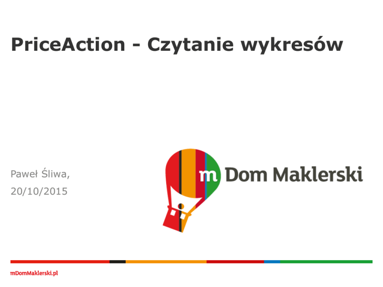 PriceAction - Czytanie wykresów Paweł Śliwa, 20/10/2015 Paweł Śliwa Pracownik Domu Maklerskiego mBanku na stanowisku Head of FX Sales, wcześniej Domu Maklerskiego X-Trade Brokers S.A. na stanowisku Z-ca Dyr. Regionu. Prowadzi i organizuje szkolenia dla inwestorów od 2005 roku w ramach szkoleń stacjonarnych jak i webinarowych. Założyciel Stowarzyszenia Analityków Technicznych, organizacji skupiającej inwestorów Współpracuje ze Stowarzyszeniem Inwestorów Indywidualnych (Wall Street, Akademia tworzenia kapitału), Fundacją Edukacji Rynku Kapitałowego, uczelniami wyższymi: SGH w Warszawie, Akademia Ekonomiczna we Wrocławiu i wieloma innymi. Twórca strony www.priceaction.pl . Rynkami finansowymi zajmuje się od 1998 roku, specjalizując się w Analizie Technicznej. Jako teoretyk i praktyk inwestuje swoje oszczędności. Jest uczestnikiem licznych szkoleń i kursów w tym z Robertem Minerem. Prywatnie mąż, tata i pasjonat rynków finansowych oraz samochodów terenowych. Agenda 1. jak kształtują się szczyty i dołki 2. powtarzalne wzorce i szablony 3. techniki otwierania pozycji Cytat dni: „ Nawet najdalszą podróż zaczyna się od pierwszego kroku” – Lao-tzu. chiński filozof, twórca taoizmu | Tytuł Prezentacji |3 Stałe układy a „czytanie wykresu” 1. Gra na szablony (patterny, stałe układy) jest grupą zasad które muszą wystąpić w danym czasie i danym miejscu. Przykłady: formacje RGR, OneToOne, Gartley czy PinBar na linii trendu. 2. Szablonowa gra zrzuca odpowiedzialność za transakcję na sam układ. 3. Rynki są żywym tworem a szablon jest sztywna strukturą 4. Czytanie wykresu opiera się na logice, obserwacji przepływu pieniędzy i zaufaniu do tego co się widzi a nie tego co media chce Ci przekazać. 5. Czytanie wykresu daje dokładne info gdzie ustawiać Stop Loss, bo wiemy gdzie są punkty (ceny) równowagi pomiędzy popytem i podażą. 6. Dobre efekty daje łączenie Stałych Układów z aktywnym monitoringiem na różnych interwałach. Zasada nr1: nie sprzedajemy na wsparciu i nie kupujemy na oporach [Kupujemy na wsparciu a sprzedajemy na oporach] sell sell buy buy |4 Gra na Stałe Układy 115pkt Brak kupujących 112pkt 111pkt W trendzie wzrostowym pojawia się korekta której długość jest w pewnym momencie taka sama jak poprzedniej (obszary na niebiesko zaznaczone) Młot na H4 | Tytuł Prezentacji |5 Kiedy wiadomo że korekta to korekta ? B A C Wniosek: minimalny ruch po korekcie to jej długość + 1pkt Korekta w mniejszej skali czasowej Opór z wyższego interwału- strefa podaży Brak nowego HIGH = słabość popytu = siła podaży Siła podaży Siła kupujących Sygnały siły SELL (słabości BUY). Na razie to poczatki więc ryzyko SELL jest spore. Jeżeli byłeś BUY to te 2 strefy są kluczowe dla Ciebie | Tytuł Prezentacji Jeżeli chcesz być SELL to po przebiciu tych stref masz najlepsze okazje, bo potwierdzone poprzez „zmiażdżenie” tych po stronie BUY |8 Wersja spadkowa – model dla 1 interwału Miejsce transakcji „SELL” Wersja wzrostowa – model dla 1 interwału Miejsce transakcji „BUY” Najlepsze miejsca na SELL i Stop/Loss Bezpieczny stop/loss Krótki stop –opór z niższego interwału | Tytuł Prezentacji | 11 Najlepsze miejsca na BUY i Stop/Loss Bezpieczny stop/loss Krótki stop – WSPARCIE z niższego interwału | Tytuł Prezentacji | 12 Przykład Lokalny opór - siła podaży Lokalne wsparcie - siła popytu Lokalne wsparcie - siła popytu Ważne jest to miejsce z perspektywy wyższego interwału | Tytuł Prezentacji Pokazać przykład z EURZAR H4 | 13 AUDUSD H4 - 20/11/2013 kupujący Co się stanie z kupującymi gdy cena zejdzie niżej? Przy tych cenach Kupujący maja pokaźną stratę. A co „JA” bym zrobił będąc kupującym gdy cena wróci tutaj? GBPUSD D1 - 28/08/2013 GBPUSD H1 - 28/08/2013 BUY 2 BUY 1 - - Co inwestorzy pomyśleliby gdyby pojawił się nowy dołek? Czy kupujący będą szczęśliwi? Co to oznacza dla ich pozycji? Sprzedający próbują bronić swoich pozycji OLO – ostatnia linia obrony EURUSD Buy po 1,3372; zamknięcie po 1,3379 s/l – 1,3370 ZYSK=7 pipsów Ryzyko = 3 pipsy | Tytuł Prezentacji | 16 Podsumowanie 1. 2. 3. 4. Sposobów na znalezienie końca korekty jest wiele Należy wybrać jeden i konsekwentnie się go trzymać Analizować swoje zagrania aby je usprawniać Określić Zarzadzanie Kapitałem Dziękuję za uwagę Paweł Śliwa Head of FX Sales email: [email protected]