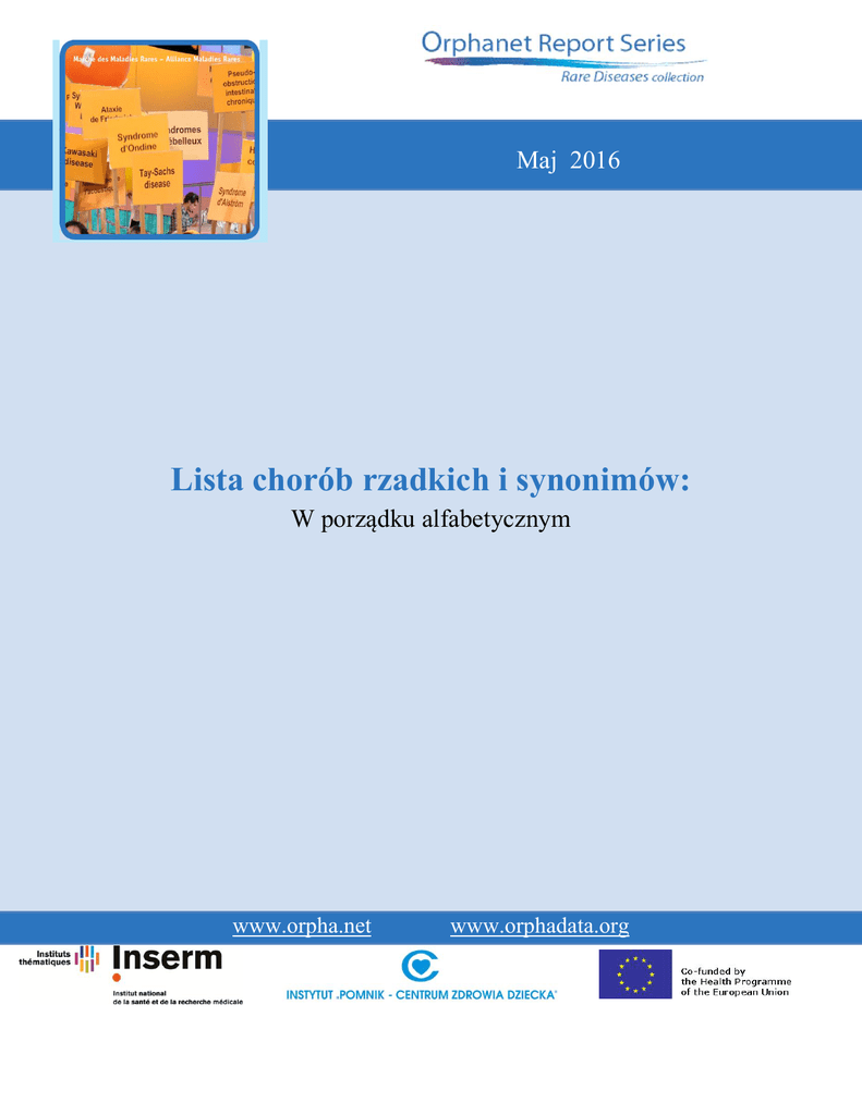 Maj 2016 Lista chorób rzadkich i synonimów: W porządku alfabetycznym www.orpha.net www.orphadata.org została rozpoznana jako inna jednostka. W tym przypadku informacje dotyczące takiej jednostki zostają przeniesione, a użytkownicy skierowani do odpowiedniego wpisu. METODOLOGIA Orphanet dostarcza obszerny spis chorób rzadkich w Europie, publikowany w formie listy dwa razy w roku. Choroby rzadkie zarejestrowane w Orphanecie są zdefiniowane na podstawie dwóch kryteriów: Każda jednostka zdefiniowana jest przez swoją kliniczną jednorodność, niezależnie od etiologii i liczby zidentyfikowanych związanych z nią genów ; Pojęcie choroby rzadkiej zdefiniowane jest zgodnie z prawodawstwem europejskim, które określa wartość graniczną częstości występowania jako nie mniej niż 5 osób dotkniętych chorobą na 10000 (Regulacja (EC) N°141/2000 Parlamentu Europejskiego i Rady z 16 grudnia 1999 dotycząca sierocych produktów medycznych, http://ec.europa.eu/health/files/eudralex/vol1/reg_2000_141/reg_2000_141_en.pdf). Zarejestrowane choroby rzadkie zostały opisane w międzynarodowej literaturze naukowej (artykuły recenzowane) z przynajmniej dwoma przypadkami potwierdzającymi, że objawy kliniczne nie zostały powiązane przypadkowo. Jednakże, niektóre choroby zostały zarejestrowane mimo że odnotowano tylko jeden przypadek, w celu uzupełnienia określonej klasyfikacji (szczególnie klasyfikacji wrodzonych wad metabolizmu). Choroby rzadkie są rejestrowane pod nazwą główną z odpowiednią liczbą synonimów. Unikalny identyfikator, numer ORPHA, jest losowo przydzielany przez bazę danych dla każdej jednostki chorobowej. Ten numer nigdy nie podlega ponownemu wykorzystaniu więc jest niezmienny w czasie. Numery Orpha umieszczone na liście w przeszłości mogą być nieobecne w aktualnym wykazie. Jest to spowodowane przez: Wyjście haseł z użycia (np. zdublowane nazwy jednostki chorobowej oraz choroby, które nie są już uznawane za rzadkie). Utratę aktualności wpisu kiedy jednostka chorobowa już dłużej nie istnieje per se, ale Zbieranie danych W związku z nowymi danymi naukowymi, spis chorób rzadkich Orphanetu jest regularnie aktualizowany na podstawie dwóch niewykluczających się źródeł: informacje udokumentowane i(lub) rady ekspertów. Stan wiedzy naukowej jest monitorowany przez: Odbywającą się dwa razy w miesiącu analizę określonego zestawu międzynarodowych, recenzowanych czasopism naukowych dających dostęp do różnorodnych medycznych specjalizacji prezentowanych w Orphanecie; Comiesięczne wyszukiwanie w bazie Medline za pomocą algorytmu: (nozologia[Tytuł] LUB klasyfikacja[Tytuł] LUB nomenklatura[Tytuł] LUB terminologia[Tytuł]) I (choroba rzadka* LUB zespół* LUB zaburzenie*); Wyszukiwanie w bazie Medline zapytań zgłoszonych przez ekspertów, użytkowników bazy danych lub na potrzeby rejestracji nowych usług w Orphanecie (np. badań diagnostycznych, ośrodków eksperckich, organizacji pacjentów). Aktualizacja spisu chorób rzadkich jest co miesiąc oceniana przez komitet naukowy i medyczny Orphanetu, a następnie zatwierdzana przez ekspertów. Prezentacja danych Nazwy główne i synonimy jednostek chorobowych są umieszczone na liście wraz ze swoim numerem ORPHA, w kolejności alfabetycznej. Nazwy jednostek chorobowych, które utraciły aktualność są umieszczone na liście z aktualnym numerem ORPHA i są poprzedzone znakiem “→ “. Tabela w aneksie zawiera nazwę choroby rzadkiej i numer ORPHA, z których należy korzystać zamiast nazw jednostek, które utraciły aktualność. Orphanet Report Series - Lista chorób rzadkich w porządku alfabetycznym - Maj 2016 http://www.orpha.net/orphacom/cahiers/docs/PL /Lista chorób rzadkich w porządku alfabetycznym.pdf 2 Hasła, które wyszły z użycia nie zostały uwzględnione na liście. W przypadku duplikatów nazwa, która wyszła z użycia została dodana do wymienionych na liście chorób rzadkich. Orphanet Report Series - Lista chorób rzadkich w porządku alfabetycznym - Maj 2016 http://www.orpha.net/orphacom/cahiers/docs/PL /Lista chorób rzadkich w porządku alfabetycznym.pdf 3 Lista chorób rzadkich w porządku alfabetycznym Numer ORPHA 567 6 1772 1772 1772 243 243 2982 91144 90776 243 2138 98078 242 242 90787 90786 755 755 168563 251510 755 755 98085 96265 Nazwa choroby 22q11DS 3metylokrotonyloglicynuria 45,X/46,XY MDG 45,X0/46,XY MDG 45,X0/46,XY mieszana dysgenezja gonad 46,XX całkowita dysgenezja gonad 46,XX czysta dysgenezja gonad 46,XX ZRP 46,XX ZRP indukowane nadmiarem androgenów matczynych 46,XX ZRP indukowane nadmiarem androgenów u płodu 46,XX dysgenezja jajników 46,XX jajnikowo-jądrowe ZRP 46,XX ZRP indukowane przez nadmiar androgenów 46,XY CGD 46,XY czysta dysgenezja gonad 46,XY ZRP spowodowane zaburzeniem steroidogenezy w jądrach 46,XY ZRP spowodowane zaburzeniem steroidogenezy w nadnerczach i jądrach 46,XY ZRP z powodu niewrażliwości na hormon luteinizujący lub niedobór podjednostki beta hormonu luteinizującego 46,XY ZRP z powodu niewrażliwości na LH lub niedoboru LHB 46,XY dysgenezja gonad ruchowa i czuciowa neuropatia 46,XY PGD 46,XY zaburzenie różnicowania płci z powodu niewrażliwości na hormon luteinizujący lub niedobór podjednostki beta hormonu luteinizującego 46,XY zaburzenie różnicowania płci z powodu niewrażliwości na LH lub niedoboru LHB 46,XY ZRP 46,XY ZRP z powodu całkowitej inaktywacji Numer ORPHA 96266 96265 96265 96265 96266 96266 250977 99886 96147 91385 100055 100055 284460 156152 98127 98642 98159 98158 98157 98157 324723 324708 14 1164 69739 210122 48818 48818 2008 930 929 99722 930 294983 Nazwa choroby receptora LH 46,XY ZRP z powodu częściowej oporności na hormon luteinizujący 46,XY ZRP z powodu całkowitej inaktywacjii receptora LH 46,XY ZRP z powodu całkowitej oporności na hormon luteinizujący 46,XY ZRP z powodu całkowitej oporności na LH 46,XY ZRP z powodu częściowej inaktywacjii receptora L