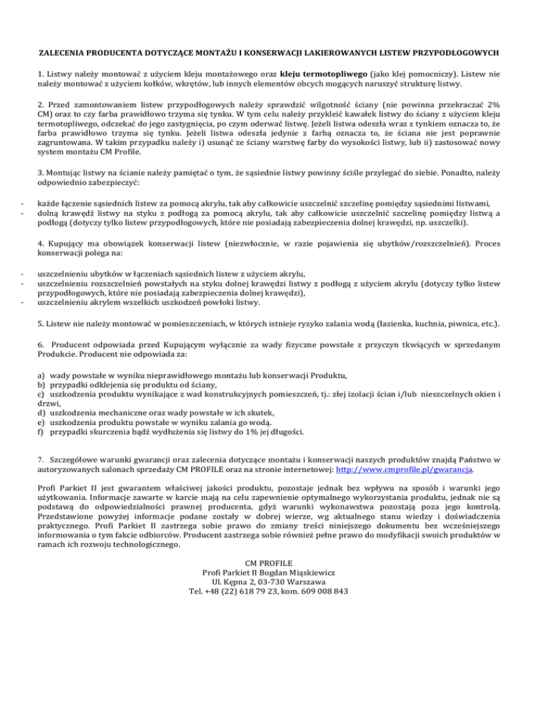 ZALECENIAPRODUCENTADOTYCZĄCEMONTAŻUIKONSERWACJILAKIEROWANYCHLISTEWPRZYPODŁOGOWYCH 1. Listwy należy montować z użyciem kleju montażowego oraz klejutermotopliwego (jako klej pomocniczy). Listew nie należymontowaćzużyciemkołków,wkrętów,lubinnychelementówobcychmogącychnaruszyćstrukturęlistwy. 2. Przed zamontowaniem listew przypodłogowych należy sprawdzić wilgotność ściany (nie powinna przekraczać 2% CM)oraztoczyfarbaprawidłowotrzymasiętynku.Wtymcelunależyprzykleićkawałeklistwydościanyzużyciemkleju termotopliwego,odczekaćdojegozastygnięcia,poczymoderwaćlistwę.Jeżelilistwaodeszławrazztynkiemoznaczato,że farba prawidłowo trzyma się tynku. Jeżeli listwa odeszła jedynie z farbą oznacza to, że ściana nie jest poprawnie zagruntowana.Wtakimprzypadkunależyi)usunąćześcianywarstwęfarbydowysokościlistwy,lubii)zastosowaćnowy systemmontażuCMProfile. 3.Montująclistwynaścianienależypamiętaćotym,żesąsiednielistwypowinnyściśleprzylegaćdosiebie.Ponadto,należy odpowiedniozabezpieczyć: - każdełączeniesąsiednichlistewzapomocąakrylu,takabycałkowicieuszczelnićszczelinępomiędzysąsiednimilistwami, dolną krawędź listwy na styku z podłogą za pomocą akrylu, tak aby całkowicie uszczelnić szczelinę pomiędzy listwą a podłogą(dotyczytylkolistewprzypodłogowych,którenieposiadajązabezpieczeniadolnejkrawędzi,np.uszczelki). 4. Kupujący ma obowiązek konserwacji listew (niezwłocznie, w razie pojawienia się ubytków/rozszczelnień). Proces konserwacjipolegana: - uszczelnieniuubytkówwłączeniachsąsiednichlistewzużyciemakrylu, uszczelnieniurozszczelnieńpowstałychnastykudolnejkrawędzilistwyzpodłogązużyciemakrylu(dotyczytylkolistew przypodłogowych,którenieposiadajązabezpieczeniadolnejkrawędzi), uszczelnieniuakrylemwszelkichuszkodzeńpowłokilistwy. 5.Listewnienależymontowaćwpomieszczeniach,wktórychistniejeryzykozalaniawodą(łazienka,kuchnia,piwnica,etc.). 6. Producent odpowiada przed Kupującym wyłącznie za wady fizyczne powstałe z przyczyn tkwiących w sprzedanym Produkcie.Producentnieodpowiadaza: a) wadypowstałewwynikunieprawidłowegomontażulubkonserwacjiProduktu, b) przypadkiodklejeniasięproduktuodściany, c) uszkodzeniaproduktuwynikającezwadkonstrukcyjnychpomieszczeń,tj.:złejizolacjiściani/lubnieszczelnychokieni drzwi, d) uszkodzeniamechaniczneorazwadypowstałewichskutek, e) uszkodzeniaproduktupowstałewwynikuzalaniagowodą. f) przypadkiskurczeniabądźwydłużeniasięlistwydo1%jejdługości. 7. SzczegółowewarunkigwarancjiorazzaleceniadotyczącemontażuikonserwacjinaszychproduktówznajdąPaństwow autoryzowanychsalonachsprzedażyCMPROFILEoraznastronieinternetowej:http://www.cmprofile.pl/gwarancja. Profi Parkiet II jest gwarantem właś ciwej jakoś ci produktu, pozostaje jednak bez wpływu na sposó b i warunki jego uż ytkowania.Informacjezawartewkarciemająnaceluzapewnienieoptymalnegowykorzystaniaproduktu,jednakniesą podstawą do odpowiedzialnoś ci prawnej producenta, gdyż warunki wykonawstwa pozostają poza jego kontrolą. Przedstawione powyż ej informacje podane zostały w dobrej wierze, wg aktualnego stanu wiedzy i doś wiadczenia praktycznego. Profi Parkiet II zastrzega sobie prawo do zmiany treś ci niniejszego dokumentu bez wcześ niejszego informowaniaotymfakcieodbiorcó w.Producentzastrzegasobieró wnież pełneprawodomodyfikacjiswoichproduktó ww ramachichrozwojutechnologicznego. CMPROFILE ProfiParkietIIBogdanMiąskiewicz Ul.Kępna2,03-730Warszawa Tel.+48(22)6187923,kom.609008843