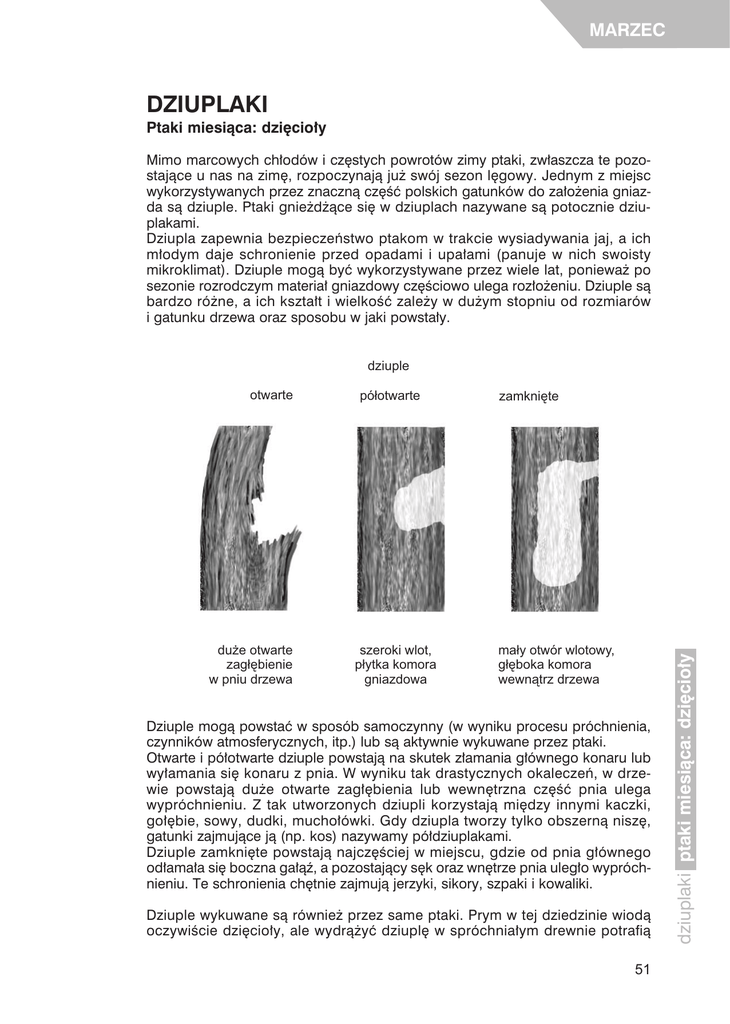 MARZEC DZIUPLAKI Ptaki miesiąca: dzięcioły Mimo marcowych chłodów i częstych powrotów zimy ptaki, zwłaszcza te pozostające u nas na zimę, rozpoczynają już swój sezon lęgowy. Jednym z miejsc wykorzystywanych przez znaczną część polskich gatunków do założenia gniazda są dziuple. Ptaki gnieżdżące się w dziuplach nazywane są potocznie dziuplakami. Dziupla zapewnia bezpieczeństwo ptakom w trakcie wysiadywania jaj, a ich młodym daje schronienie przed opadami i upałami (panuje w nich swoisty mikroklimat). Dziuple mogą być wykorzystywane przez wiele lat, ponieważ po sezonie rozrodczym materiał gniazdowy częściowo ulega rozłożeniu. Dziuple są bardzo różne, a ich kształt i wielkość zależy w dużym stopniu od rozmiarów i gatunku drzewa oraz sposobu w jaki powstały. dziuple du¿e otwarte zag³êbienie w pniu drzewa pó³otwarte szeroki wlot, p³ytka komora gniazdowa zamkniête ma³y otwór wlotowy, g³êboka komora wewn¹trz drzewa Dziuple mogą powstać w sposób samoczynny (w wyniku procesu próchnienia, czynników atmosferycznych, itp.) lub są aktywnie wykuwane przez ptaki. Otwarte i półotwarte dziuple powstają na skutek złamania głównego konaru lub wyłamania się konaru z pnia. W wyniku tak drastycznych okaleczeń, w drzewie powstają duże otwarte zagłębienia lub wewnętrzna część pnia ulega wypróchnieniu. Z tak utworzonych dziupli korzystają między innymi kaczki, gołębie, sowy, dudki, muchołówki. Gdy dziupla tworzy tylko obszerną niszę, gatunki zajmujące ją (np. kos) nazywamy półdziuplakami. Dziuple zamknięte powstają najczęściej w miejscu, gdzie od pnia głównego odłamała się boczna gałąź, a pozostający sęk oraz wnętrze pnia uległo wypróchnieniu. Te schronienia chętnie zajmują jerzyki, sikory, szpaki i kowaliki. Dziuple wykuwane są również przez same ptaki. Prym w tej dziedzinie wiodą oczywiście dzięcioły, ale wydrążyć dziuplę w spróchniałym drewnie potrafią 51 dziuplaki ptaki miesiąca: dzięcioły otwarte MARZEC także niektóre sikory. Dzięcioły wykuwają co roku nowe dziuple, dzięki czemu stare mogą być zajmowane przez inne gatunki. Dla przykładu duże dziuple po dzięciole czarnym zasiedlane są przez gołębie siniaki oraz gągoły. Z dzięciolich dziupli korzystają także niektóre małe sowy (sóweczka, włochatka) i wiele innych ptaków. Kowalik zajmuje często dziuple z dużym otworem, by później skrzętnie zamurować je błotem, gliną i odchodami, pozostawiając wejście dopasowane do swoich rozmiarów. Wiele dzięciołów preferuje wykuwanie dziupli w drzewach o miękkim drewnie, takich jak osika, wierzba czy olsza. Dlatego tak ważne jest zachowanie ich w naszym otoczeniu. Możliwość powstawania i tworzenia dziupli zależy w dużym stopniu od pozostawiania w lesie martwych drzew, wyłomów, drzew złamanych, w których dzięki warunkom atmosferycznym i grzybom dziuple mają czas wypróchnieć i utworzyć w ten sposób dogodne mieszkanie dla ptasich lokatorów. dziuplaki ptaki miesiąca: dzięcioły Dziuplaki, aby mogły przystępować do rozrodu potrzebują drzewostanu o zróżnicowanej strukturze wiekowej, w którym mogą znaleźć odpowiednią dla siebie dziuplę, a także dostatecznie dużo pokarmu. W lasach bez starych drzew (np. w młodych monokulturach sosnowych) liczebność dziuplaków jest mocno ograniczona. Dlatego las powinien odznaczać się dużą różnorodnością biologiczną, bardziej przypominać mozaikę gatunków i środowisk, aniżeli przemysłową uprawę drzew. Dla zachowania równowagi zachodzących w lesie procesów potrzebne są drzewa powalone, martwe, wykroty i kikuty drzew, od których całymi płatami odstaje kora. Te ostatnie poszukiwane są przez pełzacze, które budują swoje gniazda właśnie w wąskich szczelinach pod korą. Wzorem takiego prawdziwego, tętniącego życiem lasu w Europie jest Puszcza Białowieska. Należy pamiętać, że dziuplaste drzewa występują także poza lasami. Na starych cmentarzach, alejach przydrożnych, w parkach, sadach i miejskich skwerach znajdziemy zapewne dużo okazałych drzew, w których lęgną się ptaki. Dla zachowania pójdźki i dudka ważne są śródpolne wierzby, które przez lata ogławiane wytwarzają wiele dziupli. Brak starodrzewu w lasach oraz dziuplastych drzew w parkach i ogrodach od wielu lat próbuje się zastąpić budkami lęgowymi. Jednak te rozwieszane najczęściej służą głównie ptakom pospolitym (np. szpakom i bogatkom), mającym i tak wiele dogodnych miejsc do założenia gniazda. Tymczasem nadmierna ich liczebność w niektórych środowiskach może powodować konkurencję dla gatunków rzadszych (bogatka może wypierać sikorę ubogą, a szpak dzięcioła średniego). Innym problemem związanym z rozDudek wieszaniem budek w lasach jest przystosowanie się do tej nowej sytuacji drapieżników, takich jak kuny, gronostaje czy łasice. Zwierzęta te szybko nauczyły się kojarzyć budki z jej smaczną zawartością. Korzystają z nich jak ze swoistych spiżarni, chodząc od jednej do drugiej i wyjadając jaja, młode a nawet wysiadujące samice. Chcąc budować i rozwieszać budki należy zatem wybierać modele przeznaczone dla gatunków rzadkich (pójdźki, dudka, kraski, płomykówki) lub dla gatunków gnieżdżących się na terenach zurbanizowanych, na ścianach budynków i pod ich dachami (jerzyk, mazurek, kopciuszek, pliszka siwa), pamiętając o tym, że 52 MARZEC ochrona dziuplaków to przede wszystkim starania o zachowanie dziuplastych drzew. U dzięciołów zauważyć możemy zespół cech, świadczących o przystosowaniu do kucia dziupli i specyficznego sposobu żerowania. Ich cztery palce, z których dwa skierowane są do przodu, a dwa do tyłu (wyjątek stanowi dzięcioł trójpalczasty), zaopatrzone są w chwytne pazury. Ptaki te posiadają mocny dziób i czaszkę, w której znajduje się warstwa tkanki amortyzującej wstrząsy w trakcie kucia. Bardzo 