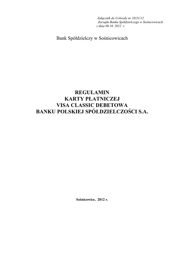Załącznik do Uchwały nr 10/31/12 Zarządu Banku Spółdzielczego w Sośnicowicach z dnia 08.10. 2012 r. Bank Spółdzielczy w Sośnicowicach REGULAMIN KARTY PŁATNICZEJ VISA CLASSIC DEBETOWA BANKU POLSKIEJ SPÓŁDZIELCZOŚCI S.A. Sośnicowice, 2012 r. Spis treści ROZDZIAŁ I. POSTANOWIENIA OGÓLNE ........................................................................................................ 3 ROZDZIAŁ II. WYDAWANIE KARTY .................................................................................................................. 5 ROZDZIAŁ III. UŻYTKOWANIE KARTY ............................................................................................................ 6 ROZDZIAŁ IV. ROZLICZANIE TRANSAKCJI.................................................................................................... 8 ROZDZIAŁ V. ZESTAWIENIE TRANSAKCJI I REKLAMACJE ..................................................................... 8 ROZDZIAŁ VI. ZGŁOSZENIE BLOKADY KARTY ............................................................................................ 9 ROZDZIAŁ VII. ODPOWIEDZIALNOŚĆ .............................................................................................................. 9 ROZDZIAŁ VIII. POSTANOWIENIA KOŃCOWE ............................................................................................ 10 2 Rozdział I. Postanowienia ogólne § 1. „Regulamin karty płatniczej Visa Classic Debetowej Banku Polskiej Spółdzielczości S.A.”, zwany dalej Regulaminem, określa zasady wydawania i używania karty płatniczej VISA Classic Debetowej wydawanych przez Bank Polskiej Spółdzielczości S.A. oraz zasady rozliczania transakcji dokonanych przy użyciu tych kart. § 2. 1. Karty VISA Classic Debetowe są międzynarodowymi kartami płatniczymi umożliwiającymi Posiadaczowi karty lub Użytkownikowi karty dokonywanie w kraju i za granicą transakcji: 1) płatności bezgotówkowych za towary i usługi w placówkach, oznaczonych emblematem VISA; 2) wypłaty gotówki w bankomatach oznaczonych emblematem VISA; 3) wypłaty gotówki w jednostkach banków członkowskich organizacji VISA, oznaczonych emblematem VISA; 4) płatności dokonywanych w Internecie; 5) sprawdzenie wysokości wolnych środków w bankomatach świadczących taką usługę; 6) aktywację karty za pomocą kodu identyfikacyjnego PIN w bankomatach świadczących powyższe usługi; 4. Karta VISA Classic Debetowa umożliwia dokonywanie w kraju i za granicą transakcji na odległość bez jej fizycznego przedstawienia (uwarunkowane decyzją akceptanta). § 3. Używane w niniejszym Regulaminie określenia mają następujące znaczenie: 1) autoryzacja – zgoda udzielona przez Bank na dokonywanie transakcji przy użyciu karty; 2) Bank – Bank Spółdzielczy w Sośnicowicach; 3) blokada karty (zastrzeżenie karty) – unieważnienie karty przez Bank zgodnie z obowiązującymi przepisami prawa, Umową lub Regulaminem; 4) czasowa blokada karty – czynność dokonywana na wniosek Banku/Użytkownika karty, polegająca odpowiednio na czasowym wstrzymaniu możliwości dokonywania transakcji autoryzowanych; 5) Centrum Kart – jednostka organizacyjna Kredyt Banku, dokonująca w imieniu Banku zastrzeżeń i rozliczeń transakcji dokonanych przy użyciu kart debetowych wydawanych przez Bank; 6) czytnik zbliżeniowy – elektroniczne narzędzie – stanowiące integralną część terminala POS – służące do przeprowadzania transakcji zbliżeniowych, odczytujące dane z anteny zbliżeniowej; 7) CVV2/CVC2 – trzycyfrowy numer umieszczony na rewersie karty, używany do autoryzacji transakcji podczas dokonywania płatności bez fizycznego użycia karty, w szczególności do realizowania zamówień składanych listownie, telefonicznie lub transakcji dokonywanych przez Internet; 8) dzień roboczy – dzień, w którym Bank zleceniodawcy lub beneficjenta prowadzi działalność wymaganą do wykonania transakcji płatniczej; 9) duplikat karty – kolejny egzemplarz karty z takim samym numerem i datą ważności, jak w karcie dotychczas używanej; 10) informacja o transakcjach – informacja podawana na wyciągu z rachunku po zakończeniu każdego miesiąca kalendarzowego, zawierająca wszystkie transakcje rozliczone przez Bank w danym miesiącu kalendarzowym wraz z należnymi Bankowi opłatami i prowizjami; 11) karta – międzynarodowa karta płatnicza VISA, spersonalizowana oraz niespersonalizowana, zarówno główna jak i dodatkowa, wydawana przez Bank; 3 12) karta spersonalizowana – karta z nadrukowanym na awersie imieniem i nazwiskiem Posiadacza karty/Użytkownik karty; 13) kod identyfikacyjny - kod PIN (Personal Identification Number) stanowiący poufny numer lub inne oznaczenie, które łącznie z danymi zawartymi na karcie służy do elektronicznej identyfikacji Użytkownika karty, przypisany do danej karty i znany tylko Użytkownikowi karty; 14) kurs walutowy - kurs wymiany, ogłaszany przez Bank, stosowany do przeliczania walut, dostępny w każdej placówce Banku oraz na stronie internetowej Banku. Kurs walutowy może ulegać zmianie w ciągu dnia operacyjnego. Zmiany wartości kursu walutowego nie wymagają uprzedniego zawiadomienia Posiadacza karty; 15) limity transakcyjne – kwota, do wysokość której Posiadacz karty/Użytkownik karty może dokonywać w ciągu jednego dnia transakcji gotówkowych oraz bezgotówkowych, wysokość limitu jest osobno ustalona dla każdej z wymienionych transakcji; 16) Organizacja płatnicza - organizacja międzynarodowa, której członkami są instytucje finansowe tworzące system rozliczeń transakcji dokonywanych przy użyciu kart; 17) Posiadacz karty - osoba fizyczna, będąca Posiadaczem lub Współposiadaczem rachunku bankowego, która na podstawie Umowy dokonuje w swoim imieniu i na swoją rzecz transakcji płatniczych określonych w Umowie; 18) Posiadacz rachunku – osoba fizyczna, która zawarła z Bankiem Umowę rachunku, przy czym