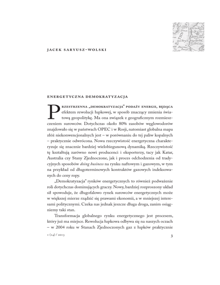- P „” , efektem rewolucji łupkowej, w sposób znaczący zmienia światową geopolitykę. Ma ona związek z geograficznym rozmieszczeniem surowców. Dotychczas około 80% zasobów węglowodorów znajdowało się w państwach OPEC i w Rosji, natomiast globalna mapa złóż niekonwencjonalnych jest – w porównaniu do tej paliw kopalnych – praktycznie odwrócona. Nowa rzeczywistość energetyczna charakteryzuje się znacznie bardziej wielobiegunową dynamiką. Rzeczywistość tę kształtują zarówno nowi producenci i eksporterzy, tacy jak Katar, Australia czy Stany Zjednoczone, jak i proces odchodzenia od tradycyjnych sposobów doing business na rynku naftowym i gazowym, w tym na przykład od długoterminowych kontraktów gazowych indeksowanych do ceny ropy. „Demokratyzacja” rynków energetycznych to również podważenie roli dotychczas dominujących graczy. Nowy, bardziej rozproszony układ sił spowoduje, że długofalowo rynek surowców energetycznych może w większej mierze rządzić się prawami ekonomii, a w mniejszej interesami politycznymi. Czeka nas jednak jeszcze długa droga, zanim osiągniemy taki stan. Transformacja globalnego rynku energetycznego jest procesem, który już ma miejsce. Rewolucja łupkowa odbywa się na naszych oczach – w 2004 roku w Stanach Zjednoczonych gaz z łupków praktycznie () / - nie istniał, podczas gdy obecnie stanowi on 30% rynku. Czynnikami przekładającymi się na zmiany są również najważniejsze z ostatnich wydarzeń gospodarczo-politycznych, takie jak Arabska Wiosna, katastrofa nuklearna w Fukushimie, niemiecka Energiewende (plan polegający na transformacji energetyki wykorzystującej elektrownie nuklearne i paliwa kopalne w taką, która opiera się głównie na odnawialnych źródłach energii) czy rosnące zapotrzebowanie Chin na surowce energetyczne. Zachodzące współcześnie globalne zmiany już zdążyły wywołać „efekt motyla”, zmieniając na świecie układ sił gospodarczych, biznesowych, politycznych i energetycznych, które do tej pory znajdowały się w stanie delikatnej równowagi (gentle equilibrium). Jak wskazują najnowsze analizy, Stany Zjednoczone m.in. dzięki gazowi z łupków stają się coraz bardziej niezależne energetycznie od petro -reżimów, w tym również tych z Zatoki Perskiej. Czy poskutkuje to wycofaniem się Amerykanów z tego regionu i opuszczeniem cieśniny Ormuz? Wydaje się, że przy takim obrocie spraw częściowe ograniczenie obecności amerykańskiej na Bliskim Wschodzie jest niewykluczone. Pojawia się więc pytanie o to, kto byłby w stanie wypełnić tę próżnię. Coraz bardziej „głodne energetycznie” Chiny? Indie? A może Europa zechce lub zostanie zmuszona do przejęcia ciężaru odpowiedzialności za energetyczne i militarne bezpieczeństwo w regionie i w swoim sąsiedztwie? Wobec zmieniającego się układu sił od Europy i Polski wymaga się przede wszystkim odpowiedniej i wyprzedzającej reakcji oraz ustalenia wspólnych strategicznych priorytetów zarówno na poziomie politycznym, jak i infrastrukturalnym, m.in. poprzez eksploatację gazu łupkowego i rozwój portu LNG. Oczywiście istnieją także gracze mający żywotne interesy w tym, by utrudniać pełne wykorzystanie możliwości, jakie oferuje nowa rzeczywistość energetyczna. Zalicza się do nich m.in niektórych europejskich przeciwników gazu łupkowego. Należy jednak pamiętać, że – nawet gdy Europa stoi w miejscu i waha się co robić – zmiany wynikające z rewolucji łupkowej i tak już na nią oddziałują. Ważnym sygnałem jest wzrost importu taniego węgla do Europy, związany ze zmniejszonym w ostatnich latach zapotrzebowaniem USA na ten surowiec. Jest to sprzeczne z deklarowanymi europejskimi celami klimatycznymi i zarazem stanowi ostrzeżenie, że brak reakcji na zachodzące na świecie zmiany może istotnie obniżyć poziom konkurencyjności Unii Europejskiej. Zmiany na globalnej mapie energetycznej sprawiają, że debata na temat przyszłych determinantów bezpieczeństwa energetycznego Unii Europejskiej oraz demokracji w naszym sąsiedztwie1 staje się szczególnie ważna. Osłabienie monopoli, petro- i gazo-reżimów oraz zwiększenie znaczenia i podaży gazu naturalnego mogą z dużym prawdopodobieństwem spowodować zmiany polityczne zarówno w świecie arabskim, jak i za naszą wschodnią granicą. Można przyjąć, że rozwój demokracji i przestrzeganie praw człowieka są możliwe, kiedy cena ropy jest niższa niż 70 dolarów za baryłkę. Po przekroczeniu tej granicy do kieszeni rządzących reżimów wpływa tyle pieniędzy, że tracą one zainteresowanie reformami. Nowa mapa zasobów energetycznych gwarantuje zwiększenie presji na obniżkę cen energii. Zachowawcza polityka sektora energetycznego Rosji, brak odpowiednich inwestycji oraz napięte relacje z europejskimi partnerami coraz bardziej osłabiają atrakcyjność rosyjskiego surowca. Może się to przełożyć na przyspieszenie procesu przemian demokratycznych w przestrzeni postsowieckiej. Być może zatem przestrzenna „demokratyzacja” podaży energii przełoży się na pozytywne impulsy dla samej demokracji. Najnowszy numer „Nowej Europy” w całości poświęcamy właśnie kwestiom nowych wyzwań dla europejskiej polityki energetycznej. Serię artykułów naukowych otwiera tekst przemówienia komisarza UE ds. energii Günthera Oettingera, w którym nie tylko identyfikuje () / - on wyzwania stojące przed Europą do 2050 roku, ale również przedstawia wizję Komisji Europejskiej, swojego rodzaju plan działania, mający zapewnić Unii bezpieczeństwo energetyczne w szerokim tego słowa znaczeniu – jako bezpieczeństwo dostaw surowców, bezpieczeństwo klimatyczne, a także bezpieczeństwo rozwoju przemysłowego. Warto zwrócić uwagę na odwołania do Irlandii, która jako kraj sprawujący prezydencję Rady UE w pierwszej połowie 2013 roku, wpływa na wybór priorytetów energetycznych dla Unii or