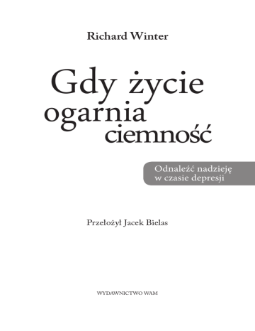3 Richard Winter Richard Winter Gdy życie ogarnia ciemność Odnaleźć nadzieję w czasie depresji Przełożył Jacek Bielas WYDAWNICTWO WAM WydaWnictWo WaM SPIS TREŚCI Podziękowania9 Wprowadzenie11 Część pierwsza Źródła smutku17 Rozdział pierwszy: Upadek w mrok Rozdział drugi: Wzrastanie ku światłu Rozdział trzeci: Chory na duszy Rozdział czwarty: Głęboko zakorzeniony smutek Rozdział piaty: Strata, smutek i żałoba Rozdział szósty: Samobójstwo 19 40 57 86 109 135 Część druga: Radzenie sobie w mroku i podążanie ku światłu149 Rozdział siódmy: Chwile załamania i święci ze skłonnościami samobójczymi Rozdział ósmy: Radzenie sobie z lękiem, obawą i strachem Rozdział dziewiąty: Gniew i zmagania z przebaczeniem Rozdział dziesiąty: Splątana sieć winy i wstydu Rozdział jedenasty: Zwiększanie odporności i droga do wyleczenia Rozdział dwunasty: Nadzieja i światło w ciemności 151 167 191 220 241 269 ANEKS: Czy siły zła mają swój udział w depresji? 295 Przypisy 321