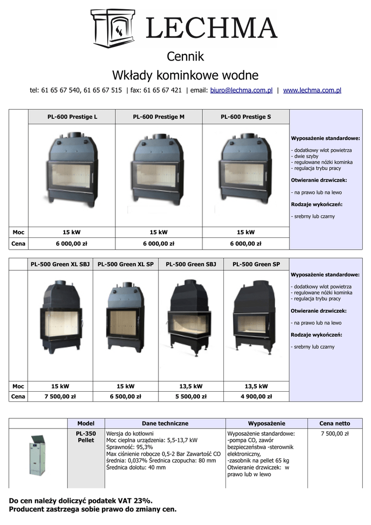 Cennik Wkłady kominkowe wodne tel: 61 65 67 540, 61 65 67 515 | fax: 61 65 67 421 | email: [email protected] | www.lechma.com.pl PL-600 Prestige L PL-600 Prestige M PL-600 Prestige S Wyposażenie standardowe: - dodatkowy wlot powietrza dwie szyby regulowane nóżki kominka regulacja trybu pracy Otwieranie drzwiczek: - na prawo lub na lewo Rodzaje wykończeń: - srebrny lub czarny Moc 15 kW 15 kW 15 kW Cena 6 000,00 zł 6 000,00 zł 6 000,00 zł PL-500 Green XL SBJ PL-500 Green XL SP PL-500 Green SBJ PL-500 Green SP Wyposażenie standardowe: - dodatkowy wlot powietrza - regulowane nóżki kominka - regulacja trybu pracy Otwieranie drzwiczek: - na prawo lub na lewo Rodzaje wykończeń: - srebrny lub czarny Moc 15 kW 15 kW 13,5 kW 13,5 kW Cena 7 500,00 zł 6 500,00 zł 5 500,00 zł 4 900,00 zł Model Dane techniczne PL-350 Pellet Wersja do kotłowni Moc cieplna urządzenia: 5,5-13,7 kW Sprawność: 95,3% Max ciśnienie robocze 0,5-2 Bar Zawartość CO średnia: 0,037% Średnica czopucha: 80 mm Średnica dolotu: 40 mm Do cen należy doliczyć podatek VAT 23%. Producent zastrzega sobie prawo do zmiany cen. Wyposażenie Wyposażenie standardowe: -pompa CO, zawór bezpieczeństwa -sterownik elektroniczny, -zasobnik na pellet 65 kg Otwieranie drzwiczek: w prawo lub w lewo Cena netto 7 500,00 zł Cennik Wkłady kominkowe wodne tel: 61 65 67 540, 61 65 67 515 | fax: 61 65 67 421 | email: [email protected] | www.lechma.com.pl Model Dane techniczne Wyposażenie Cena netto PL-400 Flat Nominalna moc cieplna: 16 kW - regulowany stojak Nominalna moc cieplna obiegu wodnego: 9 kW - wlot powietrza 100 mm Nominalna moc cieplna z otoczenia: 7 kW - chłodnica płaszcza wodnego Max ciśnienie robocze UZ: 2 bary - podwójna szyba sprawność: 82 % (pyrolityczna od strony Rodzaj kominka: stałopalny paleniska) Średnica czopucha: 200 mm 8 900,00 zł PL-300 Tower Ogrzewacz pomieszczeń Moc cieplna urządzenia: 9 kW Sprawność 75% Max ciśnienie robocze UZ: 2 bary 6 000,00 zł - wlot powietrza 100 mm - chłodnica płaszcza wodnego -podwójna szyba (pyrolityczna od stron PL-300 Kominek do zabudowy z szybami bez obudowy paleniska) Tower/Z1 zewnętrznej - sterownik RT-08 DUO z Moc cieplna urządzenia: 9 kW dwoma przepustnicami 100mm Sprawność: 75% Max ciśnienie robocze UZ: 2 Bar Rodzaje wykończeń: Zawartość CO średnia: 0,11% - srebrny lub czarny Średnica czopucha: 150 mm PL-300 Kominek do zabudowy bez szyb ozdobnych i Tower/Z2 obudowy zewnętrznej Otwieranie drzwiczek: - w prawo lub w lewo 5 300,00 zł 5 000,00 zł Moc cieplna urządzenia: 9 kW Sprawność: 75% Max ciśnienie robocze UZ 2 Bar Zawartość CO średnia: 0,11% Średnica czopucha: 150 mm PL-210 Eco SP Nominalna moc cieplna: 14 kW Nominalna moc cieplna obiegu wodnego: 11 kW Nominalna moc cieplna do otoczenia: 3 kW Max ciśnienie robocze UZ: 2 bary - regulowany stojak - wlot powietrza 100 mm - chłodnica płaszcza wodnego - podwójna szyba (w tym pyrolityczna od strony paleniska) 0,11% Średnica czopucha: 200 mm Rodzaje wykończeń: srebrny lub czarny Otwieranie drzwiczek: w prawo lub w lewo, gilotyna* wersja z podnoszoną szybą do góry gilotyna PL-210 Eco Sprawność: 76% Gilotyna* Rodzaj kominka: stałopalny Emisja spalin CO: Do cen należy doliczyć podatek VAT 23%. Producent zastrzega sobie prawo do zmiany cen. 7 700 zł / 8 700 zł * Cennik Wkłady kominkowe wodne tel: 61 65 67 540, 61 65 67 515 | fax: 61 65 67 421 | email: [email protected] | www.lechma.com.pl PL-190 Standard Lux PL-200 Exclusive SP PL-200 Exclusive SBJ PL-200 Exclusive SBD Wyposażenie standardowe: - chłodnica płaszcza wodnego stojak regulowany dodatkowy dolot powietrza szyber Wyposażenie dodatkowe: Moc 12 kW 15 kW 19 kW 22 kW UO UZ UO / UZ UO / UZ UO / UZ 4 600 zł 4 600 zł 4 900 zł - 5 500 zł 5 500 zł 5 800 zł - 6 500 zł 8 500 zł 8 000 zł PL-190 Standard PL-190 Panorama PL-190 PL-190 Pryzma Jednolita Pryzma Dzielona - dodatkowa wewnętrzna szyba pyrolityczna, tylko model PL-190 Standard Lux 500 zł Rodzaje wykończeń: - srebrny lub czarny Otwieranie drzwiczek: - na prawo lub na lewo PL-190 Panorama Plus Wyposażenie standardowe: - chłodnica płaszcza wodnego - dodatkowy dolot powietrza - szyber Wyposażenie dodatkowe: Moc 12 15 19 24 32 kW kW kW kW kW UO 3 3 3 4 4 700 700 900 100 600 UZ zł zł zł zł zł 4 4 4 5 5 600 600 800 000 500 UO zł zł zł zł zł PL-190 Korner Standard Lux 4 4 4 5 400 600 800 000 - UZ zł zł zł zł 5 5 5 5 300 500 700 900 - UO zł zł zł zł PL-190 Korner Standard 3 3 3 4 700 700 900 100 - UZ zł zł zł zł 4 4 4 5 600 600 800 000 - UO zł zł zł zł PL-190 Korner Panorama 3 3 3 3 300 500 700 900 - UZ zł zł zł zł 4 4 4 4 200 500 600 800 - zł zł zł zł 5 5 5 6 UO UZ 400 600 800 600 100 300 500 500 zł zł zł zł 6 6 6 7 - dodatkowa wewnętrzna szyba pyrolityczna, tylko modele zł PL-190 Standard, zł PL-190Standard Korner 200 zł zł - stojak regulowany 90 zł zł Rodzaje wykończeń: PL-190 Korner PL-190 Korner - złoty, srebrny lub czarny Pryzma Jednolita Pryzma Dzielona Otwieranie drzwiczek: - modele Standard, Standard Lux na prawo lub na lewo - pozostałe modele na lewo, na prawo dopłata 100 zł PL-190 Panorama Plus: - wymiary ramki ( 695x570mm ) Moc UO 8 kW 3 400 zł UZ UO UZ UO UZ UO UZ UO UZ 4 200 zł 3 000 zł 3 800 zł 3 400 zł 3 800 zł 3 000 zł 3 800 zł 2 700 zł 3 500 zł Do cen należy doliczyć podatek VAT 23%. Producent zastrzega sobie prawo do zmiany cen.