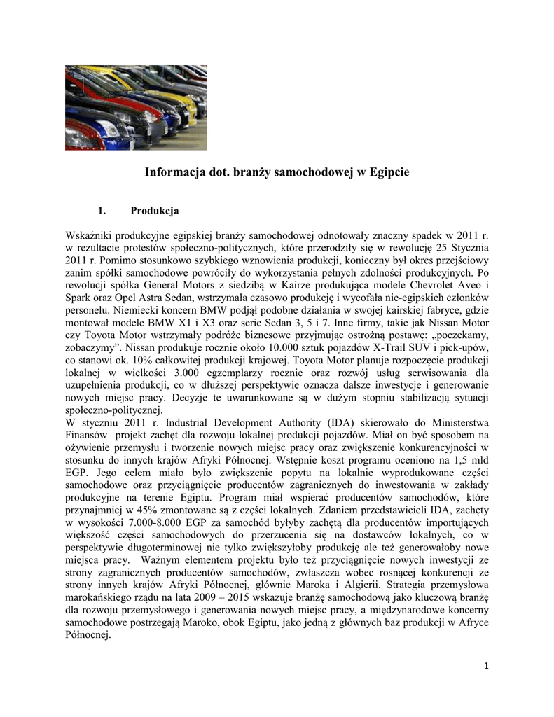 Informacja dot. branży samochodowej w Egipcie 1. Produkcja Wskaźniki produkcyjne egipskiej branży samochodowej odnotowały znaczny spadek w 2011 r. w rezultacie protestów społeczno-politycznych, które przerodziły się w rewolucję 25 Stycznia 2011 r. Pomimo stosunkowo szybkiego wznowienia produkcji, konieczny był okres przejściowy zanim spółki samochodowe powróciły do wykorzystania pełnych zdolności produkcyjnych. Po rewolucji spółka General Motors z siedzibą w Kairze produkująca modele Chevrolet Aveo i Spark oraz Opel Astra Sedan, wstrzymała czasowo produkcję i wycofała nie-egipskich członków personelu. Niemiecki koncern BMW podjął podobne działania w swojej kairskiej fabryce, gdzie montował modele BMW X1 i X3 oraz serie Sedan 3, 5 i 7. Inne firmy, takie jak Nissan Motor czy Toyota Motor wstrzymały podróże biznesowe przyjmując ostrożną postawę: „poczekamy, zobaczymy”. Nissan produkuje rocznie około 10.000 sztuk pojazdów X-Trail SUV i pick-upów, co stanowi ok. 10% całkowitej produkcji krajowej. Toyota Motor planuje rozpoczęcie produkcji lokalnej w wielkości 3.000 egzemplarzy rocznie oraz rozwój usług serwisowania dla uzupełnienia produkcji, co w dłuższej perspektywie oznacza dalsze inwestycje i generowanie nowych miejsc pracy. Decyzje te uwarunkowane są w dużym stopniu stabilizacją sytuacji społeczno-politycznej. W styczniu 2011 r. Industrial Development Authority (IDA) skierowało do Ministerstwa Finansów projekt zachęt dla rozwoju lokalnej produkcji pojazdów. Miał on być sposobem na ożywienie przemysłu i tworzenie nowych miejsc pracy oraz zwiększenie konkurencyjności w stosunku do innych krajów Afryki Północnej. Wstępnie koszt programu oceniono na 1,5 mld EGP. Jego celem miało było zwiększenie popytu na lokalnie wyprodukowane części samochodowe oraz przyciągnięcie producentów zagranicznych do inwestowania w zakłady produkcyjne na terenie Egiptu. Program miał wspierać producentów samochodów, które przynajmniej w 45% zmontowane są z części lokalnych. Zdaniem przedstawicieli IDA, zachęty w wysokości 7.000-8.000 EGP za samochód byłyby zachętą dla producentów importujących większość części samochodowych do przerzucenia się na dostawców lokalnych, co w perspektywie długoterminowej nie tylko zwiększyłoby produkcję ale też generowałoby nowe miejsca pracy. Ważnym elementem projektu było też przyciągnięcie nowych inwestycji ze strony zagranicznych producentów samochodów, zwłaszcza wobec rosnącej konkurencji ze strony innych krajów Afryki Północnej, głównie Maroka i Algierii. Strategia przemysłowa marokańskiego rządu na lata 2009 – 2015 wskazuje branżę samochodową jako kluczową branżę dla rozwoju przemysłowego i generowania nowych miejsc pracy, a międzynarodowe koncerny samochodowe postrzegają Maroko, obok Egiptu, jako jedną z głównych baz produkcji w Afryce Północnej. 1 Dotychczas projekt IDA nie został jednak wprowadzony w życie. W marcu 2011 r. Minister Handlu i Przemysłu ogłosił przesunięcie daty implementacji proponowanego projektu na czas bliżej nie określony. W październiku 2012 r. chińska spółka Geely Automobile rozpoczęła produkcję modelu Emgrand EC7 wspólnie z największym egipskim producentem samochodów Ghabbour Auto (GB Auto). Funkcjonująca w pobliżu Kairu fabryka zajmuje się montażem pojazdów w systemie CKD (completely knocked down). Plany nowej fabryki przewidują roczny eksport ok. 30.000 egzemplarzy na inne rynki północnoafrykańskie, co oznacza zwiększenie dochodów z eksportu. W lutym 2013 r. egipski rząd podjął decyzję o ponownym uruchomieniu państwowej firmy Nasr Car Manufacturing Company i zatrzymaniu procesu jej likwidacji. Zakład zarządzany będzie przez Ministerstwo Produkcji Wojskowej. Firma wstrzymała działalność produkcyjną w 2009 r., a rząd postanowił ją zlikwidować, gdy jej długi osiągnęły wartość ok. 2 mld EGP (296,95 mln USD). Firma GM Egypt będąca spółką zależną amerykańskiego producenta General Motors Company rozpoczęła produkcję marki Chevrolet Move. Do produkcji wykorzystane będą zestawy dostarczane przez chińską spółkę joint venture SAIC–GM-Wuling. GM zainwestował 10 mln USD w rozwój i instalację nowego sprzętu dla wsparcia planów produkcji blisko 5.000 pojazdów rocznie. Produkcja samochodów w Egipcie, 2011-2017 2011 Pojazdy ogółem, ilość egzemplarzy 2012s 2013p 2014p 2015p 2016p 2017p 81,731 56,480 58,855 62,752 67,777 76,094 83,050 Pojazdy ogółem, -30.0 zmiana % w skali roku -30.9 4.2 6.6 8.0 12.3 9.1 Samochody osobowe, 53,072 36,880 38,355 40,963 43,872 49,128 53,503 ilość egzemplarzy Samochody osobowe, -30.5 zmiana % w skali roku Pojazdy użytkowe, ilość egzemplarzy -30.5 4.0 6.8 7.1 12.0 8.9 28,659 19,600 20,500 21,789 23,906 26,965 29,548 Pojazdy użytkowe, -28.8 -31.6 zmiana % w skali roku s/p = szacunek/prognoza BMI źródło: OICA, za BMI 4.6 6.3 9.7 12.8 9.6 2. Sprzedaż Jednym z głównych powodów zmniejszenia sprzedaży samochodów w 2011 r. było, oprócz pogorszenia ogólnej sytuacji bezpieczeństwa i wzrostu kradzieży samochodów, ograniczenie liczby kredytów udzielanych przez banki na zakup pojazdów. Dwie trzecie zakupów samochodowych w Egipcie finansowane jest poprzez kredyty i utrudnienia w ich otrzymaniu odbiły się negatywnie na poziomie sprzedaży. W odpowiedzi niektóre z firm uruchomiły swoje 2 własne oddziały finansowania. Liderzy branży, koncerny GB Auto i Chrysler zapowiedziały udostępnienie usług kredytowych dla swoich klientów. Po 30% spadku sprzedaży 2011 r. rynek odbił się w 2012 r. odnotowując 13% wzrost, według raportu Automotive Marketing Information Council. Szczególnie dobre wyniki rynek osiągnął w II połowie 2012 r. Jednocześnie deprecjacja funta egipskiego, którego wartość w stosunku do dolara amerykańskiego osiągnęła w lutym 2013 r. poziom 6,691 utrudniła wejście na rynek 