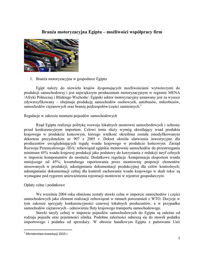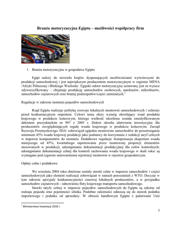 Branża motoryzacyjna Egiptu – możliwości współpracy firm 1. Branża motoryzacyjna w gospodarce Egiptu Egipt należy do niewielu krajów dysponujących możliwościami wytwórczymi do produkcji samochodowej i jest największym producentem motoryzacyjnym w regionie MENA /Afryki Północnej i Bliskiego Wschodu/. Egipski sektor motoryzacyjny uznawany jest za wysoce zdywersyfikowany – obejmuje produkcję samochodów osobowych, autobusów, mikrobusów, samochodów ciężarowych oraz branżę podzespołów/części zamiennych.1 Regulacje w zakresie montażu pojazdów samochodowych Rząd Egiptu realizuje politykę rozwoju lokalnych montowni samochodowych i ochrony przed konkurencyjnym importem. Celowi temu służy wymóg określający wsad produktu krajowego w produkcie końcowym, którego wielkość określona została zmodyfikowanym dekretem prezydenckim nr 907 z 2005 r. Dekret określa ułatwienia inwestycyjne dla producentów uwzględniających regułę wsadu krajowego w produkcie końcowym. Zarząd Rozwoju Przemysłowego /IDA/ zobowiązał egipskie montownie samochodów do przestrzegania minimum 45% wsadu krajowej produkcji jako podstawy do korzystania z redukcji taryf celnych w imporcie komponentów do montażu. Dodatkowe regulacje /kompensacja eksportem wsadu mniejszego od 45%; kwartalnego raportowania przez montownię proporcji elementów stosowanych w produkcji; udostępnianie dokumentacji produkcyjnej dla celów kontrolnych; udostępnianie dokumentacji celnej dla kontroli zachowania wsadu krajowego w skali roku/ są wymagane pod rygorem unieważnienia rejestracji montowni w rejestrze gospodarczym. Opłaty celne i podatkowe We wrześniu 2004 roku obniżone zostały stawki celne w imporcie samochodów i części samochodowych jako element realizacji zobowiązań w ramach porozumień z WTO. Decyzje w tym zakresie sprzyjały konkurencyjności cenowej lokalnych producentów, a w przypadku samochodów ciężarowych - odnowieniu floty krajowego transportu samochodowego. Stawki taryfy celnej w imporcie pojazdów samochodowych do Egiptu są zależne od rodzaju pojazdu oraz pojemności silnika. Podobne zależności odnoszą się do stawek podatku importowego i podatku od sprzedaży. W obrocie handlowym Egiptu z państwami Unii 1 Ministerstwo Inwestycji 2010 r. 1 Europejskiej stosowane są stawki celne importowe wynikające z uzgodnień w ramach Umowy Stowarzyszeniowej z 2004 r. /aktualna wysokość stawek wg celnej taryfy importowej Egiptu – www.customs.gov.eg /. Wymogiem zasadniczym jest import samochodu w roku jego produkcji. Udział branży motoryzacyjnej w GDP i rynku pracy Udział branży motoryzacyjnej w egipskim GDP nie jest znaczący – w 2010 roku wyniósł 2,85%.2 Wg szacunków udział produkcji motoryzacyjnej w GDP ulegnie zwiększeniu w perspektywie wzrostu inwestycji w branżach pracujących dla sektora motoryzacyjnego; produkcja sektora motoryzacyjnego stanowiła 16% działu wytwórczości. Sektor motoryzacyjny zatrudnia 75 tys. osób w sferze produkcyjnej /montaż pojazdów samochodowych i branża podzespołów/ oraz 150 tys. osób w sferze obsługi logistycznej /dystrybucji, usługach sprzedaży oraz serwisu i części zamiennych/.3 Egipski sektor motoryzacyjny dysponuje doświadczoną siłą roboczą o konkurencyjnych warunkach płacowych4. Kategoria Doświadczony inżynier Inżynier Wykwalifikowany pracownik Częściowo wykwalifikowany pracownik Pracownik pomocniczy Pracownik administracji Wartość średnia Miesięczne /USA $/ 1.017 458 256 174 126 166 211 wynagrodzenie Stawka za 1 godzinę /USA $/ 6,4 2,9 1,6 1,1 0,8 1,0 1,32 Źródło: Egyptian Auto Feeders Association /EAFA/, 2010 r. Inwestycje w branży motoryzacyjnej W Egipcie wprowadzono wiele regulacji prawnych wspierających politykę rządu na rzecz zwiększenia roli sektora prywatnego w gospodarce. Zasadnicze znaczenie dla rozwoju inwestycji w sektorze motoryzacyjnym miała ustawa o inwestycjach zagranicznych nr 8 z 1997 roku, oferująca ułatwienia i gwarancje stymulujące inwestycje prywatne. Wg danych GAFI /General Authority for Foreign Investment/ zakumulowana wartość inwestycji prywatnych w sektorze motoryzacyjnym w okresie od 2007 roku do czerwca 2010 roku wyniosła 1,1 mld dol. USA. Stanowią one 20% całkowitej wartości kapitałowej sektora motoryzacyjnego w Egipcie, wynoszącej 5,48 mld dol. USA zangażowanych w 451 firmach sektora. Wg danych GAFI z czerwca 2010 r. udział egipskiego kapitału prywatnego w sektorze motoryzacyjnym Egiptu wynosił 74%, a kapitału zagranicznego – 26%, w tym 2% z państw arabskich regionu MENA. 2 Oxford Economics, Egypt Sectoral Prospects Briefing, Spring 2010 Automotive Industry in Egypt – American Chamber of Commerce in Egypt, 2011 4 Industrial Development Authority /IDA/, Invest in Egypt, Industry Profiles, 2009 3 2 Strategia rozwoju egipskiego sektora motoryzacyjnego W listopadzie 2009 r. Zarząd Rozwoju Przemysłowego /IDA/ w Egipcie opracował długoterminową, 10-letnią strategię rozwoju przemysłu motoryzacyjnego w celu zwiększenia udziału lokalnej produkcji samochodowej i liczby egipskich producentów części samochodowych oraz umocnienia pozycji Egiptu jako konkurencyjnej bazy eksportowej komponentów samochodowych. Oczekująca na zatwierdzenie strategia przewiduje, że do 2020 r. nastąpi zwiększenie: udziału sektora motoryzacyjnego w GDP do ponad 10%; skali rocznej produkcji pojazdów samochodowych do 1 mln sztuk; wsadu produkcji krajowej w produkcie końcowym powodującego rozwój lokalnych producentów komponentów i ich eksportu; bezpośredniego i pośredniego zatrudnienia w sektorze do 3 mln osób; eksportu pojazdów do 300 tys. sztuk rocznie. 2. Analiza rynku pojazdów samochodowych w Egipcie W połowie 2010 roku w Egipcie zarejestrowanych było 5,6 mln pojazdów samochodowych.5 Samochody osobowe prywatne stanowią w Egipcie większość /48,7%/; drugą grupę stanowią motocykle /22,6%/, a następną samochody i ciągniki ciężarowe 