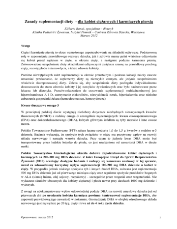 Zasady suplementacji diety - dla kobiet ciężarnych i karmiących piersią Elżbieta Banaś, specjalista – dietetyk Klinika Pediatrii i Żywienia, Instytut Pomnik – Centrum Zdrowia Dziecka, Warszawa. Marzec 2012 Wstęp Ciąża i karmienie piersią to okres wzmożonego zapotrzebowania na składniki odżywcze. Podstawową rolę w zapewnieniu prawidłowego rozwoju dziecka, jak i zdrowia mamy pełni właściwe odżywianie się kobiet przed zajściem w ciążę, w okresie ciąży, a następnie podczas karmienia piersią. Zrównoważone uzupełnianie diety składnikami odżywczymi zwiększa szansę na prawidłowy przebieg ciąży, rozwój płodu i niemowlęcia, a także zdrowie kobiety. Pomimo niewątpliwych zalet suplementacji w okresie prenatalnym i podczas laktacji należy zawsze umacniać przekonanie, że suplementy diety są niezwykle cennym, ale jedynie uzupełnieniem właściwie skomponowanej diety. Zaleca się, aby uzupełnianie diety podlegało indywidualnemu dostosowaniu do stanu zdrowia kobiety i jej nawyków żywieniowych oraz było nadzorowane przez lekarza lub dietetyka. Przeciwwskazaniem do stosowania suplementacji multiwitaminowej jest hiperwitaminoza A i D, zatrzymanie elektrolitów, niewydolność nerek, hiperkalcemia oraz niektóre zaburzenia gospodarki żelaza (hemochromatoza, hemosyderoza). Kwasy tłuszczowe omega-3 W przeciętnej polskiej diecie występują niedobory dotyczące niezbędnych nienasyconych kwasów tłuszczowych (NNKT) z rodziny omega–3 szczególnie najcenniejszych: kwasu eikozapentaenowego (EPA) oraz dokozaheksaenowego (DHA), których głównym źródłem są ryby morskie i inne owoce morza. Polskie Towarzystwo Pediatryczne (PTP) zaleca łączne spożycie 1,0 do 1,5 g kwasów z rodziny n-3 dziennie. Badania wykazują, że spożycie tych związków w ciąży ma pozytywny wpływ na rozwój układu nerwowego i narządu wzroku dziecka. Przy czym to jedynie kwas DHA może być transportowany przez ludzkie łożysko do płodu, co jest uzależnione od zawartości DHA w diecie matki. Polskie Towarzystwo Ginekologiczne określa dobowe zapotrzebowanie kobiet ciężarnych i karmiących na 200-300 mg DHA dziennie. Z kolei Europejski Urząd do Spraw Bezpieczeństwa Żywności (2010) oceniając dostępne badania i rodzący się konsensus naukowy w tej sprawie, uznał za udowodniony korzystny wpływ suplementacji 100-200 mg DHA dziennie u kobiet w ciąży. W przypadku jednak niskiego spożycia ryb i innych źródeł DHA, zalecana jest suplementacja 500 mg DHA dziennie już od pierwszego miesiąca ciąży oraz regularne spożycie produktów bogatych w ALA (siemię lniane, olej sojowy, rzepakowy) - szczególnie przez weganki oraz wegetarianki. Nie wykazano skutków ubocznych dla kobiety ciężarnej i płodu nawet przy dawkach 1000 mg dziennie i wyższych. Z uwagi na udokumentowany wpływ odpowiedniej podaży DHA na rozwój umysłowy dziecka już od pierwszych dni po urodzeniu kobieta karmiąca powinna kontynuować suplementację DHA, aby zapewnić prawidłową jego zawartość w pokarmie. Gromadzenie DHA w obrębie ośrodkowego układu nerwowego jest najwyższe po 20 tyg. ciąży i trwa aż do 4 roku życia dziecka. Opracowano: marzec 2012 1 Ze względu na ryzyko zanieczyszczenia ryb morskich metalami ciężkimi (w tym rtęcią lub/i dioksynami), które mogą być szkodliwe dla płodu zaleca ograniczenie spożycia łososia i tuńczyka do 1 porcji w tygodniu przez kobiety ciężarne i karmiące piersią. W przypadku trudności z dostarczeniem odpowiednich ilości tego składnika, PTG zaleca wykorzystanie suplementów diety o odpowiedniej jakości pod kątem zanieczyszczeń metalami ciężkimi oraz o kontrolowanej zawartości EPA+DHA. Składniki Mineralne i Witaminy Uwzględniając fakt, że zapotrzebowanie na składniki odżywcze w okresie ciąży i karmienia znacznie wzrasta, Polskie Towarzystwo Ginekologiczne (PTG) uznaje za zasadne stosowanie w II i III trymestrze ciąży preparatów zawierających między innymi: żelazo i jod, kwas foliowy, witaminę D, A i E, magnez, wapń. Liczne badania naukowe wykazały, że suplementacja witamin w całym okresie prenatalnym może zmniejszać ryzyko przedwczesnego porodu, urodzenia dziecka o mniejszej masie urodzeniowej oraz wad wrodzonych. Kwas foliowy W okresie prekoncepcyjnym u kobiet zaleca się suplementację kwasem foliowym w celu zmniejszania ryzyka rozwoju wady cewy nerwowej, przy czym efekt profilaktyczny jest doskonale udowodniony naukowo. Instytut Żywienia i Żywności stwierdza zapotrzebowanie na 600 µg kwasu foliowego w ciąży. Dlatego oprócz regularnego spożywania zielonych warzyw liściastych oraz roślin strączkowych zaleca suplementację kwasu foliowego w ciąży w wysokości 400 µg dziennie, podczas gdy zapotrzebowanie . Żelazo Amerykański National Research Council zaleca w okresie ciąży dawkę 30 mg/dobe dla kobiet bez niedokrwistości. Wg Stanowiska Zespołu Ekspertów PTG z 2010 zaleca raczej długotrwałe suplementowanie niskimi dawkami uzupełniającymi wzrost zapotrzebowania w ciąży (wzrost zapotrzebowania wynosi ok 10 mg dziennie). Cynk Zapotrzebowanie na cynk u kobiet w ciąży i karmiących nie wzrasta w stosunku do okresu przed ciążą jednak w przypadku diety ubogiej w cynk, objawy niedoboru rozwijają się stosunkowo szybko i objawiają się zaburzeniami w rozwoju i funkcjonowaniu układu nerwowego u płodu oraz wzrostem ryzyka urodzenia dziecka o małej masie urodzeniowej. Ograniczenie wchłaniania cynku może nastąpić wskutek wysokiego spożycia produktów zbożowych (fitynianów), błonnika, wapnia lub być wynikiem palenia papierosów czy picia alkoholu. Witamina A Podczas ciąży nie następuje wzrost zapotrzebowania na witaminę A, natomiast wzrasta prawie dwukrotnie u kobiet karmiących piersią (do 1300 µg retinolu). Roślinne formy witaminy A (betakaroten) nie są toksyczne nawet w dużych dawkach i z tego powodu są uważane za bezpieczne. Jod Polska Komisja Kontroli Za