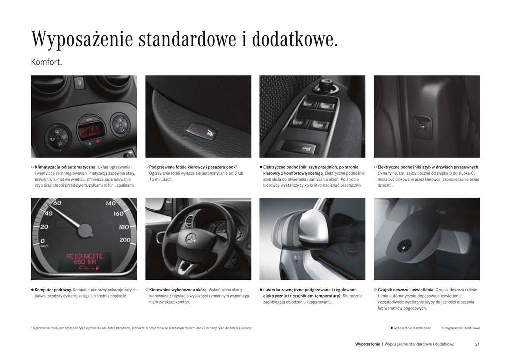 Wyposażenie standardowe i dodatkowe. Komfort. ○ Klimatyzacja półautomatyczna. Układ ogrzewania i wentylacji ze zintegrowaną klimatyzacją zapewnia stały, przyjemny klimat we wnętrzu, zmniejsza zaparowywanie szyb oraz chroni przed pyłem, pyłkami roślin i spalinami. ○ Podgrzewane fotele kierowcy i pasażera obok1. Ogrzewanie foteli wyłącza się automatycznie po 5 lub 15 minutach. ● Elektryczne podnośniki szyb przednich, po stronie kierowcy z komfortową obsługą. Elektryczne podnośniki szyb służą do otwierania i zamykania okien. Po stronie kierowcy wystarczy tylko krótko nacisnąć przełącznik. ○ Elektryczne podnośniki szyb w drzwiach przesuwnych. Okna tylne, tzn. szyby boczne od słupka B do słupka C, mogą być blokowane przez kierowcę (zabezpieczenie przed dziećmi). ● Komputer podróżny. Komputer podróżny pokazuje zużycie paliwa, przebyty dystans, zasięg lub średnią prędkość. ○ Kierownica wykończona skórą. Wykończona skórą kierownica z regulacją wysokości i zmiennym wspomaganiem zwiększa komfort. ● Lusterka zewnętrzne podgrzewane i regulowane elektrycznie (z czujnikiem temperatury). Skutecznie zapobiegają oblodzeniu i zaparowaniu. ○ Czujnik deszczu i oświetlenia. Czujnik deszczu i oświetlenia automatycznie dopasowuje oświetlenie i częstotliwość wycierania szyby do jasności otoczenia lub warunków pogodowych. 1 Ogrzewanie foteli jest dostępne tylko łącznie dla obu foteli przednich, jednakże w połączeniu ze składanym fotelem obok kierowcy tylko dla fotela kierowcy. ● wyposażenie standardowe ○ wyposażenie dodatkowe Wyposażenie | Wyposażenie standardowe i dodatkowe Wyposażenie standardowe i dodatkowe. Funkcjonalność. ○ System nawigacyjny z radiem. Wyposażony w zintegrowany wyświetlacz z ekranem dotykowym i radio DAB+, zamontowany w konsoli środkowej. Z interfejsem Bluetooth®, złączem USB, złączem Aux-in i czytnikiem kart pamięci micro SD. ○ Kamera cofania. Kamera z wyświetlaczem w lusterku wewnętrznym umożliwia obserwację obszaru z tyłu samochodu, wspomagając kierowcę podczas parkowania i manewrowania. Dodatkowym wsparciem są wyświetlane dynamiczne linie pomocnicze. ○ Podłokietnik ze schowkiem. W miękkim podłokietniku na konsoli środkowej znajduje się duży schowek, mieszczący nawet 1,5-litrową butelkę. ● Schowek nad szybą przednią. Otwarty schowek nad głowami kierowcy i pasażera obok ma pojemność 12,6 l. ○ Schowek nad głowami w przestrzeni pasażerskiej1. Trzy równe przegródki o łącznej pojemności 24,4 l tworzą praktyczny i bezpieczny schowek. ○ Schowek w okładzinie drzwi przesuwnych2. Wewnętrzna okładzina drzwi przesuwnych kryje schowek na osobiste przedmioty, zwiększając miejsce w przestrzeni pasażerskiej. ○ Schowki w podłodze przestrzeni pasażerskiej3. W podłodze tylnej części przestrzeni pasażerskiej można zintegrować dwa schowki. Każdy z nich ma pojemność ok. 6,6 l. ○ Radio. Opcjonalne radio LCD posiada odtwarzacz płyt CD oraz złącza Aux-in i USB. Umożliwia również telefonowanie za pomocą interfejsu Bluetooth® i streaming audio. w połączeniu z drzwiami przesuwnymi po obu stronach. 2 Wyposażenie standardowe dla Citana Tourer z homologacją osobową (M1). Tylko z podwyższonym standardem wykończenia wnętrza. 3 Tylko z podwyższonym standardem wykończenia wnętrza. 4 Wyposażenie dostępne tylko dla Citana Tourer z homologacją ciężarową (N1). 5 Wyposażenie dostępne tylko dla Citana Tourer w wersji długiej. 1 Tylko Wyposażenie | Wyposażenie standardowe i dodatkowe ● wyposażenie standardowe ○ wyposażenie dodatkowe ○ Tempomat. Tempomat utrzymuje prędkość ustawioną przez kierowcę. Rezultat: większy komfort jazdy, mniejsze zużycie paliwa. ○ Składane stoliki na oparciach foteli kierowcy i pasażera obok. Odporne na zarysowanie składane stoliki z uchwytem na kubek nadają się do spożywania posiłków, mogą też pełnić funkcję półek. ○ Składany fotel pasażera obok kierowcy4. Oparcie fotela obok kierowcy można złożyć, otrzymując w ten sposób powierzchnię ładunkową o długości do 2,8 m. ● Kanapa w 1. rzędzie tylnym składana 1/3:2/3 z zagłówkami. 3-osobowa kanapa, składana w proporcji 1/3 do 2/3, umożliwia również transport dużych przedmiotów. ○ Drzwi tylne otwierane do 180°. Uniwersalność Citana Tourer i drzwi tylne otwierane do 180° zapewnią Państwu swobodę w załadunku i przy pracy. ○ Dach panoramiczny. Dach panoramiczny i dwa uchylne okna dachowe5 zapewniają przyjemną atmosferę – dzięki możliwości szybkiego dostosowania klimatu i większemu rozświetleniu wnętrza samochodu. ○ Wykładzina dywanowa w bagażniku. Wykładzina dywanowa w bagażniku chroni bagaż i zapewnia atrakcyjny wygląd ogólny. ○ Siatka zabezpieczająca bagaż i chroniąca pasażerów. Siatka bagażowa pewnie utrzymuje lekkie ładunki na swoim miejscu, zwiększając w ten sposób bezpieczeństwo w przestrzeni pasażerskiej. Wyposażenie | Wyposażenie standardowe i dodatkowe Wyposażenie standardowe i dodatkowe. Funkcjonalność. ● Drzwi przesuwne po prawej stronie z oknem uchylnym. Prawe drzwi przesuwne z komfortowym otwieraniem, oknem wentylacyjnym i szerokim stopniem ułatwiają wsiadanie do auta. ● Przeszklona klapa tylna1. Przeszklona klapa tylna z podgrzewaną szybą i wycieraczką zapewnia dobrą widoczność, a także ułatwia cofanie i manewrowanie. ● Ogrzewanie/wycieraczka szyby tylnej. Ogrzewanie/ wycieraczka szyby tylnej gwarantuje dobrą widoczność do tyłu nawet w zimne dni i ułatwia manewrowanie. ○ Barwione szyby z tyłu. Mocno przyciemnione szyby za słupkiem B zmniejszają nagrzewanie wnętrza. Chromowana listwa ozdobna2 przy dolnej krawędzi szyby tylnej zwiększa atrakcyjność wizualną. ○ Drzwi przesuwne po lewej stronie z oknem uchylnym3. Lewe drzwi przesuwne z komfortowym otwieraniem, oknem wentylacyjnym i szerokim stopniem ułatwiają w