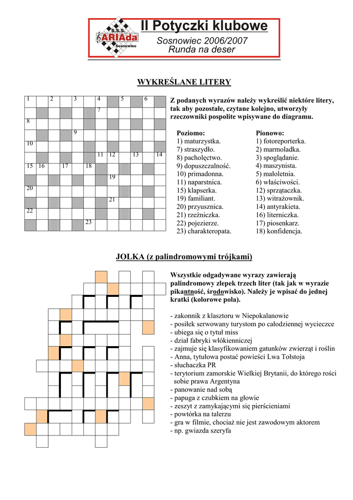 II Potyczki klubowe Sosnowiec 2006/2007 WYKREŚLANE LITERY 1 2 3 4 5 6 Z podanych wyrazów naleŜy wykreślić niektóre litery, tak aby pozostałe, czytane kolejno, utworzyły rzeczowniki pospolite wpisywane do diagramu. 7 8 9 10 11 12 15 16 17 18 19 20 21 22 23 13 14 Poziomo: 1) maturzystka. 7) straszydło. 8) pacholęctwo. 9) dopuszczalność. 10) primadonna. 11) naparstnica. 15) klapserka. 19) familiant. 20) przyusznica. 21) rzeźniczka. 22) pojezierze. 23) charakteropata. Pionowo: 1) fotoreporterka. 2) marmoladka. 3) spoglądanie. 4) maszynista. 5) małoletnia. 6) właściwości. 12) sprzątaczka. 13) witraŜownik. 14) antyrakieta. 16) literniczka. 17) piosenkarz. 18) konfidencja. JOLKA (z palindromowymi trójkami) Wszystkie odgadywane wyrazy zawierają palindromowy zlepek trzech liter (tak jak w wyrazie pikantność, środowisko). NaleŜy je wpisać do jednej kratki (kolorowe pola). - zakonnik z klasztoru w Niepokalanowie - posiłek serwowany turystom po całodziennej wycieczce - ubiega się o tytuł miss - dział fabryki włókienniczej - zajmuje się klasyfikowaniem gatunków zwierząt i roślin - Anna, tytułowa postać powieści Lwa Tołstoja - słuchaczka PR - terytorium zamorskie Wielkiej Brytanii, do którego rości sobie prawa Argentyna - panowanie nad sobą - papuga z czubkiem na głowie - zeszyt z zamykającymi się pierścieniami - powtórka na talerzu - gra w filmie, chociaŜ nie jest zawodowym aktorem - np. gwiazda szeryfa JOLKA NaleŜy odgadnąć niesymetryczne rozmieszczenie czarnych pól. T Y L K O W E L W O W I E - podrząd waleni obejmujący pływacze, płetwale - narzekanie, utyskiwanie - gatunek śliwy - Magdalena, córka Wojciecha Kossaka - Leon zawodowiec - ma ją energiczny chłop - nazwisko poprzednika Sławomira Skrzypka - postępowanie, robienie - gipsowy – zakładany na złamaną kończynę - pasterz z lassem - dział kryminalistyki zajmujący się badaniem linii papilarnych w celu ustalenia toŜsamości - uczucie psychicznej albo fizycznej niewygody - ostatnim w Rosji był Mikołaj II - dział przemysłu spoŜywczego zajmującego się produkcją jagły, grysiku WSZYSTKIE CHWYTY DOZWOLONE Ujawniono wszystkie litery C. Do diagramu naleŜy wpisać anagramy (wyrazy utworzone ze wszystkich liter innego słowa, np. ławka – kawał), metagramy (wyrazy ze zamienioną jedną literą, np. aktówka – altówka), plus albo minus 1 (wyraz z dodaną lub odjętą literą, np. parka – parkan, parka – paka) oraz synonimy (np. bonifikata – rabat) podanych wyrazów. Wszystkie wpisywane wyrazy to rzeczowniki pospolite (pisane małą literą). C C C C C C C - aromat - bóŜnica - bryła - celnik - deseń - doker - fachman - gniew - harlekin - kasza - kresy - łaźnia - macierz - nagana - odkrywka - odłamek - osiłek - palik - panika - paszka - plecy - Rysiek - sosik - sweter - szalka - sznurek - szpara - ścianka - tarczka - trzask - tundra - turkuć - turynka - winieta