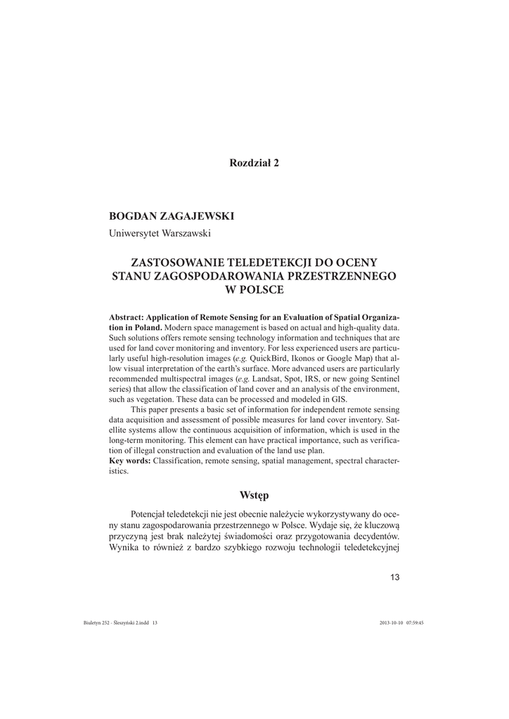 Rozdział 2 BOGDAN ZAGAJEWSKI Uniwersytet Warszawski ZASTOSOWANIE TELEDETEKCJI DO OCENY STANU ZAGOSPODAROWANIA PRZESTRZENNEGO W POLSCE Abstract: Application of Remote Sensing for an Evaluation of Spatial Organization in Poland. Modern space management is based on actual and high-quality data. Such solutions offers remote sensing technology information and techniques that are used for land cover monitoring and inventory. For less experienced users are particularly useful high-resolution images (e.g. QuickBird, Ikonos or Google Map) that allow visual interpretation of the earth’s surface. More advanced users are particularly recommended multispectral images (e.g. Landsat, Spot, IRS, or new going Sentinel series) that allow the classification of land cover and an analysis of the environment, such as vegetation. These data can be processed and modeled in GIS. This paper presents a basic set of information for independent remote sensing data acquisition and assessment of possible measures for land cover inventory. Satellite systems allow the continuous acquisition of information, which is used in the long-term monitoring. This element can have practical importance, such as verification of illegal construction and evaluation of the land use plan. Key words: Classification, remote sensing, spatial management, spectral characteristics. Wstęp Potencjał teledetekcji nie jest obecnie należycie wykorzystywany do oceny stanu zagospodarowania przestrzennego w Polsce. Wydaje się, że kluczową przyczyną jest brak należytej świadomości oraz przygotowania decydentów. Wynika to również z bardzo szybkiego rozwoju technologii teledetekcyjnej 13 Biuletyn 252 - Śleszyński 2.indd 13 2013-10-10 07:59:45 i jej powszechnego dostępu do wysokorozdzielczych oraz wielospektralnych danych (szczególnie po przystąpieniu Polski do NATO). Wcześniej dane lotnicze były traktowane jako materiał poufny i dostępność zdjęć była ograniczona, natomiast zobrazowania satelitarne były bardzo drogie, a procedury przetwarzania obrazów wymagały zaawansowanych algorytmów i specjalistycznego oprogramowania. Po przystąpieniu Polski do NATO coraz szerszym strumieniem zaczęły płynąć do kraju zarówno dane, jak i specjalistyczne oprogramowanie oraz sprzęt komputerowy. Jeszcze na początku 2000 r. komputery osobiste klasy PC w wielu przypadkach nie gwarantowały możliwości przetwarzania danych, które zapisane były w dużych plikach. Większość profesjonalistów wykorzystywało stacje robocze, najczęściej działające pod systemem operacyjnym UNIX. Ograniczało to niewątpliwie popularyzację oraz rozwój teledetekcji. Znaczne zmiany nastąpiły wraz z upowszechnieniem Internetu oraz zwiększeniem możliwości operacyjnych komputerów klasy PC. Od kilku lat darmowy dostęp do legalnych danych on-line, jak i open-source’owych programów geoinformatycznych pozwala na szerokie wykorzystywanie technologii geoinformatycznych przede wszystkim przez studentów, jak i mniej zaawansowanych użytkowników danych teledetekcyjnych. Jest to ważny element popularyzacji teledetekcji, gdyż absolwenci szkół wyższych zasilają podstawowe komórki administracji samorządowej oraz różnego rodzaju agencje, wykorzystując do swoich analiz zdjęcia lotnicze, satelitarne oraz ich produkty w postaci, np. ortofotomap, cyfrowych map i wektorowych warstw informatycznych. Należy jednak zwrócić uwagę na to, że zainteresowanie teledetekcją na szczeblach administracji publicznej nie jest duże, gdyż urzędnicy koncentrują się na wytycznych prawnych i urzędowo ustalonych schematach postępowania. Natomiast dane teledetekcyjne są wykorzystywane bardzo często przez grupy niezależnych użytkowników, np. w organizacjach typu NGO. Kluczowym elementem w analizie potencjału danych teledetekcyjnych jest poznanie ograniczeń technicznych, jakie wynikają ze stosowania technologii lotniczej i satelitarnej. Pierwszym i zasadniczym elementem jest to, że pozyskanie informacji bazuje na rejestracji fali (najczęściej elektromagnetycznej) odbitej lub wyemitowanej przez badany obiekt. Źródłem promieniowania jest najczęściej słońce, które emituje całe spektrum promieniowania elektromagnetycznego; od fal bardzo krótkich (np. promieniowanie rentgenowskie, gamma), aż po metrowe fale. Atmosfera ziemska przepuszcza tylko niewielką ilość promieniowania w zakresie widzialnym (VIS), bliskiej (NIR), średniej (SWIR) oraz termalnej (TIR) podczerwieni oraz centy-, metrowe 14 Biuletyn 252 - Śleszyński 2.indd 14 2013-10-10 08:00:05 długości w zakresie mikrofal. Do specjalistycznych zadań (np. analizy zanieczyszczeń ropopochodnych) w zobrazowaniach lotniczych wykorzystuje się zakres ultrafioletu (UV). Kluczowym elementem przed podjęciem decyzji o wykorzystaniu danych teledetekcyjnych jest określenie potrzeb i możliwości technicznych. Jednym z kluczowych zagadnień jest rozdzielczość przestrzenna, która definiowana jest najmniejszą wielkością zobrazowanej powierzchni, czyli wielkością piksela. W przypadku satelitów wysokorozdzielczych (np. Ikonos, QuickBird) piksel ma wielkość rzędu 0,6 do 4 m. Satelity środowiskowe cechują się większą liczbą kanałów, ale wielkość piksela waha się w granicach 4-1000 m, np. WorldView 2: 4m, Landsat ETM+: 15-60 m, SPOT 10-1000 m. Największy piksel mają obrazy pozyskane z sensorów meteorologicznych, gdyż wynosi on 1-3 km, np. 1-3 km MSG SEVIRI lub 1,1 km NOAA AVHRR. Rozmiar piksela wynika najczęściej z rozdzielczości spektralnej sensora, czyli szerokości połówkowej zastosowanych filtrów, a więc zakresu promieniowania elektromagnetycznego, jaki jest przepuszczany przez filtr i dociera do detektora. Dobór szerokości filtrów podyktowany jest przeznaczeniem sensora do określonych zadań, gdyż poszczególne obiekty w sposób charakterystyczny absorbują lub odbijają promieniowanie w ściśle określonych długościach promieniowania (ryc. 1). Kon