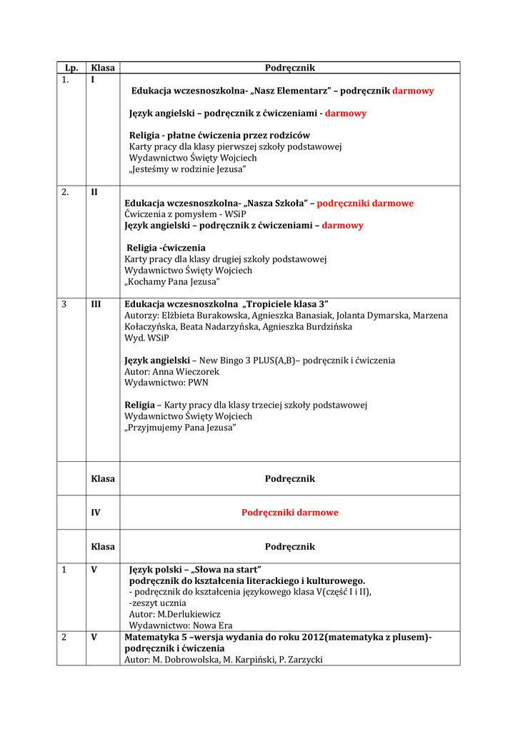 Lp. 1. Klasa I Podręcznik Edukacja wczesnoszkolna- „Nasz Elementarz” – podręcznik darmowy Język angielski – podręcznik z ćwiczeniami - darmowy Religia - płatne ćwiczenia przez rodziców Karty pracy dla klasy pierwszej szkoły podstawowej Wydawnictwo Święty Wojciech „Jesteśmy w rodzinie Jezusa” 2. II Edukacja wczesnoszkolna- „Nasza Szkoła” – podręczniki darmowe Ćwiczenia z pomysłem - WSiP Język angielski – podręcznik z ćwiczeniami – darmowy Religia -ćwiczenia Karty pracy dla klasy drugiej szkoły podstawowej Wydawnictwo Święty Wojciech „Kochamy Pana Jezusa” 3 III Edukacja wczesnoszkolna „Tropiciele klasa 3” Autorzy: Elżbieta Burakowska, Agnieszka Banasiak, Jolanta Dymarska, Marzena Kołaczyńska, Beata Nadarzyńska, Agnieszka Burdzińska Wyd. WSiP Język angielski – New Bingo 3 PLUS(A,B)– podręcznik i ćwiczenia Autor: Anna Wieczorek Wydawnictwo: PWN Religia – Karty pracy dla klasy trzeciej szkoły podstawowej Wydawnictwo Święty Wojciech „Przyjmujemy Pana Jezusa” Klasa IV Klasa 1 V 2 V Podręcznik Podręczniki darmowe Podręcznik Język polski – „Słowa na start” podręcznik do kształcenia literackiego i kulturowego. - podręcznik do kształcenia językowego klasa V(część I i II), -zeszyt ucznia Autor: M.Derlukiewicz Wydawnictwo: Nowa Era Matematyka 5 –wersja wydania do roku 2012(matematyka z plusem)podręcznik i ćwiczenia Autor: M. Dobrowolska, M. Karpiński, P. Zarzycki 3 V 4 V 5 V 6 V 7 V 8 V 9 V 10 V Klasa 1 VI 2 VI 3 VI 4 VI 5 VI 6 7 VI VI 8 VI 9 10 VI VI Wydawnictwo: GWO Historia - „Wczoraj i dziś” podręcznik i ćwiczenia. Autor: G.Wojciechowski Wydawnictwo: Nowa Era Przyroda – „Przyrodo witaj” –podręcznik i ćwiczenia Autor: E.Kłos, W. Kofta, A.Melson, E.Gromek, E.Laskowska Wydawnictwo: WSiP Język angielski –Discover 2-podrecznik i ćwiczenia Autor: J.Wildman, I. Hearn Wydawnictwo: PEARSON Zajęcia komputerowe – ( kontynuacja podręcznika z klasy IV) Religia – Karty pracy dla klasy piątej szkoły podstawowej Wydawnictwo Święty Wojciech „Wierzę w Boga” Plastyka 5 -zeszyt ćwiczeń dla V kl. ( autor: B.Neubart) Wydawnictwo: WSiP Muzyka – „I gra muzyka” – kontynuacja podręcznika z klasy IV Ćwiczenia – klasa V Autor: M.Gromek, G Kilbach Wydawnictwo: Nowa Era Zajęcia techniczne- kontynuacja podręcznika z ćwiczeniami z klasy IV Podręcznik Język polski - „Słowa na start” podręcznik do kształcenia literackiego i kulturowego. I ćwiczenia (część I i II), Autor: M. Derlukiewicz Wydawnictwo: Nowa Era Matematyka 6(matematyka z plusem)– podręcznik i ćwiczenia Autor: M. Dobrowolska, M. Jucewicz, M. Karpiński, P. Zarzycki Wydawnictwo: GWO Historia „Wczoraj i dziś” podręcznik i ćwiczenia ( cz. I i II). Autor: G.Wojciechowski Wydawnictwo: Nowa Era Przyroda – „Przyrodo witaj” - podręcznik i ćwiczenia. Autorzy: E.Kłos, W. Kofta, A.Melson, E.Gromek, E.Laskowska Wydawnictwo: WSiP Język angielski–Discover 3-podrecznik i ćwiczenia Autor: J.Wildman, I. Hearn Wydawnictwo: PEARSON Zajęcia komputerowe– ( kontynuacja podręcznika z klasy IV i V) Religia – Karty pracy dla klasy szóstej szkoły podstawowej Wydawnictwo Święty Wojciech „Wierzę w Kościół” Plastyka 5 -zeszyt ćwiczeń dla VI kl. ( autor: B.Neubart) Wydawnictwo: WSiP Zajęcia techniczne - ( kontynuacja podręcznika z ćwiczeniami z klasy IV ) Muzyka – „I gra muzyka” – kontynuacja podręcznika i ćwiczeń z klasy IV Wydawnictwo: Nowa Era
