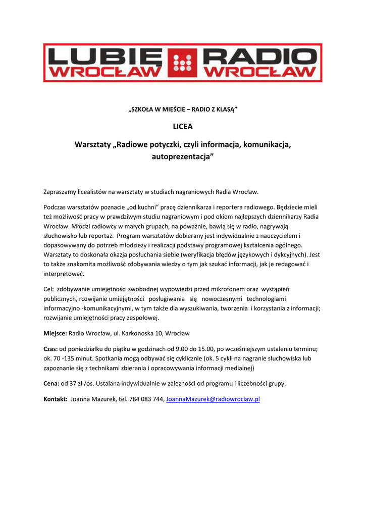„SZKOŁA W MIEŚCIE – RADIO Z KLASĄ” LICEA Warsztaty „Radiowe potyczki, czyli informacja, komunikacja, autoprezentacja” Zapraszamy licealistów na warsztaty w studiach nagraniowych Radia Wrocław. Podczas warsztatów poznacie „od kuchni” pracę dziennikarza i reportera radiowego. Będziecie mieli też możliwość pracy w prawdziwym studiu nagraniowym i pod okiem najlepszych dziennikarzy Radia Wrocław. Młodzi radiowcy w małych grupach, na poważnie, bawią się w radio, nagrywają słuchowisko lub reportaż. Program warsztatów dobierany jest indywidualnie z nauczycielem i dopasowywany do potrzeb młodzieży i realizacji podstawy programowej kształcenia ogólnego. Warsztaty to doskonała okazja posłuchania siebie (weryfikacja błędów językowych i dykcyjnych). Jest to także znakomita możliwość zdobywania wiedzy o tym jak szukać informacji, jak je redagować i interpretować. Cel: zdobywanie umiejętności swobodnej wypowiedzi przed mikrofonem oraz wystąpień publicznych, rozwijanie umiejętności posługiwania się nowoczesnymi technologiami informacyjno -komunikacyjnymi, w tym także dla wyszukiwania, tworzenia i korzystania z informacji; rozwijanie umiejętności pracy zespołowej. Miejsce: Radio Wrocław, ul. Karkonoska 10, Wrocław Czas: od poniedziałku do piątku w godzinach od 9.00 do 15.00, po wcześniejszym ustaleniu terminu; ok. 70 -135 minut. Spotkania mogą odbywać się cyklicznie (ok. 5 cykli na nagranie słuchowiska lub zapoznanie się z technikami zbierania i opracowywania informacji medialnej) Cena: od 37 zł /os. Ustalana indywidualnie w zależności od programu i liczebności grupy. Kontakt: Joanna Mazurek, tel. 784 083 744, [email protected]