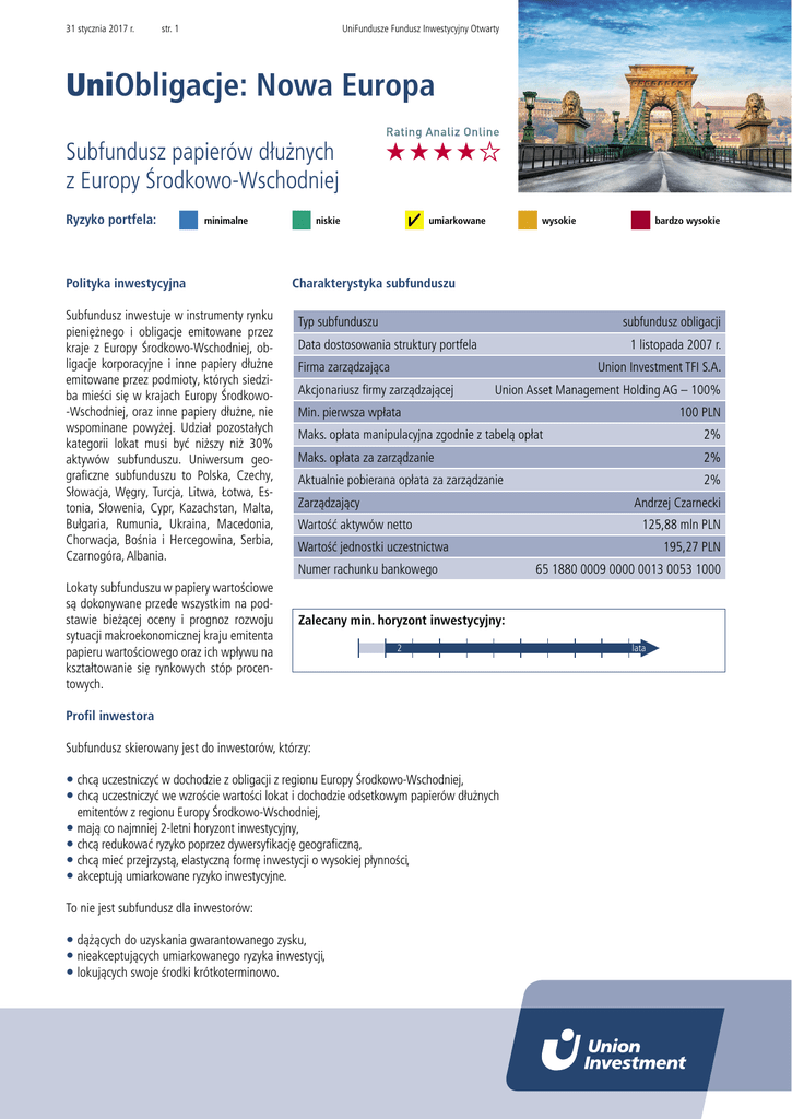 31 stycznia 2017 r. str. 1 UniFundusze Fundusz Inwestycyjny Otwarty UniObligacje: Nowa Europa Subfundusz papierów dłużnych z Europy Środkowo-Wschodniej Ryzyko portfela: minimalne Polityka inwestycyjna Subfundusz inwestuje w instrumenty rynku pieniężnego i obligacje emitowane przez kraje z Europy Środkowo-Wschodniej, obligacje korporacyjne i inne papiery dłużne emitowane przez podmioty, których siedziba mieści się w krajach Europy Środkowo-Wschodniej, oraz inne papiery dłużne, nie wspominane powyżej. Udział pozostałych kategorii lokat musi być niższy niż 30% aktywów subfunduszu. Uniwersum geograficzne subfunduszu to Polska, Czechy, Słowacja, Węgry, Turcja, Litwa, Łotwa, Estonia, Słowenia, Cypr, Kazachstan, Malta, Bułgaria, Rumunia, Ukraina, Macedonia, Chorwacja, Bośnia i Hercegowina, Serbia, Czarnogóra, Albania. Lokaty subfunduszu w papiery wartościowe są dokonywane przede wszystkim na podstawie bieżącej oceny i prognoz rozwoju sytuacji makroekonomicznej kraju emitenta papieru wartościowego oraz ich wpływu na kształtowanie się rynkowych stóp procentowych. niskie umiarkowane wysokie bardzo wysokie Charakterystyka subfunduszu Typ subfunduszu subfundusz obligacji Data dostosowania struktury portfela 1 listopada 2007 r. Firma zarządzająca Union Investment TFI S.A. Akcjonariusz firmy zarządzającej Union Asset Management Holding AG – 100% Min. pierwsza wpłata 100 PLN Maks. opłata manipulacyjna zgodnie z tabelą opłat 2% Maks. opłata za zarządzanie 2% Aktualnie pobierana opłata za zarządzanie 2% Zarządzający Andrzej Czarnecki Wartość aktywów netto 125,88 mln PLN Wartość jednostki uczestnictwa Numer rachunku bankowego 195,27 PLN 65 1880 0009 0000 0013 0053 1000 Zalecany min. horyzont inwestycyjny: 2 Profil inwestora Subfundusz skierowany jest do inwestorów, którzy: •chcą uczestniczyć w dochodzie z obligacji z regionu Europy Środkowo-Wschodniej, •chcą uczestniczyć we wzroście wartości lokat i dochodzie odsetkowym papierów dłużnych emitentów z regionu Europy Środkowo-Wschodniej, •mają co najmniej 2-letni horyzont inwestycyjny, •chcą redukować ryzyko poprzez dywersyfikację geograficzną, •chcą mieć przejrzystą, elastyczną formę inwestycji o wysokiej płynności, •akceptują umiarkowane ryzyko inwestycyjne. To nie jest subfundusz dla inwestorów: •dążących do uzyskania gwarantowanego zysku, •nieakceptujących umiarkowanego ryzyka inwestycji, •lokujących swoje środki krótkoterminowo. lata 31 stycznia 2017 r. str. 2 UniFundusze Fundusz Inwestycyjny Otwarty UniObligacje: Nowa Europa Subfundusz papierów dłużnych z Europy Środkowo-Wschodniej Ryzyko portfela: minimalne niskie umiarkowane wysokie bardzo wysokie Wyniki inwestycyjne subfunduszu i benchmarku* 1m 3m 6m 1 rok 2 lata 5 lat 10 lat UniObligacje: Nowa Europa (%) -3,36 -6,69 -6,90 -4,09 -7,02 26,67 – Benchmark (%) -3,46 -5,40 -5,85 -4,10 -4,69 20,19 – Różnica 0,10 -1,29 -1,05 0,01 -2,33 6,48 – * Stopy zwrotu subfunduszu i benchmarku obliczane są na podstawie ostatnich dni roboczych miesiąca. Zmiana wartości jednostki w porównaniu z benchmarkiem UniObligacje: Nowa Europa Benchmark UniObligacje: Nowa Europa 143 138 133 128 123 118 113 108 103 98 Lis ’11 Cze ’12 Sty ’13 Lip ’13 Lut ’14 Sie ’14 Mar ’15 Alokacja aktywów Wrz ’15 Kwi ’16 Lis ’16 Benchmark1 Bony i obligacje rządowe Instrumenty dłużne korporacyjne Pozostałe instrumenty dłużne Instrumenty pochodne 80,00% 17,03% 2,85% 0,12% 0 20 40 60 80 100 Merrill Lynch Poland, Hungary, Czech, Turkey, Slovakia Government Index (w zł) ¹ Wzorcowy portfel, który stanowi punkt odniesienia do dokonywania oceny wyników zarządzania aktywami funduszu. 31 stycznia 2017 r. str. 3 UniFundusze Fundusz Inwestycyjny Otwarty UniObligacje: Nowa Europa Subfundusz papierów dłużnych z Europy Środkowo-Wschodniej Ryzyko portfela: minimalne niskie umiarkowane Alokacja geograficzna portfela Beta do benchmarku – współczynnik ten pokazuje zależność pomiędzy zmianami wartości jednostki funduszu a benchmarku. Wskaźnik beta wynoszący 1 oznacza, że zmiany wartości jednostki funduszu są takie same jak benchmarku, co sugeruje, że skład instrumentów funduszu jest tożsamy ze składem instrumentów w benchmarku. Beta o wartości mniejszej niż 1 oznacza, że wzrost (spadek) benchmarku o 1% jest zazwyczaj powiązany ze wzrostem (spadkiem) wartości jednostki funduszu o mniej niż 1%. Wartość beta większa niż 1 oznacza, że wzrost (spadek) benchmarku o 1% jest zazwyczaj powiązany ze wzrostem (spadkiem) wartości jednostki funduszu o więcej niż 1%. Turcja 16,60% Polska 47,88% Inne 11,80% Szwecja 6,77% Struktura ryzyka walutowego PLN EUR HUF TRY USD 47,88% 20,28% 16,95% 12,84% 2,05% 0 20 Współczynniki ryzyka 12 m Beta do benchmarku 1,25 Beta do WIG -0,23 – Tracking error 2,36 Współczynnik Sharpe’a -0,75 Odchylenie standardowe 7,35% Duration* bardzo wysokie Słowniczek Węgry 16,95% Information ratio wysokie 6,31 * Modified duration subfunduszu na dzień 31.10.2016 r. 40 60 80 100 Beta do WIG – współczynnik ten pokazuje zależność pomiędzy zmianami wartości jednostki funduszu a zmianami indeksu WIG. Wskaźnik beta wynoszący 1 oznacza, że zmiany wartości jednostki funduszu są takie same jak indeksu WIG. Beta o wartości mniejszej niż 1 oznacza, że wzrost (spadek) benchmarku o 1% jest zazwyczaj powiązany ze wzrostem (spadkiem) wartości indeksu WIG o mniej niż 1%. Wartość beta większa niż 1 oznacza, że wzrost (spadek) indeksu WIG o 1% jest zazwyczaj powiązany ze wzrostem (spadkiem) wartości jednostki funduszu o więcej niż 1%. Information ratio – współczynnik ten pokazuje, jak opłacalne jest ryzyko, jakie ponosi fundusz w stosunku do swojego benchmarku. Im wyższy poziom wskaźnika information ratio, tym przy niższym nakładzie ryzyka w stosunku do benchmarku został osiągnięty wynik funduszu. Fundusz, który osiąga information ra