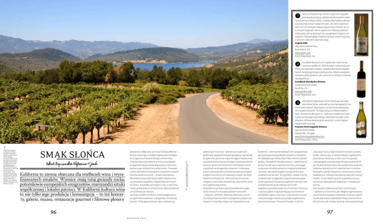 ➊ Twórca Chardonnay, które w 1976 roku wygrało paryską degustację, założył wkrótce potem własną winiarnię w Napa Valley. Chateau Montelena oferuje w przytulnej winiarni jedynie sześć, ale za to wyśmienitych win. W cenie jest degustacja prosto z beczki, za co w innych miejscach słono zapłacimy. Podczas zbiorów można też, jak za dawnych lat, pougniatać stopami winogrona. Na pamiątkę możemy sprawić sobie koszulkę z winnym odbiciem własnej stopy. Grgich Hills 1829 Saint Helena Hwy, Rutherford, CA www.grgich.com Koszt degustacji: $15 ➋ kulinaria kulinaria Gundlach Bundschu to najstarsza rodzinna winiarnia w Kalifornii. Winnica jest malowniczo położona na zboczach wzgórz. Rodzina Bundschu kładzie nacisk na ekologiczną produkcję wina. Można zwiedzać zarówno pola uprawne, jak i piwnice, w których odbywa się degustacja. Gundlach Bundschu Winery 2000 Denmark Street Sonoma, CA www.gunbun.com Koszt degustacji: $10 Powierzchnia uprawy w Kalifornii wynosi około 360.000 hektarów, z czego 180.000 do 225.000 hektarów przeznaczona jest pod uprawę wina. Na pozostałych terenach rosną winogrona stołowe i rodzynki. Roczna produkcja wina wynosi 21 milionów hektolitrów, to około 90% produkcji w całych USA. Jeśli oprócz degustacji wina interesuje cię niezapomniane show, odwiedź winiarnię reżysera Francisa Forda Coppoli. Stworzył on w Sonomie prawdziwy winny park rozrywki. To degustacja w hollywoodzkim stylu. Winiarnia oferuje m.in. białe wino Sofia (nie mylić z popularną bułgarską marką), nazwane na cześć córki reżysera. Wbrew efekciarskim pozorom, wina Coppoli mają niezłe recenzje. Francis Ford Coppola Winery 300 Via Archimedes Geyserville, CA 9544 www.franciscoppolawinery.com Koszt degustacji: od $5 smak słońca tekst Agnieszka Wojtowicz-Jach Kalifornia to ziemia obiecana dla wielbicieli wina i wyrafinowanych smaków. Winnice mają tutaj gwiazdy rocka, potomkowie europejskich emigrantów, marszandzi sztuki współczesnej i lokalni patrioci. W Kalifornii kultura wina to nie tylko jego produkcja i konsumpcja – to też koncerty, galerie, muzea, restauracje gourmet i filmowe plenery 96 Założona w 1882 roku winnica Chateau Monte- zatoce San Francisco. Słońce we wczesnych Kalifornii – winnice Kendall Jackson, przypomina- stauracje i bary z regionalnymi winami i serami, lana w Calistoga, w kalifornijskiej dolinie Napa, godzinach popołudniowych grzeje już naprawdę jące gotową scenografię do westernu miastecz- butiki, salony spa, a nawet sklepiki z gadżetami to świątynia amerykańskiego winiarstwa. przyjemnie, poranna mgła otulająca miasto oraz ko Healdsburg i restauracja Tides Wharf w Bode- dla psiarzy i kociarzy, w taki czy inny sposób Chardonnay z tej właśnie winnicy zwyciężyło sąsiednie doliny Sonoma i Napa rozwiewa się cał- ga Bay. Posiadłość Kendall Jackson, rozłożona na nawiązują do wytrawnego tematu przewodnie- kowicie. W porcie Fisherman’s Wharf jem lunch ponad 120 akrach w dolinie Sonoma, przyciąga go. To wymarzony kierunek weekendowy dla ko- na jednym ze straganów rybackich: kremowa smakoszy nie tylko winami o międzynarodowej neserów dobrej kuchni i szlachetnych trunków. zupa krabowa (clam chowder) podana w małym, renomie, ale także bogatym programem war- Niewielki, bardzo elegancki i nowoczesny Hotel krągłym bochenku chrupiącego chleba. Do tego sztatów kulinarnych. W ogrodzie i sadzie można Healdsburg, należący do prestiżowej sieci Design w legendarnej paryskiej degustacji z 1976 roku, dystansując wielkie francuskie marki. To wydarzenie odmieniło historię win z Kalifornii i całych Stanów Zjednoczonych – dzięki zwycięstwu foto: mat.prasowe California Wine Institute www.discovercaliforniawine.org ↑ ➌ świetnie schłodzone, intensywnie słoneczne uczestniczyć w zajęciach rozpoznawania zapa- Hotels, to zaś idealny punkt wypadowy na wy- i bogate w aromaty chardonnay, dyskretnie ukry- chów typowych dla poszczególnych odmian win, cieczki po dziesiątkach większych i mniejszych te w papierowej torbie. a także poznać aż 26 odmian winorośli. winnic. W Kalifornii uprawia się z powodzeniem więk- Healdsburg położone jest 65 mil od San Francisco Nie zawsze trzeba korzystać z samochodu szość znanych w Europie odmian winorośli i stanowi jeden z najważniejszych winiarskich – zarówno w Sonomie, jak i Napie organizowane Sauvignon Blanc to lekkie, orzeźwiające wino, – Viognier, Sémillon, Riesling, Moscato. Z tymi ośrodków regionu Sonoma. Cała struktura urba- są winiarskie wypady rowerowe. Podczas takich przyjemnie kwaskowe, o pogodnej, świetlistej aromatycznymi winami szczególnie przyjemnie nistyczna tego miasteczka podporządkowana wycieczek warto odwiedzić mniej znane w Euro- barwie. Próbuję je podczas rejsu statkiem po kojarzy mi się kilka miejsc na mapie północnej jest enoturystyce. Przytulne hotele, liczne re- pie winnice, jak choćby Quivirę, która specjalizuje Montelany aż po dziś dzień kalifornijskie wina są uznawane za jedne z najbardziej cenionych na rynku. A butelkę słynnego trunku z 1976 roku można podziwiać w Smithsonian National Museum of American History. wrzesień 2011 97 ← Vitis vinifera dotarła do Kalifornii z południa, wraz z misjonarzami. Pierwszą winnicę w Kaliforni założył w 1769 r. franciszkanin, ojciec Junipero Serra w misji katolickiej w okolicy San Diego. Winorośl przeznaczoną do upraw sprowadzono z Meksyku, nosi ona zresztą do tej pory nazwę Mision. biorstwo winiarskie na świecie. Gigantyczny sukces rynkowy marki Gallo jest już sam w sobie wystarczającym powodem, by odwiedzić jedną z ich profesjonalnych sal degustacyjnych, odbyć przejażdżkę po terenie winnic rozłożonych malowniczo na pagórkach czy zajrzeć do McMurray Ranch, gdzie w starym ranczo utworzono rodzaj romantycznego skansenu wypisz wymaluj jak z filmu „Domek na prerii”. Można się tu przekonać, jak w latach 40. i 50. XX wieku
