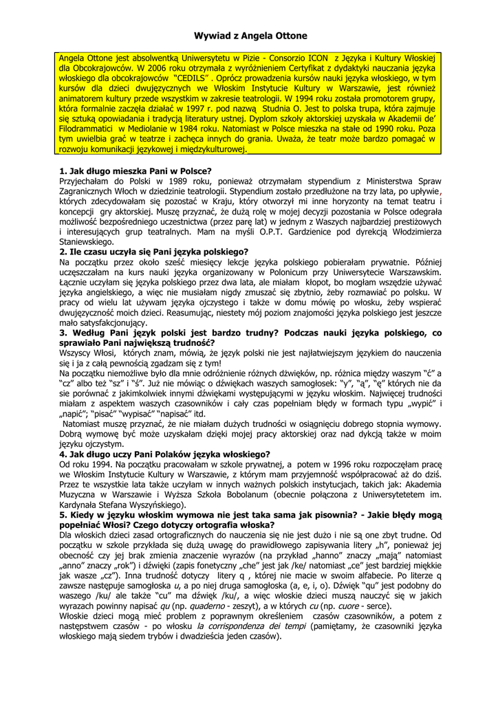 Wywiad z Angela Ottone Angela Ottone jest absolwentką Uniwersytetu w Pizie - Consorzio ICON z Języka i Kultury Włoskiej dla Obcokrajowców. W 2006 roku otrzymała z wyróżnieniem Certyfikat z dydaktyki nauczania języka włoskiego dla obcokrajowców “CEDILS” . Oprócz prowadzenia kursów nauki języka włoskiego, w tym kursów dla dzieci dwujęzycznych we Włoskim Instytucie Kultury w Warszawie, jest również animatorem kultury przede wszystkim w zakresie teatrologii. W 1994 roku została promotorem grupy, która formalnie zaczęła działać w 1997 r. pod nazwą Studnia O. Jest to polska trupa, która zajmuje się sztuką opowiadania i tradycją literatury ustnej. Dyplom szkoły aktorskiej uzyskała w Akademii de’ Filodrammatici w Mediolanie w 1984 roku. Natomiast w Polsce mieszka na stałe od 1990 roku. Poza tym uwielbia grać w teatrze i zachęca innych do grania. Uważa, że teatr może bardzo pomagać w rozwoju komunikacji językowej i międzykulturowej. 1. Jak długo mieszka Pani w Polsce? Przyjechałam do Polski w 1989 roku, ponieważ otrzymałam stypendium z Ministerstwa Spraw Zagranicznych Włoch w dziedzinie teatrologii. Stypendium zostało przedłużone na trzy lata, po upływie, których zdecydowałam się pozostać w Kraju, który otworzył mi inne horyzonty na temat teatru i koncepcji gry aktorskiej. Muszę przyznać, że dużą rolę w mojej decyzji pozostania w Polsce odegrała możliwość bezpośredniego uczestnictwa (przez parę lat) w jednym z Waszych najbardziej prestiżowych i interesujących grup teatralnych. Mam na myśli O.P.T. Gardzienice pod dyrekcją Włodzimierza Staniewskiego. 2. Ile czasu uczyła się Pani języka polskiego? Na początku przez około sześć miesięcy lekcje języka polskiego pobierałam prywatnie. Później uczęszczałam na kurs nauki języka organizowany w Polonicum przy Uniwersytecie Warszawskim. Łącznie uczyłam się języka polskiego przez dwa lata, ale miałam kłopot, bo mogłam wszędzie używać języka angielskiego, a więc nie musiałam nigdy zmuszać się zbytnio, żeby rozmawiać po polsku. W pracy od wielu lat używam języka ojczystego i także w domu mówię po włosku, żeby wspierać dwujęzyczność moich dzieci. Reasumując, niestety mój poziom znajomości języka polskiego jest jeszcze mało satysfakcjonujący. 3. Według Pani język polski jest bardzo trudny? Podczas nauki języka polskiego, co sprawiało Pani największą trudność? Wszyscy Włosi, których znam, mówią, że język polski nie jest najłatwiejszym językiem do nauczenia się i ja z całą pewnością zgadzam się z tym! Na początku niemożliwe było dla mnie odróżnienie różnych dżwięków, np. różnica między waszym “ć” a “cz” albo też “sz” i “ś”. Już nie mówiąc o dźwiękach waszych samogłosek: “y”, “ą”, “ę” których nie da sie porównać z jakimkolwiek innymi dźwiękami występującymi w języku włoskim. Najwięcej trudności miałam z aspektem waszych czasowników i cały czas popełniam błędy w formach typu „wypić” i „napić”; “pisać” “wypisać” “napisać” itd. Natomiast muszę przyznać, że nie miałam dużych trudności w osiągnięciu dobrego stopnia wymowy. Dobrą wymowę być może uzyskałam dzięki mojej pracy aktorskiej oraz nad dykcją także w moim języku ojczystym. 4. Jak długo uczy Pani Polaków języka włoskiego? Od roku 1994. Na początku pracowałam w szkole prywatnej, a potem w 1996 roku rozpoczęłam pracę we Włoskim Instytucie Kultury w Warszawie, z którym mam przyjemność współpracować aż do dziś. Przez te wszystkie lata także uczyłam w innych ważnych polskich instytucjach, takich jak: Akademia Muzyczna w Warszawie i Wyższa Szkoła Bobolanum (obecnie połączona z Uniwersytetetem im. Kardynała Stefana Wyszyńskiego). 5. Kiedy w języku włoskim wymowa nie jest taka sama jak pisownia? - Jakie błędy mogą popełniać Włosi? Czego dotyczy ortografia włoska? Dla włoskich dzieci zasad ortograficznych do nauczenia się nie jest dużo i nie są one zbyt trudne. Od początku w szkole przykłada się dużą uwagę do prawidłowego zapisywania litery „h”, ponieważ jej obecność czy jej brak zmienia znaczenie wyrazów (na przykład „hanno” znaczy „mają” natomiast „anno” znaczy „rok”) i dźwięki (zapis fonetyczny „che” jest jak /ke/ natomiast „ce” jest bardziej miękkie jak wasze „cz”). Inna trudność dotyczy litery q , której nie macie w swoim alfabecie. Po literze q zawsze następuje samogłoska u, a po niej druga samogłoska (a, e, i, o). Dźwięk “qu” jest podobny do waszego /ku/ ale także “cu” ma dźwięk /ku/, a więc włoskie dzieci muszą nauczyć się w jakich wyrazach powinny napisać qu (np. quaderno - zeszyt), a w których cu (np. cuore - serce). Włoskie dzieci mogą mieć problem z poprawnym określeniem czasów czasowników, a potem z następstwem czasów - po włosku la corrispondenza dei tempi (pamiętamy, że czasowniki języka włoskiego mają siedem trybów i dwadzieścia jeden czasów). 6. Czy i jakie występują trudności w poprawnym pisaniu w języku włoskim dla Polaków? Problemy Polaków w nauce języka włoskiego mogą być związane z różnymi regułami fonetycznymi np.: twarde dźwięki potrzebne, aby wymawiać „chi”, „ghe”, „ghi” i dziwne dla was „sc”. Jeśli po „sc „ znajduje się samogłoska i lub e, dźwięk jest podobne do waszego sz, podczas gdy po „sc” następuje jedna z tych samogłosek a, o, u, zaś między „sc” a samogłosce e lub i pojawia się h, dźwięk zamienia się i staje się podobny do waszego “sk”. Dam przykład pisowni wyrazów, który moi studenci łatwo pamiętają: scema (czytamy sz), co znaczy głupia, a schema (czytamy sk) znaczy schemat. Często występuje problem z układaniem kolejności słówek w zdaniu (np. najpierw przymiotnik i potem rzeczownik czy na odwrót, podmiot na końcu zdania, pozyc
