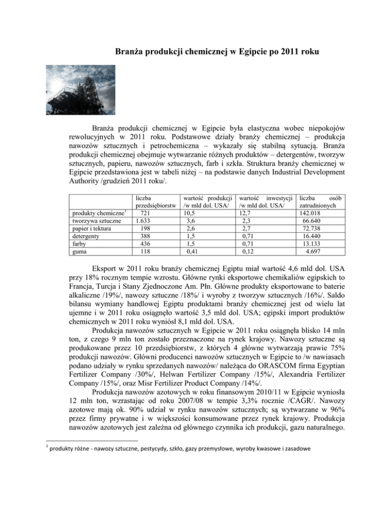 Branża produkcji chemicznej w Egipcie po 2011 roku Branża produkcji chemicznej w Egipcie była elastyczna wobec niepokojów rewolucyjnych w 2011 roku. Podstawowe działy branży chemicznej – produkcja nawozów sztucznych i petrochemiczna – wykazały się stabilną sytuacją. Branża produkcji chemicznej obejmuje wytwarzanie różnych produktów – detergentów, tworzyw sztucznych, papieru, nawozów sztucznych, farb i szkła. Struktura branży chemicznej w Egipcie przedstawiona jest w tabeli niżej – na podstawie danych Industrial Development Authority /grudzień 2011 roku/. produkty chemiczne1 tworzywa sztuczne papier i tektura detergenty farby guma liczba przedsiębiorstw 721 1.633 198 388 436 118 wartość produkcji /w mld dol. USA/ 10,5 3,6 2,6 1,5 1,5 0,41 wartość inwestycji /w mld dol. USA/ 12,7 2,3 2,7 0,71 0,71 0,12 liczba osób zatrudnionych 142.018 66.640 72.738 16.440 13.133 4.697 Eksport w 2011 roku branży chemicznej Egiptu miał wartość 4,6 mld dol. USA przy 18% rocznym tempie wzrostu. Główne rynki eksportowe chemikaliów egipskich to Francja, Turcja i Stany Zjednoczone Am. Płn. Główne produkty eksportowane to baterie alkaliczne /19%/, nawozy sztuczne /18%/ i wyroby z tworzyw sztucznych /16%/. Saldo bilansu wymiany handlowej Egiptu produktami branży chemicznej jest od wielu lat ujemne i w 2011 roku osiągnęło wartość 3,5 mld dol. USA; egipski import produktów chemicznych w 2011 roku wyniósł 8,1 mld dol. USA. Produkcja nawozów sztucznych w Egipcie w 2011 roku osiągnęła blisko 14 mln ton, z czego 9 mln ton zostało przeznaczone na rynek krajowy. Nawozy sztuczne są produkowane przez 10 przedsiębiorstw, z których 4 główne wytwarzają prawie 75% produkcji nawozów. Główni producenci nawozów sztucznych w Egipcie to /w nawiasach podano udziały w rynku sprzedanych nawozów/ należąca do ORASCOM firma Egyptian Fertilizer Company /30%/, Helwan Fertilizer Company /15%/, Alexandria Fertilizer Company /15%/, oraz Misr Fertilizer Product Company /14%/. Produkcja nawozów azotowych w roku finansowym 2010/11 w Egipcie wyniosła 12 mln ton, wzrastając od roku 2007/08 w tempie 3,3% rocznie /CAGR/. Nawozy azotowe mają ok. 90% udział w rynku nawozów sztucznych; są wytwarzane w 96% przez firmy prywatne i w większości konsumowane przez rynek krajowy. Produkcja nawozów azotowych jest zależna od głównego czynnika ich produkcji, gazu naturalnego. 1 produkty różne - nawozy sztuczne, pestycydy, szkło, gazy przemysłowe, wyroby kwasowe i zasadowe Zapowiadane intencje rządu podniesienia cen gazu powodują niepokój producentów branży, niemniej większość z nich funkcjonuje na bazie stałych kontraktów dostaw gazu i ew. podwyższenie cen gazu nie będzie miało wpływu na produkcję nawozów w krótkim okresie czasu. Egipt należy do światowych liderów produkcji nawozów fosforowych na bazie fosfatów, których rezerwy w Egipcie szacowane są na 900 mln ton. Produkcja nawozów fosforowych rozwijała się od roku 2008 w tempie 3,4% rocznie /CAGR/, osiągając 1,46 mln ton w roku finansowym 2010/11 /udział firm prywatnych wyniósł 912 tys. ton/. Zapotrzebowanie rynku egipskiego na nawozy sztuczne wynosi 8 mln ton rocznie, w tym 10% na nawozy fosforowe. Rząd Egiptu podejmuje działania na rzecz rozwoju produkcji nawozów sztucznych mając na uwadze potrzeby rozwojowe rolnictwa. W czerwcu 2011 roku administracja rządowa powiadomiła o planie budowy zakładu produkcyjnego w Ras Sidr /na zachodnim Synaju/. Zdolność wytwórcza fabryki w ilości 2 mln ton rocznie ma być dystrybuowana wśród małych farm egipskich po cenach subsydiowanych z budżetu państwa. Budowa fabryki ma kosztować ok. 200 mln dol. USA. Inwestycje w branży chemicznej Egiptu obejmują także fabrykę amoniaku i mocznika o mocy wytwórczej 1.090 ton dziennie /inwestycja 775 mln dol. USA/. Delta Company for Fertilizers planuje fabrykę o zdolności produkcyjnej amoniaku 1.090 ton dziennie, kwasu azotowego 635 ton dziennie, mocznika 2.130 ton dziennie /inwestycja 600 mln dol. USA/. ORASCOM Construction Industries planuje fabrykę nawozów azotowych o mocy 3 mln ton rocznie /inwestycja 3 mld dol. USA/.2 Branża produkcji nawozów sztucznych w Egipcie jest poddana ścisłej regulacji przez państwo w celu zapewnienia małym farmom dostępu do nawozów sztucznych po cenach subsydiowanych. Dystrybucja nawozów sztucznych w Egipcie jest subsydiowana kwotą 225 mln dol. USA z budżetu Egiptu rocznie. Produkcja petrochemiczna w Egipcie doznała znacznego rozwoju w okresie ostatniej dekady - przewidywana jest kontynuacja tej tendencji rozwojowej. W latach 2003 – 2009 produkcja petrochemiczna wzrosła o 45%, osiągając wartość 3 mld dol. USA. Rozwój branży petrochemicznej jest rezultatem realizacji 20-letniego planu rządu Egiptu zwiększenia zdolności produkcyjnej branży do 15 mln ton rocznie do 2022 roku. Wartość projektu inwestycyjnego w egipskiej branży petrochemicznej wynosi 10 mld dol. USA. W ramach planu zbudowanych ma być 14 zakładów petrochemicznych oraz 50 linii produkcyjnych i 3 działy olefin. Branża petrochemiczna liczy 16 joint-ventures oraz 3 firmy w wolnych strefach ekonomicznych, produkujące różne wyroby petrochemiczne z 46% udziałem polyethylenu. Przewiduje się wzrost do 15 mld dol. USA wartości eksportu branży petrochemicznej Egiptu, kierowanego głównie na rynek Europy, który przyjął w 2011 roku ok. dwie trzecie eksportu egipskiej branży petrochemicznej. Opracowanie: WPHI w Kairze, październik 2012 2 Egypt – Economic Profile, ACCE – April 2012