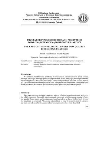 XII Krajowa Konferencja POMIARY KOROZYJNE W OCHRONIE ELEKTROCHEMICZNEJ XII National Conference CORROSION MEASUREMENTS IN ELECTROCHEMICAL PROTECTION 19-21. 09. 2012 Jurata, Poland PRZYPADEK PEWNEGO RUROCIĄGU POKRYTEGO POWŁOKĄ BITUMICZNĄ BARDZO ZŁEJ JAKOŚCI THE CASE OF THE PIPELINE WITH VERY LOW QUALITY BITUMINOUS COATINGS Marek Fiedorowicz, Michał Jagiełło Operator Gazociągów Przesyłowych GAZ-SYSTEM S.A. Słowa kluczowe: Keywords: ochrona katodowa, powłoka izolacyjna, pomiary intensywne, korozymetria rezystancyjna cathodic protection, insulating coating, intensive measuring, resistance corrosimetry Streszczenie W referacie przedstawiono problemy ze skutecznym zabezpieczeniem przed korozją pewnego stalowego rurociągu przesyłającego medium palne, pokrytego powłoką bitumiczną bardzo złej jakości. Wskazano przyczyny i konsekwencje niskiego poziomu izolacji rurociągu. Zaprezentowano działania podjęte w celu zdiagnozowania zagrożenia korozyjnego oraz w celu uzyskania skutecznego, potwierdzonego zabezpieczenia przeciwkorozyjnego. Summary This paper presents problems connected with an effective protection of some steel pipeline which transports flammable substances and is covered with bituminous coating of very low quality. Some causes and consequences have been given as far as the low level of pipeline insulation is concerned. Also, some actions taken in order to asses the risk of corrosion and steps towards an effective, approved corrosion protection have been described. 105 1. Wprowadzenie Budowę rurociągu o średnicy DN 200 i długości 31 km ukończono w 1987 r. Rury stalowe użyte do budowy nie były pokryte fabrycznymi powłokami bitumicznymi, nakładanymi w hucie. Zakupione „gołe” rury zaizolowano „systemem gospodarczym”. Tzw. zespół gospodarczy nakładał prymitywną metodą bitumiczne powłoki na rury na terenie wytwórni gazu miejskiego. Kontrole jakości używanych materiałów i wytworzonych powłok nie były przeprowadzane. Również podczas prac montażowych fachowy nadzór nad pracami izolacyjnymi został wyeliminowany. W rezultacie uzyskany poziom izolacji rurociągu jest bardzo niski. Jednostkowe rezystancje przejścia poszczególnych pododcinków zawierają się w przedziale od 2,2x102 do 9,7x103 Ωm2. Na odcinkach o łącznej długości stanowiącej ok. 17 % długości całkowitej jednostkowa rezystancja przejścia jest na poziomie 102 Ωm2; z kolei na odcinkach o długości stanowiącej ok. 50% długości całkowitej ledwo osiąga poziom 103 Ωm2. W celu ochrony katodowej zaprojektowano i wybudowano trzy stacje z zewnętrznym źródłem prądu. W okresie użytkowania rurociągu, z uwagi na niski poziom izolacji rurociągu, wybudowano dodatkową (czwartą) stację ochrony katodowej. Gęstość prądu polaryzacji katodowej wynosi aktualnie ok. 1 mA/m2 i jest ona zbyt mała w celu uzyskania skutecznej ochrony. Obecnie zachodzi konieczność wybudowania kolejnej, piątej stacji. Rurociąg poddany jest oddziaływaniom prądów błądzących. Na wszystkich (łącznie dwóch) skrzyżowaniach z trakcją kolejową występują katodowe strefy oddziaływań. Jedynym pozytywnym aspektem związanym z ochroną przeciwkorozyjną jest brak rur osłonowych zwartych z przewodem rurowym. Wszystkie spośród dziewięciu zamontowanych rur osłonowych, ku zaskoczeniu, są galwanicznie odizolowane od przewodu rurowego. Rurociąg ułożony jest w zróżnicowanym gruncie. Występują sprzyjające warunki do powstawania silnych, klasycznych makroogniw korozyjnych zróżnicowanego natleniania. Często górna część rurociągu ułożona jest w gruncie piaszczystym, a dolna – w nawodnionym gruncie o małej rezystywności. 2. Pomiary intensywne i ich wyniki Celem wykonanych w 2009 r. pomiarów intensywnych było rozpoznanie polaryzacji katodowej rzeczywistych defektach i określenie zakresu przyszłego remontu powłoki izolacyjnej rurociągu. Zamawiający precyzyjnie określił zakres i sposób wykonania pomiarów oraz prezentacji wyników: A. Wzdłuż trasy rurociągu należało wykonać pomiary intensywne metodą trzyelektrodową, tj. wykonać w sposób synchroniczny pomiary: potencjałów załączeniowych i wyłączeniowych nad rurociągiem oraz gradientów załączeniowych i wyłączeniowych „dziesięciometrowych” po obu stronach rurociągu. Należało stosować krok pomiarowy o długości 2 m, zagęszczany w rejonach występowania defektów, w celu zlokalizowania ich epicentrów. Na odcinkach, na których powłoka izolacyjna jest silnie zdegradowana (defekty powłoki leżą blisko siebie i nie jest możliwa lokalizacja epicentrów poszczególnych defektów) należało stosować krok pomiarowy od długości 1m. 106 B. W zlokalizowanych defektach powłoki należało wyznaczyć potencjały polaryzacji katodowej EIRfree metodą pomiarowo - obliczeniową (ekstrapolacyjną), z uwzględnieniem analizy błędów, wynikających z błędów elektrod odniesienia. Standardowo należało przyjąć błąd wyznaczenia gradientu wyłączeniowego, wynikający z błędu elektrod odniesienia ∆ = ±20 mV. C. W strefach oddziaływań silnych prądów błądzących (w rejonach skrzyżowań rurociągu z linią kolejową oraz ewentualnie w innych miejscach, w których w trakcie wykonywania pomiarów występować będą duże wahania potencjałów/gradientów potencjału) należało wyznaczyć potencjały EIRfree w odpowiednio długich przedziałach czasu (min. 1 godz.) w reprezentatywnych defektach powłoki. D. Wzdłuż trasy rurociągu należało wykonać pomiary pozornej rezystywności gruntu: – wzdłuż całej trasy rurociągu w odstępach nie mniejszych niż ok. 100 m, – w miejscach występowania defektów powłoki, w epicentrach których zmierzone wartości gradientów różnicowych są większe od ok. 100 mV. Pomiary należało wykonać metodą Wennera, przy rozstawie elektrod 2 i 3 m. E. Wzdłuż trasy należało wykonać pomiary głębokości ułożenia rurociągu