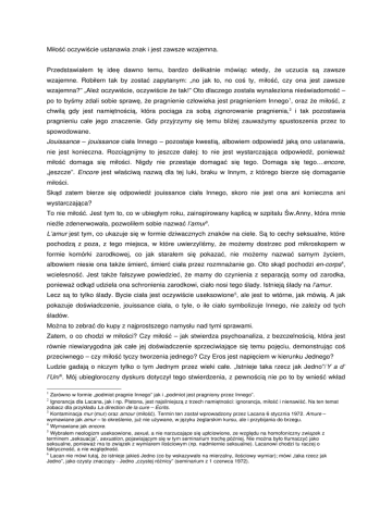 Miłość oczywiście ustanawia znak i jest zawsze wzajemna. Przedstawiałem tę ideę dawno temu, bardzo delikatnie mówiąc wtedy, że uczucia są zawsze wzajemne. Robiłem tak by zostać zapytanym: „no jak to, no coś ty, miłość, czy ona jest zawsze wzajemna?” „Ależ oczywiście, oczywiście że tak!” Oto dlaczego została wynaleziona nieświadomość – po to byśmy zdali sobie sprawę, że pragnienie człowieka jest pragnieniem Innego1, oraz że miłość, z chwilą gdy jest namiętnością, która pociąga za sobą zignorowanie pragnienia,2 i tak pozostawia pragnieniu całe jego znaczenie. Gdy przyjrzymy się temu bliżej zauważymy spustoszenia przez to spowodowane. Jouissance – jouissance ciała Innego – pozostaje kwestią, albowiem odpowiedź jaką ono ustanawia, nie jest konieczna. Rozciągnijmy to jeszcze dalej: to nie jest wystarczająca odpowiedź, ponieważ miłość domaga się miłości. Nigdy nie przestaje domagać się tego. Domaga się tego…encore, „jeszcze”. Encore jest właściwą nazwą dla tej luki, braku w Innym, z którego bierze się domaganie miłości. Skąd zatem bierze się odpowiedź jouissance ciała Innego, skoro nie jest ona ani konieczna ani wystarczająca? To nie miłość. Jest tym to, co w ubiegłym roku, zainspirowany kaplicą w szpitalu Św.Anny, która mnie nieźle zdenerwowała, pozwoliłem sobie nazwać l’amur3. L’amur jest tym, co ukazuje się w formie dziwacznych znaków na ciele. Są to cechy seksualne, które pochodzą z poza, z tego miejsca, w które uwierzyliśmy, że możemy dostrzec pod mikroskopem w formie komórki zarodkowej, co jak starałem się pokazać, nie możemy nazwać samym życiem, albowiem niesie ona także śmierć, śmierć ciała przez rozmnażanie go. Oto skąd pochodzi en-corps4, wcielesność. Jest także fałszywe powiedzieć, że mamy do czynienia z separacją somy od zarodka, ponieważ odkąd udziela ona schronienia zarodkowi, ciało nosi tego ślady. Istnieją ślady na l’amur. Lecz są to tylko ślady. Bycie ciała jest oczywiście useksowione 5, ale jest to wtórne, jak mówią. A jak pokazuje doświadczenie, jouissance ciała, o tyle, o ile ciało symbolizuje Innego, nie zależy od tych śladów. Można to zebrać do kupy z najprostszego namysłu nad tymi sprawami. Zatem, o co chodzi w miłości? Czy miłość – jak stwierdza psychoanaliza, z bezczelnością, która jest równie niewiarygodna jak całe jej doświadczenie sprzeciwiające się temu pojęciu, demonstrując coś przeciwnego – czy miłość tyczy tworzenia jednego? Czy Eros jest napięciem w kierunku Jednego? Ludzie gadają o niczym tylko o tym Jednym przez wieki całe. „Istnieje taka rzecz jak Jedno”/Y a d’ l’Un/6. Mój ubiegłoroczny dyskurs dotyczył tego stwierdzenia, z pewnością nie po to by wnieść wkład 1 Zarówno w formie „podmiot pragnie Innego” jak i „podmiot jest pragniony przez Innego”. Ignorancja dla Lacana, jak i np. Platona, jest najsilniejszą z trzech namiętności: ignorancja, miłość i nienawiść. Na ten temat zobacz dla przykładu La direction de la cure – Écrits. 3 Kontaminacja mur (mur) oraz amour (miłość). Termin ten został wprowadzony przez Lacana 6 stycznia 1972. Amure – wymawiane jak amur – to określenie, już nie używane, w języku żeglarskim kursu, ale i przybijania do brzegu. 4 Wymawiane jak encore. 5 Wybrałem neologizm useksowione, sexué, a nie narzucające się upłciowione, ze względu na homofoniczny związek z terminem „seksuacja”, sexuation, pojawiającym się w tym seminarium trochę później. Nie można było tłumaczyć jako seksualne, ponieważ ma to związek z wymiarem ilościowym (np. nadmiernie seksualne). Lacanowi chodzi tu raczej o faktyczność, a nie względność. 6 Lacan nie mówi tutaj, że istnieje jakieś Jedno (co by wskazywało na mierzalny, ilościowy wymiar); mówi „taka rzecz jak Jedno”, jako czysty znaczący - Jedno „czystej różnicy” (seminarium z 1 czerwca 1972). 2 do najwcześniejszych konfuzji, ponieważ pragnienie prowadzi nas jedynie do natknięcia się na lukę, gdzie można zademonstrować, iż Jedno opiera się tylko na istocie znaczącego. Zajmowałem się Frege7 od początku [ubiegłorocznego seminarium], próbując zademonstrować pęknięcie jakie istnieje pomiędzy tym Jednym, a czymś co związane jest z byciem, a poza byciem, z jouissance. 7 Gottlob Frege (1848-1925) – matematyk, logik i filozof. Na jego temat Lacan mówił na wykładzie w dniu 8 grudnia 1971; patrz seminarium XIX.