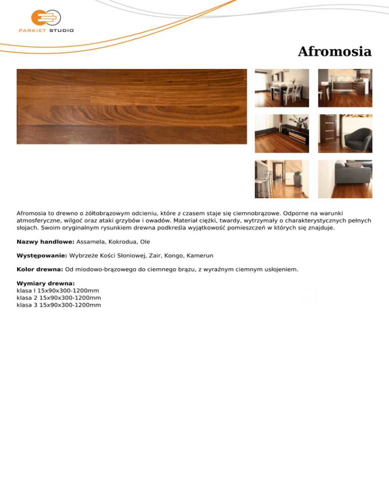 Afromosia Afromosia to drewno o żółtobrązowym odcieniu, które z czasem staje się ciemnobrązowe. Odporne na warunki atmosferyczne, wilgoć oraz ataki grzybów i owadów. Materiał ciężki, twardy, wytrzymały o charakterystycznych pełnych słojach. Swoim oryginalnym rysunkiem drewna podkreśla wyjątkowość pomieszczeń w których się znajduje. Nazwy handlowe: Assamela, Kokrodua, Ole Występowanie: Wybrzeże Kości Słoniowej, Zair, Kongo, Kamerun Kolor drewna: Od miodowo-brązowego do ciemnego brązu, z wyraźnym ciemnym usłojeniem. Wymiary drewna: klasa I 15x90x300-1200mm klasa 2 15x90x300-1200mm klasa 3 15x90x300-1200mm
