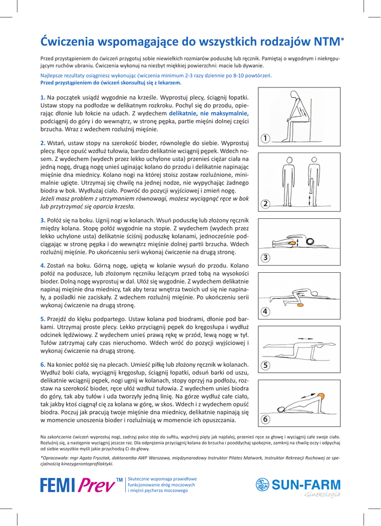 Ćwiczenia wspomagające do wszystkich rodzajów NTM* Przed przystąpieniem do ćwiczeń przygotuj sobie niewielkich rozmiarów poduszkę lub ręcznik. Pamiętaj o wygodnym i niekrępującym ruchów ubraniu. Ćwiczenia wykonuj na niezbyt miękkiej powierzchni: macie lub dywanie. Najlepsze rezultaty osiągniesz wykonując ćwiczenia minimum 2-3 razy dziennie po 8-10 powtórzeń. Przed przystąpieniem do ćwiczeń skonsultuj się z lekarzem. 1. Na początek usiądź wygodnie na krześle. Wyprostuj plecy, ściągnij łopatki. Ustaw stopy na podłodze w delikatnym rozkroku. Pochyl się do przodu, opierając dłonie lub łokcie na udach. Z wydechem delikatnie, nie maksymalnie, podciągnij do góry i do wewnątrz, w stronę pępka, partie mięśni dolnej części brzucha. Wraz z wdechem rozluźnij mięśnie. 2. Wstań, ustaw stopy na szerokość bioder, równolegle do siebie. Wyprostuj plecy. Ręce opuść wzdłuż tułowia, bardzo delikatnie wciągnij pępek. Wdech nosem. Z wydechem (wydech przez lekko uchylone usta) przenieś ciężar ciała na jedną nogę, drugą nogę unieś uginając kolano do przodu i delikatnie napinając mięśnie dna miednicy. Kolano nogi na której stoisz zostaw rozluźnione, minimalnie ugięte. Utrzymaj się chwilę na jednej nodze, nie wypychając żadnego biodra w bok. Wydłużaj ciało. Powróć do pozycji wyjściowej i zmień nogę. Jeżeli masz problem z utrzymaniem równowagi, możesz wyciągnąć ręce w bok lub przytrzymać się oparcia krzesła. 3. Połóż się na boku. Ugnij nogi w kolanach. Wsuń poduszkę lub złożony ręcznik między kolana. Stopę połóż wygodnie na stopie. Z wydechem (wydech przez lekko uchylone usta) delikatnie ściśnij poduszkę kolanami, jednocześnie podciągając w stronę pępka i do wewnątrz mięśnie dolnej partii brzucha. Wdech rozluźnij mięśnie. Po ukończeniu serii wykonaj ćwiczenie na drugą stronę. 4. Zostań na boku. Górną nogę, ugiętą w kolanie wysuń do przodu. Kolano połóż na poduszce, lub złożonym ręczniku leżącym przed tobą na wysokości bioder. Dolną nogę wyprostuj w dal. Ułóż się wygodnie. Z wydechem delikatnie napinaj mięśnie dna miednicy, tak aby teraz wnętrza twoich ud się nie napinały, a pośladki nie zaciskały. Z wdechem rozluźnij mięśnie. Po ukończeniu serii wykonaj ćwiczenie na drugą stronę. 5. Przejdź do klęku podpartego. Ustaw kolana pod biodrami, dłonie pod barkami. Utrzymaj proste plecy. Lekko przyciągnij pępek do kręgosłupa i wydłuż odcinek lędźwiowy. Z wydechem unieś prawą rękę w przód, lewą nogę w tył. Tułów zatrzymaj cały czas nieruchomo. Wdech wróć do pozycji wyjściowej i wykonaj ćwiczenie na drugą stronę. 6. Na koniec połóż się na plecach. Umieść piłkę lub złożony ręcznik w kolanach. Wydłuż boki ciała, wyciągnij kręgosłup, ściągnij łopatki, odsuń barki od uszu, delikatnie wciągnij pępek, nogi ugnij w kolanach, stopy oprzyj na podłożu, rozstaw na szerokość bioder, ręce ułóż wzdłuż tułowia. Z wydechem unieś biodra do góry, tak aby tułów i uda tworzyły jedną linię. Na górze wydłuż całe ciało, tak jakby ktoś ciągnął cię za kolana w górę, w skos. Wdech i z wydechem opuść biodra. Poczuj jak pracują twoje mięśnie dna miednicy, delikatnie napinają się w momencie unoszenia bioder i rozluźniają w momencie ich opuszczania. 1 2 3 4 5 6 Na zakończenie ćwiczeń wyprostuj nogi, zadrzyj palce stóp do sufitu, wypchnij pięty jak najdalej, przenieś ręce za głowę i wyciągnij całe swoje ciało. Rozluźnij się, a następnie wyciągnij jeszcze raz. Dla odprężenia przyciągnij kolana do brzucha i pooddychaj spokojnie, zamknij na chwilę oczy i odpychaj od siebie wszystkie myśli jakie przychodzą Ci do głowy. *Opracowała: mgr Agata Frysztak, doktorantka AWF Warszawa, międzynarodowy Instruktor Pilates Matwork, Instruktor Rekreacji Ruchowej ze specjalnością kinezygerontoprofilaktyki. Skutecznie wspomaga prawidłowe funkcjonowanie dróg moczowych i mięśni pęcherza moczowego