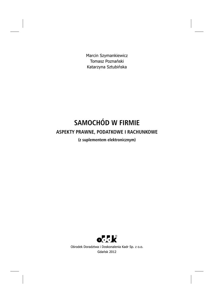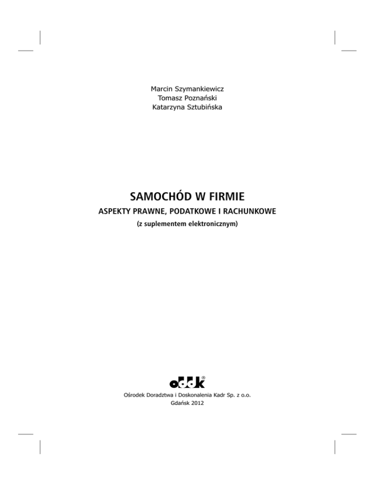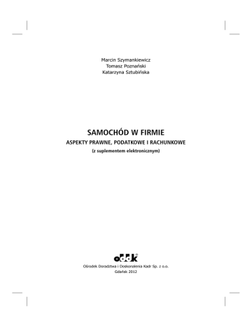 Marcin Szymankiewicz Tomasz Poznañski Katarzyna Sztubiñska SAMOCHÓD W FIRMIE ASPEKTY PRAWNE, PODATKOWE I RACHUNKOWE (z suplementem elektronicznym) Oœrodek Doradztwa i Doskonalenia Kadr Sp. z o.o. Gdañsk 2012 Spis treœci Spis treści Spis treści Wykaz skrótów . . . . . . . . . . . . . . . . . . . . . . . . . . . . . . . . . . . . . . . . . . . . . . . . . . . . . . . . . . . . . . . . . . . 11 Wstęp. . . . . . . . . . . . . . . . . . . . . . . . . . . . . . . . . . . . . . . . . . . . . . . . . . . . . . . . . . . . . . . . . . . . . . . . . . .13 1. Definicje. . . . . . . . . . . . . . . . . . . . . . . . . . . . . . . . . . . . . . . . . . . . . . . . . . . . . . . . . . . . . . . . . . . . . . .15 1.1. Definicja samochodu i innych pojazdów . . . . . . . . . . . . . . . . . . . . . . . . . . . . . . . . . . . . . . . . . . . . . . . . 1.2. Odrębność definicji samochodu dla celów podatkowych . . . . . . . . . . . . . . . . . . . . . . . . . . . . . . . . . . . . . 1.2.1. Definicja samochodu osobowego dla celów podatku VAT . . . . . . . . . . . . . . . . . . . . . . . . . . . . 1.2.2. Definicja samochodu osobowego na gruncie podatku dochodowego . . . . . . . . . . . . . . . . . . . . . . . 1.3. Samochód osobowy a samochód ciężarowy. . . . . . . . . . . . . . . . . . . . . . . . . . . . . . . . . . . . . . . . . . . . . . 15 17 18 21 23 2. Zakup i używanie samochodu – aspekty prawne . . . . . . . . . . . . . . . . . . . . . . . . . . . . . . . . . . . . . . 27 2.1. Zakup i używanie nowego samochodu . . . . . . . . . . . . . . . . . . . . . . . . . . . . . . . . . . . . . . . . . . . . . . . . . 2.1.1. Zamówienie samochodu . . . . . . . . . . . . . . . . . . . . . . . . . . . . . . . . . . . . . . . . . . . . . . . . . . . . . . 2.1.2. Ogólne warunki sprzedaży . . . . . . . . . . . . . . . . . . . . . . . . . . . . . . . . . . . . . . . . . . . . . . . . . . . . 2.1.3. Zaliczka a zadatek . . . . . . . . . . . . . . . . . . . . . . . . . . . . . . . . . . . . . . . . . . . . . . . . . . . . . . . . . . . 2.1.4. Cena . . . . . . . . . . . . . . . . . . . . . . . . . . . . . . . . . . . . . . . . . . . . . . . . . . . . . . . . . . . . . . . . . . . . . 2.1.5. Termin wydania pojazdu . . . . . . . . . . . . . . . . . . . . . . . . . . . . . . . . . . . . . . . . . . . . . . . . . . . . . . 2.1.6. Odstąpienie od umowy z powodu niewydania samochodu w terminie. . . . . . . . . . . . . . . . . . . 2.1.7. Wydanie samochodu . . . . . . . . . . . . . . . . . . . . . . . . . . . . . . . . . . . . . . . . . . . . . . . . . . . . . . . . . 2.1.8. Gwarancja . . . . . . . . . . . . . . . . . . . . . . . . . . . . . . . . . . . . . . . . . . . . . . . . . . . . . . . . . . . . . . . . . 2.1.9. Rękojmia . . . . . . . . . . . . . . . . . . . . . . . . . . . . . . . . . . . . . . . . . . . . . . . . . . . . . . . . . . . . . . . . . . 2.1.10. Odstąpienie od umowy . . . . . . . . . . . . . . . . . . . . . . . . . . . . . . . . . . . . . . . . . . . . . . . . . . . . . . . 2.1.11. Niezgodność z umową – uprawnienia kupującego . . . . . . . . . . . . . . . . . . . . . . . . . . . . . . . . . . 2.1.12. Samochód zastępczy na czas naprawy . . . . . . . . . . . . . . . . . . . . . . . . . . . . . . . . . . . . . . . . . . . 2.2. Zakup używanego samochodu . . . . . . . . . . . . . . . . . . . . . . . . . . . . . . . . . . . . . . . . . . . . . . . . . . . . . . . . 2.2.1. Sprawdzenie legalności pochodzenia pojazdu. . . . . . . . . . . . . . . . . . . . . . . . . . . . . . . . . . . . . . 2.2.2. Sprawdzanie stanu technicznego pojazdu . . . . . . . . . . . . . . . . . . . . . . . . . . . . . . . . . . . . . . . . . 2.2.3. Sprawdzenie obciążeń pojazdu na rzecz osób trzecich . . . . . . . . . . . . . . . . . . . . . . . . . . . . . . . 2.2.4. Nabycie pojazdu od osoby fizycznej pozostającej w związku małżeńskim . . . . . . . . . . . . . . . . . 2.2.5. Ważne elementy umowy sprzedaży . . . . . . . . . . . . . . . . . . . . . . . . . . . . . . . . . . . . . . . . . . . . . . 2.2.6. Naprawa samochodu w nieautoryzowanym serwisie a uprawnienia z gwarancji . . . . . . . . . . . 2.2.7. Nabycie pojazdu od przedsiębiorcy – właściwa reprezentacja sprzedającego . . . . . . . . . . . . . . 2.2.8. Samochód nabywany za granicą . . . . . . . . . . . . . . . . . . . . . . . . . . . . . . . . . . . . . . . . . . . . . . . . 2.2.9. Opłaty i formalności. . . . . . . . . . . . . . . . . . . . . . . . . . . . . . . . . . . . . . . . . . . . . . . . . . . . . . . . . . 27 27 27 28 30 31 32 33 35 40 45 46 50 51 51 53 54 55 56 60 63 65 66 3. Zakup i użytkowanie samochodu – aspekty prawne i podatkowe . . . . . . . . . . . . . . . . . . . . . . . . . 69 3.1. Koszty eksploatacji samochodu w kosztach uzyskania przychodów . . . . . . . . . . . . . . . . . . . . . . . . . . . . 69 3.1.1. Definicja kosztów uzyskania przychodów . . . . . . . . . . . . . . . . . . . . . . . . . . . . . . . . . . . . . . . . . 69 3.1.2. Dokumentowanie kosztów uzyskania przychodów . . . . . . . . . . . . . . . . . . . . . . . . . . . . . . . . . . 72 3.1.3. Opłaty parkingowe – sposób udokumentowania . . . . . . . . . . . . . . . . . . . . . . . . . . . . . . . . . . . 75 3.1.4. Koszty uzyskania przychodów poniesione w walucie obcej . . . . . . . . . . . . . . . . . . . . . . . . . . . . 77 3.1.5. Potrącalność kosztów w czasie . . . . . . . . . . . . . . . . . . . . . . . . . . . . . . . . . . . . . . . . . . . . . . . . . 77 3.1.5.1. Moment potrącenia kosztów u podatników prowadzących księgi rachunkowe . . . . . . 77 3.1.5.2. Moment potrącenia kosztów u podatników prowadzących podatkową księgę metodą memoriałową . . . . . . . . . . . . . . . . . . . . . . . . . . . . . . . . . . . . . . . . . . . . . . . . 80 3.1.5.3. Moment potrącenia kosztów u podatników prowadzących podatkową księgę metodą kasową . . . . . . . . . . . . . . . . . . . . . . . . . . . . . . . . . . . . . . .