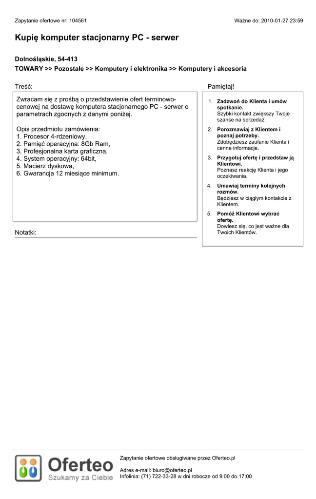 Zapytanie ofertowe nr: 104561 Ważne do: 2010-01-27 23:59 Kupię komputer stacjonarny PC - serwer Dolnośląskie, 54-413 TOWARY >> Pozostałe >> Komputery i elektronika >> Komputery i akcesoria Treść: Pamiętaj! Zwracam się z prośbą o przedstawienie ofert terminowocenowej na dostawę komputera stacjonarnego PC - serwer o parametrach zgodnych z danymi poniżej. 1. Zadzwoń do Klienta i umów spotkanie. Szybki kontakt zwiększy Twoje szanse na sprzedaż. Opis przedmiotu zamówienia: 1. Procesor 4-rdzeniowy, 2. Pamięć operacyjna: 8Gb Ram, 3. Profesjonalna karta graficzna, 4. System operacyjny: 64bit, 5. Macierz dyskowa, 6. Gwarancja 12 miesiące minimum. 2. Porozmawiaj z Klientem i poznaj potrzeby. Zdobędziesz zaufanie Klienta i cenne informacje. Notatki: 3. Przygotuj ofertę i przedstaw ją Klientowi. Poznasz reakcję Klienta i jego oczekiwania. 4. Umawiaj terminy kolejnych rozmów. Będziesz w ciągłym kontakcie z Klientem. 5. Pomóż Klientowi wybrać ofertę. Dowiesz się, co jest ważne dla Twoich Klientów. Zapytanie ofertowe obsługiwane przez Oferteo.pl Adres e-mail: [email protected] Infolinia: (71) 722-33-28 w dni robocze od 9:00 do 17:00