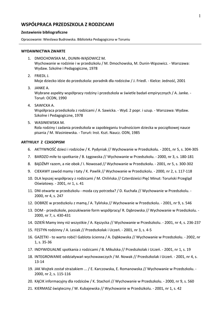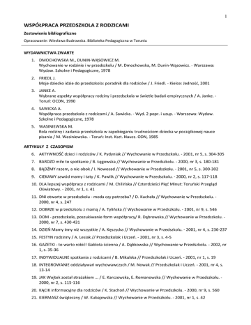 1 WSPÓŁPRACA PRZEDSZKOLA Z RODZICAMI Zestawienie bibliograficzne Opracowanie: Wiesława Budrowska. Biblioteka Pedagogiczna w Toruniu WYDAWNICTWA ZWARTE 1. DMOCHOWSKA M., DUNIN-WĄSOWICZ M. Wychowanie w rodzinie i w przedszkolu / M. Dmochowska, M. Dunin-Wąsowicz. - Warszawa: Wydaw. Szkolne i Pedagogiczne, 1978 2. FRIEDL J. Moje dziecko idzie do przedszkola: poradnik dla rodziców / J. Friedl. - Kielce: Jedność, 2001 3. JANKE A. Wybrane aspekty współpracy rodziny i przedszkola w świetle badań empirycznych / A. Janke. Toruń: OCDN, 1990 4. SAWICKA A. Współpraca przedszkola z rodzicami / A. Sawicka. - Wyd. 2 popr. i uzup. - Warszawa: Wydaw. Szkolne i Pedagogiczne, 1978 5. WASINIEWSKA M. Rola rodziny i zadania przedszkola w zapobieganiu trudnościom dziecka w początkowej nauce pisania / M. Wasiniewska. - Toruń: Inst. Kszt. Naucz. ODN, 1985 ARTYKUŁY Z CZASOPISM 6. AKTYWNOŚĆ dzieci i rodziców / K. Pydyniak // Wychowanie w Przedszkolu. - 2001, nr 5, s. 304-305 7. BARDZO miłe to spotkanie / B. ŁBgowska // Wychowanie w Przedszkolu. - 2000, nr 3, s. 180-181 8. BĄDŹMY razem, a nie obok / I. Nowosad // Wychowanie w Przedszkolu. - 2001, nr 5, s. 300-302 9. CIEKAWY zawód mamy i taty / K. Pawlik // Wychowanie w Przedszkolu. - 2000, nr 2, s. 117-118 10. DLA lepszej współpracy z rodzicami / M. Chilińska // Czterdzieści PiBć Minut: Toruński Przegląd Oświatowy. - 2001, nr 1, s. 41 11. DNI otwarte w przedszkolu - moda czy potrzeba? / D. Kuchała // Wychowanie w Przedszkolu. 2000, nr 4, s. 247 12. DOBRZE w przedszkolu z mamą / A. Tylińska // Wychowanie w Przedszkolu. - 2001, nr 9, s. 546 13. DOM - przedszkole, poszukiwanie form współpracy/ R. Dąbrowska // Wychowanie w Przedszkolu. 2000, nr 7, s. 430-431 14. DZIEŃ Mamy inny niż wszystkie / A. KBszycka // Wychowanie w Przedszkolu. - 2001, nr 4, s. 236-237 15. FESTYN rodzinny / A. Lesiak // Przedszkolak i Uczeń. - 2001, nr 3, s. 4-5 16. GAZETKI - to warto robićt Gablota ścienna / A. Dąbkowska // Wychowanie w Przedszkolu. - 2002, nr 1, s. 35-36 17. INDYWIDUALNE spotkania z rodzicami / B. Mikulska // Przedszkolak i Uczeń. - 2001, nr 1, s. 19 18. INTEGROWANIE oddziaływań wychowawczych / M. Nowak // Przedszkolak i Uczeń. - 2001, nr 4, s. 13-14 19. JAK Wojtek został strażakiem ... / E. Karczowska, E. Romanowska // Wychowanie w Przedszkolu. 2000, nr 2, s. 115-116 20. KĄCIK informacyjny dla rodziców / K. Stachoń // Wychowanie w Przedszkolu. - 2000, nr 9, s. 560 21. KIERMASZ świąteczny / W. Kubajewska // Wychowanie w Przedszkolu. - 2001, nr 1, s. 42 2 22. KOCHAMY naszych najbliższych. Współdziałanie nauczycieli przedszkola i katechetów z rodzicami / M. Dobosz, T. Łuczak // Wychowanie w Przedszkolu. - 2000, nr, 8, s. 461-464 23. KOMPUTER i dziecko / M. Kubacik // Wychowanie w Przedszkolu. - 2002, nr 3, s. 171-172 24. MAMO, tato - przeczytaj / M. Chilińska // Wychowanie w Przedszkolu. - 2002, nr 1, s. 37 25. MAMO, tato, pobaw siB ze mnąt / L. Kulas // Wychowanie w Przedszkolu. - 2001, nr 8, s. 491-492 26. NA majówkB / H. Brajtszedel // Wychowanie w Przedszkolu. - 2002, nr 5, s. 299-300 27. NAJMILSZE świBto / J. Trojok // Wychowanie w Przedszkolu. - 2001, nr 1, s. 42-43 /Dzień Babci i Dziadka/ 28. NAJMILSZY dzień w przedszkolu / ŁBgowska B. / / Wychowanie w Przedszkolu . -2000, nr 8, s. 498499 29. NASI partnerzy / M. Kukurenda // Wychowanie w Przedszkolu. - 2001, nr 5, s. 303-304 30. NASZE wystawy / R. Stawczyk-Mizńska // Wychowanie w Przedszkolu. - 2002, nr 4, s. 233-235 31. O MOWIE dziecka raz jeszcze... / A. Dąbkowska // Wychowanie w Przedszkolu. - 2000, nr 9, s. 558559 32. OZDABIAMY choinkB / M. WoOniak-Wróblewska // Wychowanie w Przedszkolu. - 2000, nr 10, s. 619 33. PALMY wielkanocne / W. Chowanek // Wychowanie w Przedszkolu. - 2002, nr 3, s. 169-170 34. POMAGAMY sobie nawzajem / A. PotrBć // Wychowanie w Przedszkolu. - 2000, nr 3, s. 177-179 35. POMYSŁY na strachy / B. Polakowska // Wychowanie w Przedszkolu. - 2001, nr 9, s. 549-550 /Warsztaty metodyczne/ 36. PORTRET rodzinny / U. Siudak, D. Gąsiorek // Wychowanie w Przedszkolu. - 2001, nr 6, s. 364-365 37. POZWÓL dziecku poznać świat nie wyrBczając siB telewizją - projekt zajBć warsztatowych dla rodziców / H. Grabowska i in.w // Wychowanie na co dzień. - 2001, nr 6 /wkładka metodyczna/ 38. PROFILAKTYKA antynikotynowa / B. Wilczyńska // Wychowanie w Przedszkolu. - 2001, nr 3, s. 164165 39. PRZEZ dziurkB od klucza / A. Flajszer // Wychowanie w Przedszkolu. - 2002, nr 1, s. 36-37 / Gazetka dla rodziców/ 40. PRZYJAZNE przedszkole / H. Malewicz // Wychowanie w Przedszkolu. - 2001, nr 6, s. 362-364 / Proces adaptacyjny przedszkolaka/ 41. RODZIC - uczeń - nauczyciel / D. T. Sobołtyńska // Przedszkolak i Uczeń. - 2001, nr 1, s. 6-8 42. RODZINNE spotkania / H. Bielecka // Wychowanie w Przedszkolu. - 2002, nr 5, s. 296-297 43. SAMO siB - zajBcia otwarte / S. Pruś // Wychowanie w Przedszkolu. - 2002, nr 5, s. 297-298 44. SPOTKANIA to nasza specjalność / J. Dmowska-Kielar // Wychowanie w Przedszkolu. - 2002, nr 7, s. 424-425 45. SPOTKANIA w naszej sali / L. Kołodziejska // Wychowanie w Przedszkolu. - 2001, nr 10, s. 611-612 46. SPOTKANIE trzech pokoleń / S. Oplustil // Wychowanie w Przedszkolu. - 2000, nr 1, s. 48-49 47. SUKIENKA dla Pani Wiosny / B. Besta // Wychowanie w Przedszkolu. - 2002, nr 4, s. 235-236 48. ŚNIEŻNOBIAŁY uśmiech dla Mamy / M. Karasiewicz // Wychowanie w Przedszkolu. - 2002, nr 2, s. 106-108 49. ŚWIĄTECZNY prezent / B. Małecka // Wychowanie w Przedszkolu. - 2000, nr 10, s. 620 50. TRZY spotkania i turniej / K. Stachoń // Wychowanie w Przedszkolu. - 2000, nr 8, s. 496-498 51. UCZYMY dzieci samodzielności / G. Chwoła // Wychowanie w Przedszkolu. - 2001, nr 10, s. 610-611 3 52. UŚMIECH na twarzy dziecka / M. Bronisławska // Wychowanie w Przedszkolu. - 2001, nr 7, s. 431432 53. W ATMOSFERZE zaufania i życzliwości / E. Chrzanowska // Wychowanie w Przedszkolu. - 2001, nr 10, s. 607-609 54. W PRZEDSZKOLU jak w