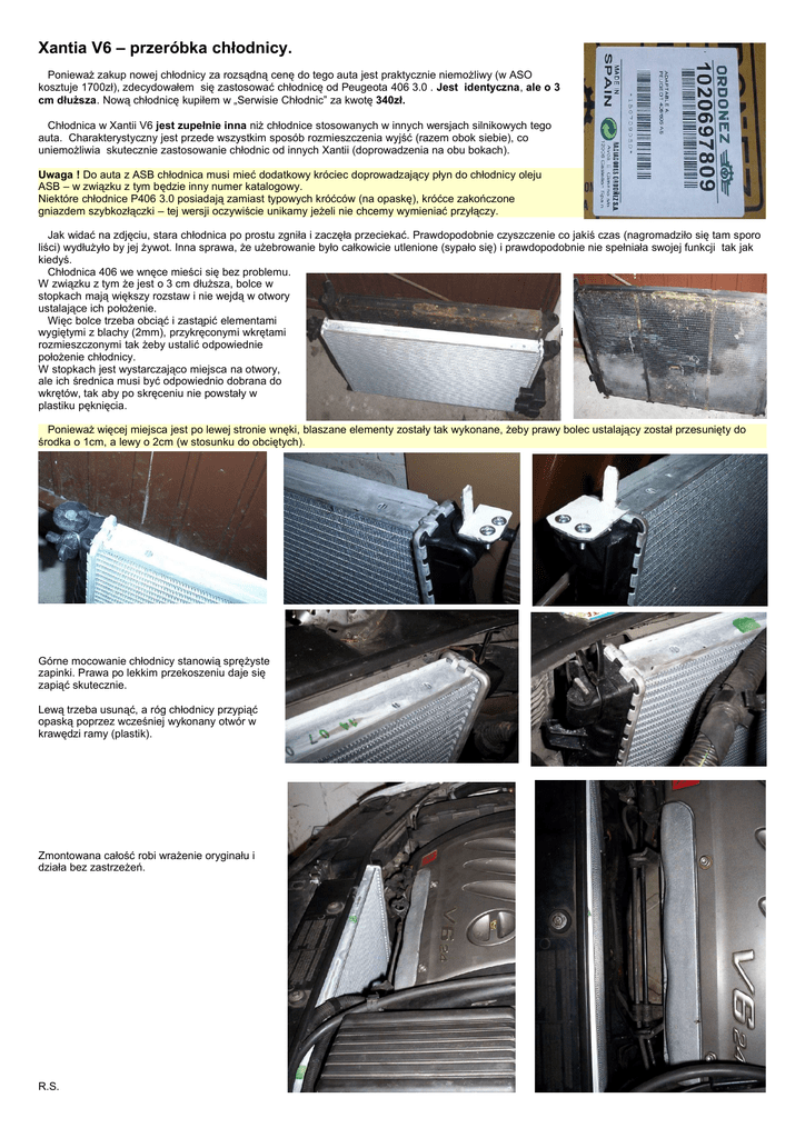 Xantia V6 – przeróbka chłodnicy. Ponieważ zakup nowej chłodnicy za rozsądną cenę do tego auta jest praktycznie niemożliwy (w ASO kosztuje 1700zł), zdecydowałem się zastosować chłodnicę od Peugeota 406 3.0 . Jest identyczna, ale o 3 cm dłuższa. Nową chłodnicę kupiłem w „Serwisie Chłodnic” za kwotę 340zł. Chłodnica w Xantii V6 jest zupełnie inna niż chłodnice stosowanych w innych wersjach silnikowych tego auta. Charakterystyczny jest przede wszystkim sposób rozmieszczenia wyjść (razem obok siebie), co uniemożliwia skutecznie zastosowanie chłodnic od innych Xantii (doprowadzenia na obu bokach). Uwaga ! Do auta z ASB chłodnica musi mieć dodatkowy króciec doprowadzający płyn do chłodnicy oleju ASB – w związku z tym będzie inny numer katalogowy. Niektóre chłodnice P406 3.0 posiadają zamiast typowych króćców (na opaskę), króćce zakończone gniazdem szybkozłączki – tej wersji oczywiście unikamy jeżeli nie chcemy wymieniać przyłączy. Jak widać na zdjęciu, stara chłodnica po prostu zgniła i zaczęła przeciekać. Prawdopodobnie czyszczenie co jakiś czas (nagromadziło się tam sporo liści) wydłużyło by jej żywot. Inna sprawa, że użebrowanie było całkowicie utlenione (sypało się) i prawdopodobnie nie spełniała swojej funkcji tak jak kiedyś. Chłodnica 406 we wnęce mieści się bez problemu. W związku z tym że jest o 3 cm dłuższa, bolce w stopkach mają większy rozstaw i nie wejdą w otwory ustalające ich położenie. Więc bolce trzeba obciąć i zastąpić elementami wygiętymi z blachy (2mm), przykręconymi wkrętami i rozmieszczonymi tak żeby ustalić odpowiednie położenie chłodnicy. W stopkach jest wystarczająco miejsca na otwory, ale ich średnica musi być odpowiednio dobrana do wkrętów, tak aby po skręceniu nie powstały w plastiku pęknięcia. Ponieważ więcej miejsca jest po lewej stronie wnęki, blaszane elementy zostały tak wykonane, żeby prawy bolec ustalający został przesunięty do środka o 1cm, a lewy o 2cm (w stosunku do obciętych). Górne mocowanie chłodnicy stanowią sprężyste zapinki. Prawa po lekkim przekoszeniu daje się zapiąć skutecznie. Lewą trzeba usunąć, a róg chłodnicy przypiąć opaską poprzez wcześniej wykonany otwór w krawędzi ramy (plastik). Zmontowana całość robi wrażenie oryginału i działa bez zastrzeżeń. R.S.
