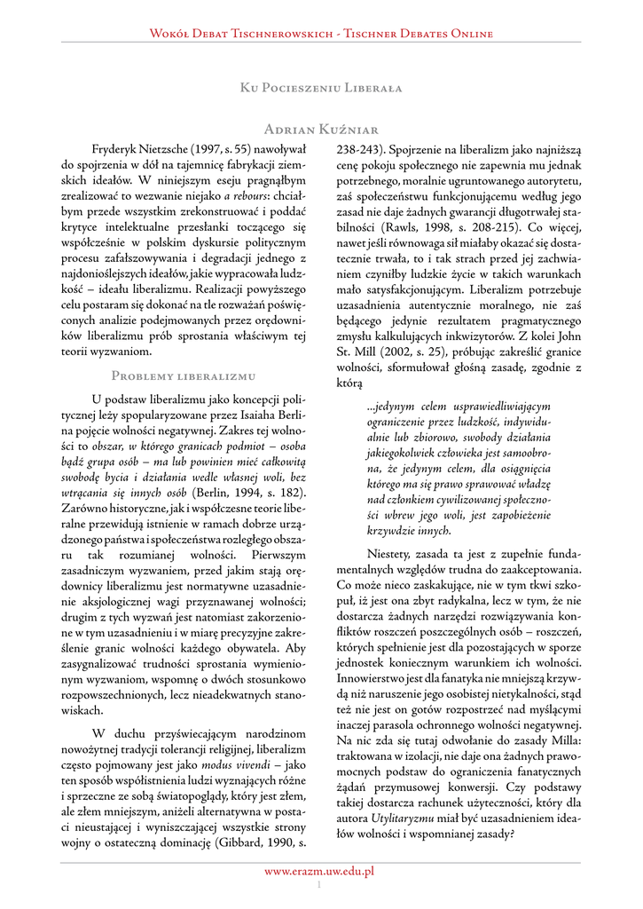 Wokół Debat Tischnerowskich - Tischner Debates Online Ku Pocieszeniu Liberała Adrian Kuźniar Fryderyk Nietzsche (1997, s. 55) nawoływał do spojrzenia w dół na tajemnicę fabrykacji ziemskich ideałów. W niniejszym eseju pragnąłbym zrealizować to wezwanie niejako a rebours: chciałbym przede wszystkim zrekonstruować i poddać krytyce intelektualne przesłanki toczącego się współcześnie w polskim dyskursie politycznym procesu zafałszowywania i degradacji jednego z najdonioślejszych ideałów, jakie wypracowała ludzkość – ideału liberalizmu. Realizacji powyższego celu postaram się dokonać na tle rozważań poświęconych analizie podejmowanych przez orędowników liberalizmu prób sprostania właściwym tej teorii wyzwaniom. 238-243). Spojrzenie na liberalizm jako najniższą cenę pokoju społecznego nie zapewnia mu jednak potrzebnego, moralnie ugruntowanego autorytetu, zaś społeczeństwu funkcjonującemu według jego zasad nie daje żadnych gwarancji długotrwałej stabilności (Rawls, 1998, s. 208-215). Co więcej, nawet jeśli równowaga sił miałaby okazać się dostatecznie trwała, to i tak strach przed jej zachwianiem czyniłby ludzkie życie w takich warunkach mało satysfakcjonującym. Liberalizm potrzebuje uzasadnienia autentycznie moralnego, nie zaś będącego jedynie rezultatem pragmatycznego zmysłu kalkulujących inkwizytorów. Z kolei John St. Mill (2002, s. 25), próbując zakreślić granice wolności, sformułował głośną zasadę, zgodnie z którą Problemy liberalizmu U podstaw liberalizmu jako koncepcji politycznej leży spopularyzowane przez Isaiaha Berlina pojęcie wolności negatywnej. Zakres tej wolności to obszar, w którego granicach podmiot – osoba bądź grupa osób – ma lub powinien mieć całkowitą swobodę bycia i działania wedle własnej woli, bez wtrącania się innych osób (Berlin, 1994, s. 182). Zarówno historyczne, jak i współczesne teorie liberalne przewidują istnienie w ramach dobrze urządzonego państwa i społeczeństwa rozległego obszaru tak rozumianej wolności. Pierwszym zasadniczym wyzwaniem, przed jakim stają orędownicy liberalizmu jest normatywne uzasadnienie aksjologicznej wagi przyznawanej wolności; drugim z tych wyzwań jest natomiast zakorzenione w tym uzasadnieniu i w miarę precyzyjne zakreślenie granic wolności każdego obywatela. Aby zasygnalizować trudności sprostania wymienionym wyzwaniom, wspomnę o dwóch stosunkowo rozpowszechnionych, lecz nieadekwatnych stanowiskach. ...jedynym celem usprawiedliwiającym ograniczenie przez ludzkość, indywidualnie lub zbiorowo, swobody działania jakiegokolwiek człowieka jest samoobrona, że jedynym celem, dla osiągnięcia którego ma się prawo sprawować władzę nad członkiem cywilizowanej społeczności wbrew jego woli, jest zapobieżenie krzywdzie innych. Niestety, zasada ta jest z zupełnie fundamentalnych względów trudna do zaakceptowania. Co może nieco zaskakujące, nie w tym tkwi szkopuł, iż jest ona zbyt radykalna, lecz w tym, że nie dostarcza żadnych narzędzi rozwiązywania konfliktów roszczeń poszczególnych osób – roszczeń, których spełnienie jest dla pozostających w sporze jednostek koniecznym warunkiem ich wolności. Innowierstwo jest dla fanatyka nie mniejszą krzywdą niż naruszenie jego osobistej nietykalności, stąd też nie jest on gotów rozpostrzeć nad myślącymi inaczej parasola ochronnego wolności negatywnej. Na nic zda się tutaj odwołanie do zasady Milla: traktowana w izolacji, nie daje ona żadnych prawomocnych podstaw do ograniczenia fanatycznych żądań przymusowej konwersji. Czy podstawy takiej dostarcza rachunek użyteczności, który dla autora Utylitaryzmu miał być uzasadnieniem ideałów wolności i wspomnianej zasady? W duchu przyświecającym narodzinom nowożytnej tradycji tolerancji religijnej, liberalizm często pojmowany jest jako modus vivendi – jako ten sposób współistnienia ludzi wyznających różne i sprzeczne ze sobą światopoglądy, który jest złem, ale złem mniejszym, aniżeli alternatywna w postaci nieustającej i wyniszczającej wszystkie strony wojny o ostateczną dominację (Gibbard, 1990, s. www.erazm.uw.edu.pl Wokół Debat Tischnerowskich - Tischner Debates Online Calculemus czającej internalizacji. Przywiązanie do ochrony wolności negatywnej byłoby traktowane wyłącznie jako instrumentalne, a stąd byłoby podatne na stłumienie przez tych, którzy uzasadnialiby swą tyranię głosząc, że chociaż sprzeciwia się ona liberalnemu ideałowi, to bliższa jest prawdziwemu, tj. utylitarystycznemu celowi. Jeśli zastosować by powszechnie przyjęty podział, to należałoby stwierdzić, że liberalny światopogląd zakorzeniony jest we wrażliwości moralnej o deontologicznym, a nie konsekwencjalistycznym charakterze. Można wnosić o tym z braku odporności liberalnych intuicji na tradycyjny typ kontrargumentów wysuwanych przeciwko tym ostatnim systemom etycznym. Czyż wolność osobista jednostki powinna być ograniczona tam, gdzie jej jednodniowe uwięzienie byłoby igrzyskiem milionów? Zresztą dysonans deontologicznej proweniencji i konsekwencjalistycznego ugruntowania wyraźnie słychać w dziele Milla (2002). Ten wybitny filozof z taką determinacją broni wolności, jakby chciał z góry wykluczyć wszelkie niezgodne z duchem liberalizmu, a możliwe ze względów utylitarystycznych od tej wolności wyjątki. Biorąc prawa poważnie Kwestię deontologicznych ograniczeń traktuje za to wyjątkowo poważnie libertarianizm. Zwolennicy tego poglądu uznają minimalny, dość dokładnie określony i nie oparty już na jakichkolwiek dalszych przesłankach katalog praw naturalnych przysługujących każdej osobie ludzkiej. Honorowanie tych praw ma zapewniać, jak ujął to patron libertarian John Locke (1992, s. 165), stan zupełnej wolności. Prawa te zabraniają stosowania przemocy fizycznej, chyba że prewencyjnie lub w odwecie za wcześniejs