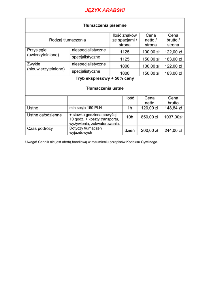 JĘZYK ARABSKI Tłumaczenia pisemne Rodzaj tłumaczenia Ilość znaków ze spacjami / strona Cena netto / strona Cena brutto / strona Przysięgłe (uwierzytelnione) niespecjalistyczne 1125 100,00 zł 122,00 zł specjalistyczne 1125 150,00 zł 183,00 zł Zwykłe (nieuwierzytelnione) niespecjalistyczne 1800 100,00 zł 122,00 zł 150,00 zł 183,00 zł specjalistyczne 1800 Tryb ekspresowy + 50% ceny Tłumaczenia ustne Ilość Ustne min sesja 150 PLN Ustne całodzienne + stawka godzinna powyżej 10 godz. + koszty transportu, wyżywienia, zakwaterowania. Dotyczy tłumaczeń wyjazdowych Czas podróży 1h Cena netto 120,00 zł Cena brutto 148,84 zł 10h 850,00 zł 1037,00zł dzień 200,00 zł 244,00 zł Uwaga! Cennik nie jest ofertą handlową w rozumieniu przepisów Kodeksu Cywilnego.