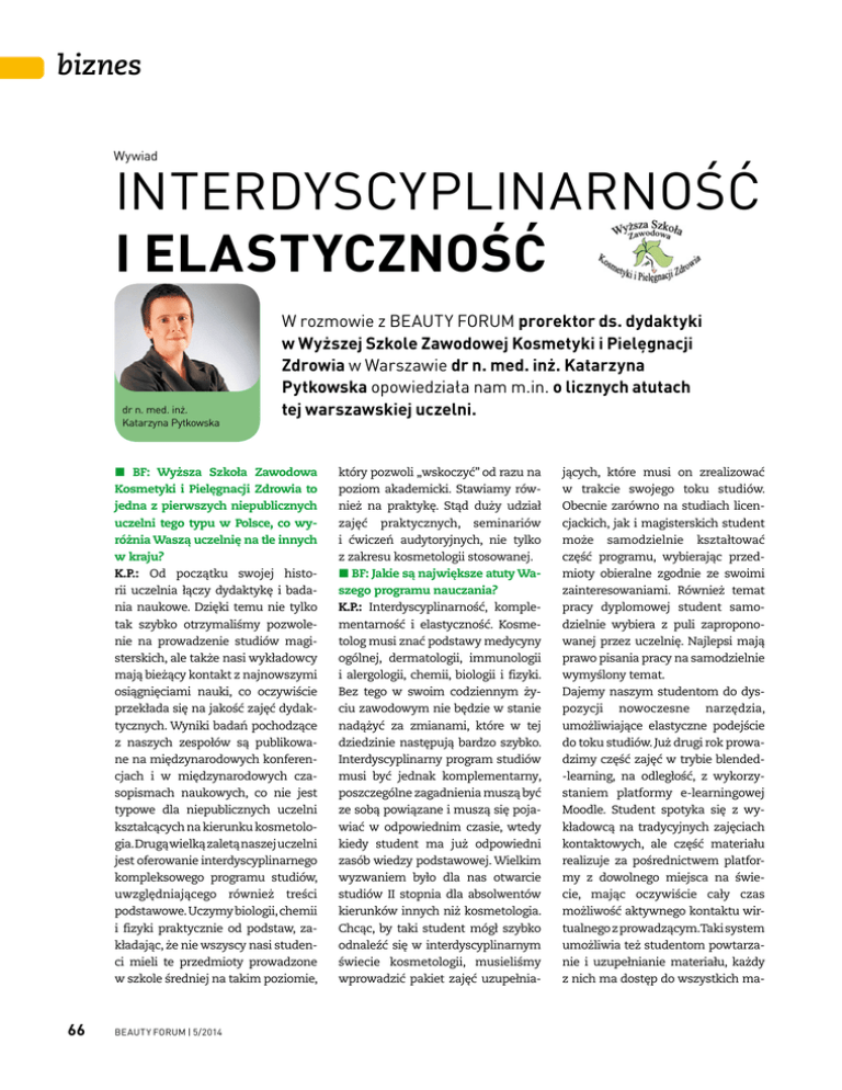 biznes Wywiad Interdyscyplinarność i elastyczność dr n. med. inż. Katarzyna Pytkowska W rozmowie z BEAUTY FORUM prorektor ds. dydaktyki w Wyższej Szkole Zawodowej Kosmetyki i Pielęgnacji Zdrowia w Warszawie dr n. med. inż. Katarzyna Pytkowska opowiedziała nam m.in. o licznych atutach tej warszawskiej uczelni. BF: Wyższa Szkoła Zawodowa Kosmetyki i Pielęgnacji Zdrowia to jedna z pierwszych niepublicznych uczelni tego typu w Polsce, co wyróżnia Waszą uczelnię na tle innych w kraju? K.P.: Od początku swojej historii uczelnia łączy dydaktykę i badania naukowe. Dzięki temu nie tylko tak szybko otrzymaliśmy pozwolenie na prowadzenie studiów magisterskich, ale także nasi wykładowcy mają bieżący kontakt z najnowszymi osiągnięciami nauki, co oczywiście przekłada się na jakość zajęć dydaktycznych. Wyniki badań pochodzące z naszych zespołów są publikowane na międzynarodowych konferencjach i w międzynarodowych czasopismach naukowych, co nie jest typowe dla niepublicznych uczelni kształcących na kierunku kosmetologia. Drugą wielką zaletą naszej uczelni jest oferowanie interdyscyplinarnego kompleksowego programu studiów, uwzględniającego również treści podstawowe. Uczymy biologii, chemii i fizyki praktycznie od podstaw, zakładając, że nie wszyscy nasi studenci mieli te przedmioty prowadzone w szkole średniej na takim poziomie, 66 BEAUTY FORUM | 5/2014 który pozwoli „wskoczyć” od razu na poziom akademicki. Stawiamy również na praktykę. Stąd duży udział zajęć praktycznych, seminariów i ćwiczeń audytoryjnych, nie tylko z zakresu kosmetologii stosowanej. BF: Jakie są największe atuty Waszego programu nauczania? K.P.: Interdyscyplinarność, komplementarność i elastyczność. Kosmetolog musi znać podstawy medycyny ogólnej, dermatologii, immunologii i alergologii, chemii, biologii i fizyki. Bez tego w swoim codziennym życiu zawodowym nie będzie w stanie nadążyć za zmianami, które w tej dziedzinie następują bardzo szybko. Interdyscyplinarny program studiów musi być jednak komplementarny, poszczególne zagadnienia muszą być ze sobą powiązane i muszą się pojawiać w odpowiednim czasie, wtedy kiedy student ma już odpowiedni zasób wiedzy podstawowej. Wielkim wyzwaniem było dla nas otwarcie studiów II stopnia dla absolwentów kierunków innych niż kosmetologia. Chcąc, by taki student mógł szybko odnaleźć się w interdyscyplinarnym świecie kosmetologii, musieliśmy wprowadzić pakiet zajęć uzupełnia- jących, które musi on zrealizować w trakcie swojego toku studiów. Obecnie zarówno na studiach licencjackich, jak i magisterskich student może samodzielnie kształtować część programu, wybierając przedmioty obieralne zgodnie ze swoimi zainteresowaniami. Również temat pracy dyplomowej student samodzielnie wybiera z puli zaproponowanej przez uczelnię. Najlepsi mają prawo pisania pracy na samodzielnie wymyślony temat. Dajemy naszym studentom do dyspozycji nowoczesne narzędzia, umożliwiające elastyczne podejście do toku studiów. Już drugi rok prowadzimy część zajęć w trybie blended-learning, na odległość, z wykorzystaniem platformy e-learningowej Moodle. Student spotyka się z wykładowcą na tradycyjnych zajęciach kontaktowych, ale część materiału realizuje za pośrednictwem platformy z dowolnego miejsca na świecie, mając oczywiście cały czas możliwość aktywnego kontaktu wirtualnego z prowadzącym.Taki system umożliwia też studentom powtarzanie i uzupełnianie materiału, każdy z nich ma dostęp do wszystkich ma- biznes teriałów e-learningowych, niezależnie od trybu i poziomu studiów. Od roku rozwijamy również elastyczny system kształcenia przez całe życie. Każdy zainteresowany może wziąć udział w zajęciach dotyczących różnych zagadnień kosmetologii i chemii kosmetycznej, może pozostać przy kilku wybranych zagadnieniach, może również z oferowanych przez nas modułów zbudować sobie pełen program studiów podyplomowych. BF: A co z bazą dydaktyczną? K.P.: W tym zakresie nie mamy się czego wstydzić. Na terenie uczelni studenci mają do dyspozycji cztery gabinety kosmetyczne, salę zajęć do masażu i fizjoterapii, gabinet podologiczny, trzy duże laboratoria chemiczne do zajęć z kosmetykologii, receptury, metod oceny kosmetyków itp., oczywiście towarzyszą im sale seminaryjne i duże aule wykładowe. Poza gabinetem podologicznym, wszystkie sale zajęć praktycznych umożliwiają samodzielną pracę dużych grup studenckich. Gabinety i laboratoria są wyposażone w nowoczesną aparaturę zabiegową i pomiarową, te zasoby cały czas uzupełniamy i modernizujemy. Metoda „pokazuję i objaśniam” jest dobra jako wprowadzenie, później nasz student musi wykonywać ćwiczenia samodzielnie, rzecz jasna pod ścisłym nadzorem prowadzących. Większość terenu uczelni pokrywa zasięg bezpłatnego dla studentów uczelnianego bezprzewodowego internetu, więc można korzystać na miejscu z zajęć e-learningowych oraz nieprzebranych zasobów Wirtualnej Biblioteki Nauki. Na miejscu jest także tradycyjna biblioteka, otwarta również w weekendy dla studentów studiów niestacjonarnych. BF: Kto stanowi kadrę dydaktyczną Waszej uczelni? K.P.: Przez prawie 15 lat działania uczelni udało się nam zbudo- wać interdyscyplinarny zespół. W skład kadry wchodzą lekarze różnych specjalności, w tym z tytułami profesorskimi, chemicy, fizycy, biolodzy, wywodzący się z różnych ośrodków akademickich, kształcimy również własne kadry naukowe, oferując absolwentom różnych kierunków studiów stypendia doktoranckie i finansując ich badania, prowadzone na terenie naszej uczelni. Ostatnie lata zaowocowały trzema naszymi doktorami i mam nadzieję, że w momencie ukazania się tego numeru będziemy mogli się pochwalić dwoma kolejnymi. Powoli zbliża się też moment pierwszych habilitacji. Zatrudniamy również bardzo dużą grupę specj