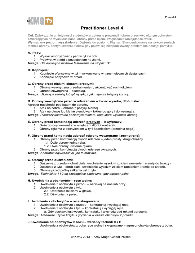P level 4 Practitioner Level 4 Cel: Zwiększanie umiejętności studentów w zakresie prewencji i obron przeciwko różnym uchwytom, zmierzającym na wysokość pasa, obrony przed kijem, zwiększanie umiejętności walki. Wymagany poziom wyszkolenia: Dążenie do poziomu Fighter. Skoncentrowanie na wykończeniach technik obrony, kontynuowaniu ataków gdy pojawi się niespodziewany problem lub nastąpi pomyłka. A. Pady: 1. Wysoki amortyzowany pad w tył i w bok. 2. Przewrót w przód z pozostaniem na ziemi. Uwaga: Dla dorosłych możliwe testowanie na stopniu G1. B. Kopnięcia: 1. Kopnięcie ofensywne w tył – wykonywane w trzech głównych dystansach. 2. Kopnięcie nożycowe w przód. C. Obrony przed niskimi ciosami prostymi: 1. Obrona wewnętrzna przedramieniem, akcentować ruch łokciem. 2. Obrona zewnętrzna – scooping. Uwaga: Używaj przedniej lub tylnej ręki, z jak najwcześniejszą kontrą. D. Obrony wewnętrzne przeciw uderzeniem – łokieć wysoko, dłoń nisko: Agresor nadchodzi pod kątem do obrońcy. 1. Atak na żebra – obrona z pozycji biernej. 2. Atak na głowę lub klatkę piersiową – łokieć do góry i do wewnątrz. Uwaga: Pierwszy kontratak poziomym młotem, ręką które wykonała obronę. E. Obrony przed kombinacją uderzeń prostych – lewy/prawy: 1. Dwie obrony wewnętrzne wnętrzem dłoni i kontratak. 2. Obrony rękoma z odchyleniem w tył i kopnięciem (przednią nogą). F. Obrony przed kombinacją uderzeń (obrony wewnętrzne i zewnętrzne): 1. Obrony przed kombinacją dwóch uderzeń – jeden prosty, drugi okrężny. 1.1. Dwie obrony jedną ręką. 1.2. Dwie obrony, dwiema rękami. 2. Obrony przed kombinacją dwóch uderzeń okrężnych. Uwaga: Kontratak najwcześniej, jak to możliwe. G. Obrony przed duszeniami: 1. Duszenie z przodu – obrót ciała, uwolnienie wysokim zbiciem ramieniem (ramię do twarzy). 2. Duszenie z tyłu – obrót ciała, uwolnienie wysokim zbiciem ramieniem (ramię do skroni). 3. Obrona przed próbą zatkania ust z tyłu. Uwaga: Techniki nr 1 i 2 są szczególnie skuteczne, gdy agresor pcha. H. Uwolnienia z obchwytów – ręce wolne: 1. Uwolnienie z obchwytu z przodu – naciskaj na nos lub oczy. 2. Uwolnienie z obchwytu z tyłu: 2.1. Uderzenia łokciami w głowę. 2.2. Dźwignia na palec. I. Uwolnienia z obchwytów – ręce skrępowane: 1. Uwolnienie z obchwytu z przodu – kontratakuj i wyciągaj ręce. 2. Uwolnienie z obchwytu z tyłu – kontratakuj i wyciągaj ręce. a. Gdy obchwyt jest wysoki, kontrataku i wychodź pod rękami agresora. Uwaga: Trenować użycie krzyku i gryzienia w czasie obchwytu z przodu. J. Uwolnienia od obchwytów z boku – warianty technik H i I: Uwolnienia z obchwytów z boku ręce wolne i skrępowane – agresor chwyta obrońcę z boku. © KMG 2013 – Krav Maga Global Polska P level 4 K. Obrony przed próbą złapania i niebezpiecznym uchwytem ramienia/nadgarstka: 1. Prewencja: usuwanie celu uchwytu; obrona celu uchwytu; 2. Agresor złapał i ciągnie – ruch do przodu i zadanie odpowiedniego kontrataku. 3. Agresor złapał i uderza – użyj odpowiedniej obrony i kontratakuj. L. Uwolnienia z uchwytów nadgarstków: 1. Jedna ręka trzyma jedną rękę – ukośnie lub na wprost. Uchwyt niski. 2. Jedna ręka trzyma jedną rękę – ukośnie lub na wprost. Uchwyt wysoki. 3. Dwie ręce trzymają jedną rękę, uchwyt niski lub wysoki – dwa rozwiązania: a. Ręka wolna pomaga poprzez chwyt pięści. b. Ręka wolna pomaga poprzez zerwanie jednej z trzymających rąk. 4. Dwie ręce trzymają dwie ręce – uchwyt niski i wysoki. 5. Dwie ręce trzymają dwie ręce – uchwyt z tyłu. 6. Uwolnienie z silnego uścisku dłoni. Uwaga: Konieczne jest zapoznanie się z punktami kluczowymi: oś obrotu i dźwignia (bez szarpania); uwolnienie dzięki otwieraniu się dłoni agresora, ruchy orężne, użycie drugiej ręki w asyście. M. Obrony przed atakiem pałką – atak okrężny i znad głowy: 1. Atak jedną ręką znad głowy – obrona zewnętrzna pchająca na żywą stronę. 2. Atak oburącz znad głowy lub gdy obrońca nie stoi centralnie do agresora 3. Poziomy atak okrężny – typu baseball: 3.1. Z pozycji biernej – przednia ręka do dołu, tylna przy twarzy. 3.2. Z podstawowej pozycji walki – obrona dwoma przedramionami ustawionymi wysoko. N. Gry walki: 4 przeciw 1 1. Przeciwko uderzeniom prostym; przeciwko kopnięciom prostym i uderzeniom prostym. O. Uderzenia na cel – kombinacje wszystkich poznanych ataków: P. Powracający agresor: 1. Pomimo działań obrońcy, agresor wraca z określonym atakiem, z bronią lub bez. Q. Umiejętności walki: 1. Akcentowanie zmian dystansu. 2. Używanie zasad: 2.1. ataku w przód, a następnie okrążaniu. 2.2. okrążaniu, a następnie zaatakowaniu w przód. 3. Ćwiczenie determinacji: 3.1 Atakujący – Przeszkadzający – Cel 3.2. Atakujący – Cel – Przeszkadzający (trzyma z tyłu) 4. Slow fighting – walka w zwolnionym tempie. 5. Light Fighting z minimalną ilością ochraniaczy (lekki kontakt). R. Symulacja i taktyka P4 – Dwóch agresorów nadchodzi z dwóch różnych kierunków. 2 na 1 – Obchwyty niedźwiedzie (następnie obchwyty głowy) z tyłu i drugi atak nadchodzący z przodu. Pułapka zastawiona przez dwóch agresorów. © KMG 2013 – Krav Maga Global Polska P level 4 EXTRA CURRICULUM – nie obowiązuje na egzaminie na P4 I. Uwolnienie od złapania za ramię: 1. Agresor uchwycił za rękę powyżej łokcia. Obrona ruchem kolistym w kierunku kciuka agresora. II. Odpowiedź na odpowiedź agresora: 1. Student atakuje kopnięciem prostym na strefę kroku, agresor odskakuje – kontynuowanie kopnięć, również na ślizgu nogi podporowej. 2. j.w. lecz agresor skraca dystans poprzez ruch ukośnie do przodu – kontynuowanie kopnięciami w krótkim dystansie lub ataki rękami. III. Obrona przeciwko dwóm ciosom prostym w kombinacji (lewy/prawy): 1. Odchylenie w celu uniknięcia pierwszego ataku, z powrotem obrona przed drugim ciosem