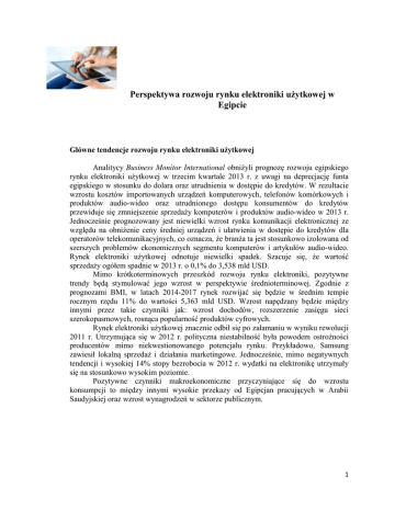 Perspektywa rozwoju rynku elektroniki użytkowej w Egipcie Główne tendencje rozwoju rynku elektroniki użytkowej Analitycy Business Monitor International obniżyli prognozę rozwoju egipskiego rynku elektroniki użytkowej w trzecim kwartale 2013 r. z uwagi na deprecjację funta egipskiego w stosunku do dolara oraz utrudnienia w dostępie do kredytów. W rezultacie wzrostu kosztów importowanych urządzeń komputerowych, telefonów komórkowych i produktów audio-wideo oraz utrudnionego dostępu konsumentów do kredytów przewiduje się zmniejszenie sprzedaży komputerów i produktów audio-wideo w 2013 r. Jednocześnie prognozowany jest niewielki wzrost rynku komunikacji elektronicznej ze względu na obniżenie ceny średniej urządzeń i ułatwienia w dostępie do kredytów dla operatorów telekomunikacyjnych, co oznacza, że branża ta jest stosunkowo izolowana od szerszych problemów ekonomicznych segmentu komputerów i artykułów audio-wideo. Rynek elektroniki użytkowej odnotuje niewielki spadek. Szacuje się, że wartość sprzedaży ogółem spadnie w 2013 r. o 0,1% do 3,538 mld USD. Mimo krótkoterminowych przeszkód rozwoju rynku elektroniki, pozytywne trendy będą stymulować jego wzrost w perspektywie średnioterminowej. Zgodnie z prognozami BMI, w latach 2014-2017 rynek rozwijać się będzie w średnim tempie rocznym rzędu 11% do wartości 5,363 mld USD. Wzrost napędzany będzie między innymi przez takie czynniki jak: wzrost dochodów, rozszerzenie zasięgu sieci szerokopasmowych, rosnąca popularność produktów cyfrowych. Rynek elektroniki użytkowej znacznie odbił się po załamaniu w wyniku rewolucji 2011 r. Utrzymująca się w 2012 r. polityczna niestabilność była powodem ostrożności producentów mimo niekwestionowanego potencjału rynku. Przykładowo, Samsung zawiesił lokalną sprzedaż i działania marketingowe. Jednocześnie, mimo negatywnych tendencji i wysokiej 14% stopy bezrobocia w 2012 r. wydatki na elektronikę utrzymały się na stosunkowo wysokim poziomie. Pozytywne czynniki makroekonomiczne przyczyniające się do wzrostu konsumpcji to między innymi wysokie przekazy od Egipcjan pracujących w Arabii Saudyjskiej oraz wzrost wynagrodzeń w sektorze publicznym. 1 Rynek elektroniki użytkowej w Egipcie (mln USD) 2010-2017 źródło: Business Monitor International, 2013, za EMIS Prognozy rozwoju w perspektywie średniookresowej Chociaż ograniczenie dostępności kredytów i deprecjacja waluty ograniczają potencjał wzrostu w 2013 r., analitycy BMI szacują, że warunki makroekonomiczne będą korzystne dla ekspansji rynku w perspektywie średnioterminowej. Prognozowany realny wzrost konsumpcji prywatnej kształtować się będzie na poziomie ok. 4,9% rocznie w okresie 2013 – 2017, co wzmocni zaufanie przedsiębiorców oraz zwiększy wydatki detaliczne. Do rozwoju tego trendu przyczynią się zarówno wzrost poziomu płac jak i zwiększenie wartości przekazów od Egipcjan pracujących za granicą. Jednocześnie siła nabywcza konsumentów może zostać ograniczona planowanym wzrostem cen paliw, co pociągnie za sobą zmniejszenie wydatków na luksusowe elementy stylu życia, takie jak kamery, aparaty fotograficzne i telewizory cyfrowe. Słabym punktem będą natomiast wydatki rządowe z prognozą realnego rozwoju na poziomie 1,6% w latach 2013 – 2017. Jednocześnie branża ICT wyznaczona została jako centrum strategii rozwoju, co oznacza, że zajmuje ona stosunkowo uprzywilejowaną pozycję w stosunku do pozostałych segmentów rynku elektroniki użytkowej. Rząd planuje zakup dużej ilości tabletów dla sektora edukacji w 2014 r., inwestuje również w rozbudowę przewodowej i bezprzewodowej infrastruktury szerokopasmowej, co zwiększy popyt na komputery przenośne i smartfony. W perspektywie średnioterminowej kolejnym korzystnym czynnikiem stymulującym rozwój egipskiego rynku elektroniki jest struktura demograficzna populacji z dużym odsetkiem ludzi młodych. Młodsze grupy konsumentów przeznaczają większą część swoich dochodów na elektronikę. Przewiduje się, że w momencie ich wejścia na rynek pracy znacznie zwiększy się sprzedaż komputerów, smartfonów i urządzeń audio-wideo. Rozwój rynku wspierać będą też inicjatywy rządowe takie jak 2 projekt: „komputer w każdym domu”. Rządowy plan inwestycji o wartości 1 mld USD na okres 4 lat zwiększy zasięg internetu szerokopasmowego do 20% populacji. Podłączenie dodatkowych 3 mln gospodarstw domowych do internetu oznaczać będzie zwiększenie zapotrzebowania na urządzenia łączności internetowej. Ponadto, rządowy plan cyfryzacji edukacji podstawowej do 2015 r. zwiększy sprzedaż sprzętu komputerowego i wykształci pokolenie konsumentów posiadających wiedzę techniczną. W rezultacie nałożenia się tych korzystnych trendów Egipt będzie jednym z najszybciej rozwijających się rynków konsumenckich w regionie. Należy jednak wziąć pod uwagę różnice regionalne rynku pod względem wielkości dochodów konsumentów, ich umiejętności komputerowych i stylu życia. Podczas gdy większość wykształconej klasy średniej skupia się w większych miastach, gdzie funkcjonują nowoczesne punkty sprzedaży detalicznej, istnieją też regiony rozwinięte znacznie słabiej, gdzie wielu konsumentów dokonuje zakupów elektroniki użytkowej o niższej wartości. Udział poszczególnych segmentów w wartości rynku: Sprzęt telekomunikacyjny Analitycy BMI prognozują, że zestawy telefonów komórkowych pozostaną dominującą kategorią zarówno pod względem wartości jak i wielkości sprzedaży - będzie to jedyny segment rynku, który odnotuje wzrost w 2013 r. Zestawy komórkowe generować będą ok. 61% wydatków w okresie 2013 - 2017 ponieważ konsumenci będą dążyć do coraz większych zakupów telefonów i smartfonów, windując średnią cenę urządzeń. W perspektywie krótkoterminowej rynek zdominowany będzie przez abonentów korzystających