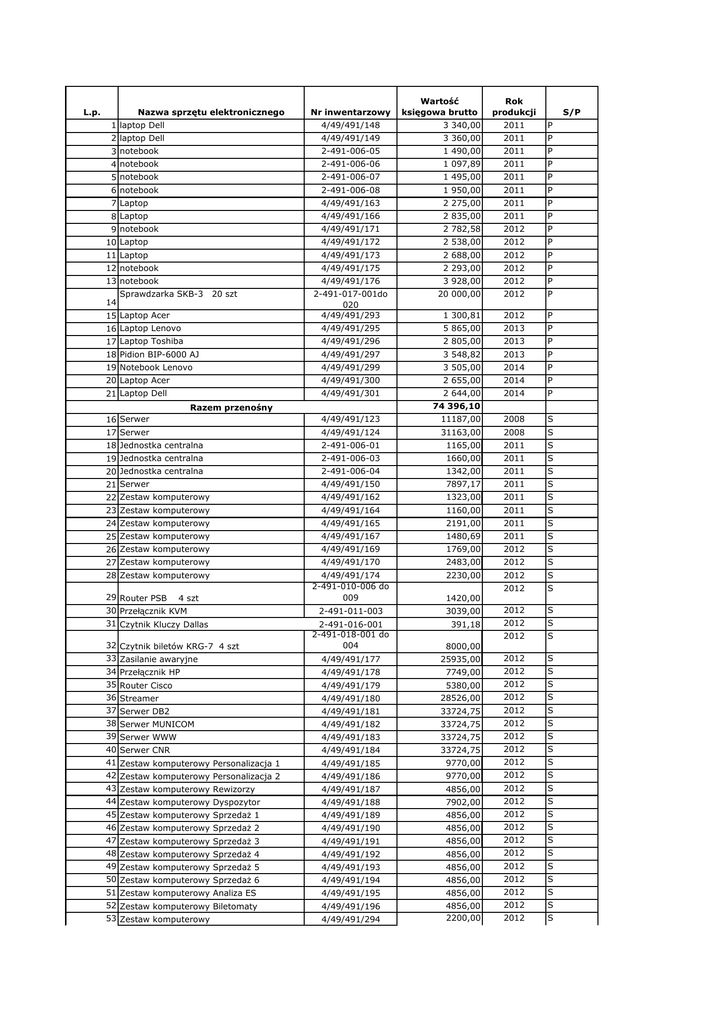 L.p. Nazwa sprzętu elektronicznego 1 laptop Dell Nr inwentarzowy 4/49/491/148 Wartość księgowa brutto 3 340,00 Rok produkcji S/P 2011 P P 2 laptop Dell 4/49/491/149 3 360,00 2011 3 notebook 2-491-006-05 1 490,00 2011 P 4 notebook 2-491-006-06 1 097,89 2011 P 5 notebook 2-491-006-07 1 495,00 2011 P 6 notebook 2-491-006-08 1 950,00 2011 P 7 Laptop 4/49/491/163 2 275,00 2011 P 8 Laptop 4/49/491/166 2 835,00 2011 P 9 notebook P 4/49/491/171 2 782,58 2012 10 Laptop 4/49/491/172 2 538,00 2012 P 11 Laptop 4/49/491/173 2 688,00 2012 P 12 notebook 4/49/491/175 2 293,00 2012 P 13 notebook 4/49/491/176 3 928,00 2012 P 20 000,00 2012 P 1 300,81 2012 P P 14 Sprawdzarka SKB-3 20 szt 15 Laptop Acer 2-491-017-001do 020 4/49/491/293 16 Laptop Lenovo 4/49/491/295 5 865,00 2013 17 Laptop Toshiba 4/49/491/296 2 805,00 2013 P 18 Pidion BIP-6000 AJ 4/49/491/297 3 548,82 2013 P 19 Notebook Lenovo 4/49/491/299 3 505,00 2014 P 20 Laptop Acer 4/49/491/300 2 655,00 2014 P 21 Laptop Dell 4/49/491/301 2 644,00 2014 P S 74 396,10 Razem przenośny 16 Serwer 4/49/491/123 11187,00 2008 17 Serwer 4/49/491/124 31163,00 2008 S 18 Jednostka centralna 2-491-006-01 1165,00 2011 S 19 Jednostka centralna 2-491-006-03 1660,00 2011 S 20 Jednostka centralna 2-491-006-04 1342,00 2011 S 21 Serwer 4/49/491/150 7897,17 2011 S 22 Zestaw komputerowy 4/49/491/162 1323,00 2011 S 23 Zestaw komputerowy 4/49/491/164 1160,00 2011 S 24 Zestaw komputerowy 4/49/491/165 2191,00 2011 S 25 Zestaw komputerowy 4/49/491/167 1480,69 2011 S 26 Zestaw komputerowy 4/49/491/169 1769,00 2012 S 27 Zestaw komputerowy 4/49/491/170 2483,00 2012 S 28 Zestaw komputerowy 4/49/491/174 2-491-010-006 do 009 2230,00 1420,00 2-491-011-003 3039,00 2012 S 391,18 2012 S 2012 S 2012 S 29 Router PSB 4 szt 30 Przełącznik KVM 31 Czytnik Kluczy Dallas 32 Czytnik biletów KRG-7 4 szt 33 Zasilanie awaryjne 34 Przełącznik HP 35 Router Cisco 36 Streamer 37 Serwer DB2 38 Serwer MUNICOM 39 Serwer WWW 40 Serwer CNR 41 Zestaw komputerowy Personalizacja 1 42 Zestaw komputerowy Personalizacja 2 43 Zestaw komputerowy Rewizorzy 44 Zestaw komputerowy Dyspozytor 45 Zestaw komputerowy Sprzedaż 1 46 Zestaw komputerowy Sprzedaż 2 2-491-016-001 2-491-018-001 do 004 8000,00 2012 S 2012 S 4/49/491/177 25935,00 4/49/491/178 7749,00 2012 S 4/49/491/179 5380,00 2012 S 4/49/491/180 28526,00 2012 S 4/49/491/181 33724,75 2012 S 4/49/491/182 33724,75 2012 S 4/49/491/183 33724,75 2012 S 4/49/491/184 33724,75 2012 S 4/49/491/185 9770,00 2012 S 4/49/491/186 9770,00 2012 S 4/49/491/187 4856,00 2012 S 4/49/491/188 7902,00 2012 S 4/49/491/189 4856,00 2012 S 4/49/491/190 4856,00 2012 S S 47 Zestaw komputerowy Sprzedaż 3 48 Zestaw komputerowy Sprzedaż 4 49 Zestaw komputerowy Sprzedaż 5 50 Zestaw komputerowy Sprzedaż 6 4/49/491/191 4856,00 2012 4/49/491/192 4856,00 2012 S 4/49/491/193 4856,00 2012 S 4/49/491/194 4856,00 2012 S 51 Zestaw komputerowy Analiza ES 52 Zestaw komputerowy Biletomaty 53 Zestaw komputerowy 4/49/491/195 4856,00 2012 S 4/49/491/196 4856,00 2200,00 2012 S 2012 S 4/49/491/294 Razem stacjonarny Ogółem sprzęt elektroniczny 355736,04 430132,14