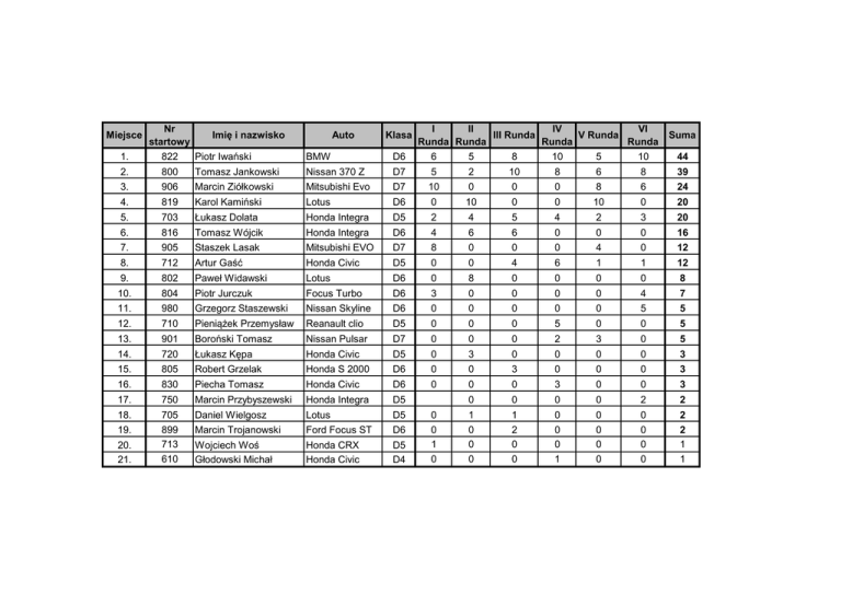 Miejsce Nr startowy 1. 822 Piotr Iwański BMW D6 6 5 8 10 5 10 44 2. 800 Tomasz Jankowski Nissan 370 Z D7 5 2 10 8 6 8 39 3. 906 Marcin Ziółkowski Mitsubishi Evo D7 10 0 0 0 8 6 24 4. 819 Karol Kamiński Lotus D6 0 10 0 0 10 0 20 5. 703 Łukasz Dolata Honda Integra D5 2 4 5 4 2 3 20 6. 816 Tomasz Wójcik Honda Integra D6 4 6 6 0 0 0 16 7. 905 Staszek Lasak Mitsubishi EVO D7 8 0 0 0 4 0 12 8. 712 Artur Gaść Honda Civic D5 0 0 4 6 1 1 12 9. 802 Paweł Widawski Lotus D6 0 8 0 0 0 0 8 10. 804 Piotr Jurczuk Focus Turbo D6 3 0 0 0 0 4 7 11. 980 Grzegorz Staszewski Nissan Skyline D6 0 0 0 0 0 5 5 12. 710 Pieniążek Przemysław Reanault clio D5 0 0 0 5 0 0 5 13. 901 Boroński Tomasz Nissan Pulsar D7 0 0 0 2 3 0 5 14. 720 Łukasz Kępa Honda Civic D5 0 3 0 0 0 0 3 15. 805 Robert Grzelak Honda S 2000 D6 0 0 3 0 0 0 3 16. 830 Piecha Tomasz Honda Civic D6 0 0 0 3 0 0 3 17. 750 Marcin Przybyszewski Honda Integra D5 0 0 0 0 2 2 18. 705 Daniel Wielgosz Lotus D5 0 1 1 0 0 0 2 19. 899 713 Marcin Trojanowski Ford Focus ST D6 Wojciech Woś Głodowski Michał Honda CRX Honda Civic D5 D4 0 1 0 0 2 0 0 0 0 0 0 0 2 1 0 0 0 1 0 0 1 20. 21. 610 Imię i nazwisko Auto Klasa I II IV VI III Runda V Runda Runda Runda Runda Runda Suma