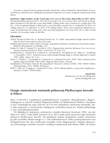 Liczenia w różnych latach przeprowadzili: Marek Elas, Łukasz Wardecki, Dawid Sikora, Krzysztof Pietrasz, Michał Lecyk. Dziękuję Krzysztofowi Kajzerowi za cenne uwagi do ostatecznej wersji tekstu. Summary: High number of the Corncrake Crex crex in the Lower Bug Valley in 2011–2013. During breeding seasons of 2011–2013 the Corncrake Crex crex surveys were carried out on floodplain meadows in the IBA the Lower Bug Valley. Calling males were counted on a single plot (790 ha – 2,9% of optimal habitat in IBA) twice a year. Densities varied from 4.3 males/km2 in 2013 (34 calling males) to 14 males/km2 in 2011 (110 calling males). There were significant differences in water level between the study years. The surveyed population can host from 5% to 20% of total number of Corncrake males in this IBA. Literatura AEWA Technical Series No. 9, Technical Series No. 14. 2006. International Single Species Action Plan for the Conservation of the Corncrake BirdLife International. 2004. Birds in Europe: population estimates, trends and conservation status. BirdLife International, Cambridge, U.K. Budka M., Ręk P., Osiejuk T.S., Jurczak K. 2012. Zagęszczenie samców derkacza Crex crex na wybranych powierzchniach w Polsce. Ornis Pol. 53: 165–174. Dombrowski A., Chylarecki P., Goławski A., Kuczborski R., Miciałkiewicz R., Mitrus C., Smoleński T., Zawadzki J. 2013. Awifauna tarasu zalewowego dolnego Bugu w okresie lęgowym w latach 1991–2000. Kulon 18: 3–31. Sikora A., Rohde Z., Gromadzki M., Neubauer G., Chylarecki P. (red.). 2007. Atlas rozmieszczenia ptaków lęgowych Polski 1985–2004. Bogucki Wyd. Nauk., Poznań. Standardowy Formularz Danych dla specjalnych obszarów ochrony (OSO), PLB 140001 Dolina Dolnego Bugu. 2013. GDOŚ, Warszawa. Wilk T., Jujka M., Krogulec J., Chylarecki P. (red.). 2010. Ostoje ptaków o znaczeniu międzynarodowym w Polsce. OTOP, Marki. Marek Elas Mickiewicza 19, 05-250 Radzymin [email protected] Drugie stwierdzenie świstunki północnej Phylloscopus borealis w Polsce Dnia 11.09.2013 w godzinach popołudniowych w punkcie obrączkowania „Bagno”, działającym w ramach Fundacji Wspierania Badań na Wędrówkami Ptaków, schwytano w sieci ornitologiczne typu mist-net 16×16 mm zielonkawo ubarwioną świstunkę. Sieci były ustawione w trzcinowisku okalającym zachodnią stronę jez. Kopań położonego w woj. zachodniopomorskim. Po dokładnym obejrzeniu, zmierzeniu i analizie literatury (Svensson 1992, van der Vliet et al. 2001, Cofta 2008, Svensson et al. 2011) ptak został oznaczony jako świstunka północna Phylloscopus borealis. Na podstawie stopnia skostnienia czaszki oznaczono go jako osobnika młodocianego w 1. roku kalendarzowym. Ptaka zaobrączkowano oraz sfotografowano tak, aby uwidocznić wszystkie cechy diagnostyczne. Stopień otłuszczenia schwytanego osobnika wynosił 2 według 8 stopniowej skali (Busse 2000). W trakcie 143 oznaczania ptak kilkakrotnie odezwał się krótkim, wysokim i twardo brzmiącym „dzyt”. Po wypuszczeniu ptak przysiadł na trzcinie wydając taki sam głos. Schwytana świstunka sylwetką zbliżona była do piecuszka Ph. trochilus, z którym była porównywana bezpośrednio podczas oznaczania. Odcień wierzchu głowy, płaszcza, pokryw skrzydłowych i lotek był intensywnie zielony, ciemniejszy niż u piecuszka. Bardziej intensywną zieleń płaszcza wykazują u świstunki północnej ptaki młodociane (van der Vliet et al. 2001). Schwytany ptak charakteryzował się bardzo długą projekcją lotek, co jest typowe dla tego gatunku, i jak podaje Marchetti i in. (1995) może mieć związek z długim dystansem migracji tego gatunku. Ostrolotka była krótsza o około 1 mm od zakończenia pokryw pierwszorzędowych, a emarginacja dochodziła do piątej lotki 1. rzędu. Szczyt skrzydła tworzyły lotki 3. i 4., a długość złożonego skrzydła wynosiła 66 mm. Formuła skrzydła przedstawiała się następująco: 3=4>5(2)>2-6(6)>7(11)>8(12). Długość ogona mierzona metodą do grzbietu (Busse 2000) wynosiła 46 mm. Na skrzydle były widoczne dość wyraźne dwa jasne paski, które znajdowały się na zakończeniach zewnętrznych średnich i dużych pokryw. Dodatkowo końcówki wewnętrznych lotek pierwszorzędowych były rozjaśnione. Podobnie zakończone były sterówki, szczególnie zewnętrzne. Spód ciała był biały z beżowym przyciemnieniem na piersi. Nogi ptaka były w kolorze brązowaworóżowym, natomiast dziób był u nasady żuchwy jasnożółty z ciemnym jej zakończeniem, szczęka jednolicie ciemno ubarwiona. Świstunkę północną można pomylić z wójcikiem Ph. trochiloides, świstunką amurską Ph. plumbeitarsus oraz świstunką kaukaską Ph. nitidus. Wszystkie wymienione gatunki mogą posiadać dwa jasne paski skrzydłowe, jednak ich szerokość i zasięg są zróżnicowane, co zwykle pozwala wykluczyć podczas oznaczania niektóre gatunki (Cofta 2008). Świstunkę północną charakteryzuje zwężający się w kierunku grzbietu pasek skrzydłowy dużych pokryw, który nigdy nie sięga skraju barkówek, co może zdarzyć się np. u świstunki amurskiej, której analogiczny pasek skrzydłowy jest znacznie dłuższy. Stosunkowo długi w porównaniu do świstunki północnej pasek skrzydłowy dużych pokryw występuje również u świstunki kaukaskiej. Ponadto świstunka północna, w odróżnieniu od amurskiej i kaukaskiej, ma dłuższą projekcję lotek oraz zwykle jaśniej ubarwione nogi. Szczyt skrzydła przypadający na 3. i 4. lotkę pierwszorzędową, poza świstunką północną, charakteryzuje tylko świstunkę kaukaską; u wymienionych wcześniej podobnych gatunków, szczyt skrzydła przypada zwykle na 4. i 5. lotkę (van der Vliet et al. 2001). Obszary lęgowe świstunki północnej położone najbliżej Polski znajdują się w północnej Skandynawii i rozciągają się dalej w kierunku wschodnim aż do Kamczatki i Alaski. Zasięg występowania tego gatunku podzielony jest pomiędzy trzy podg