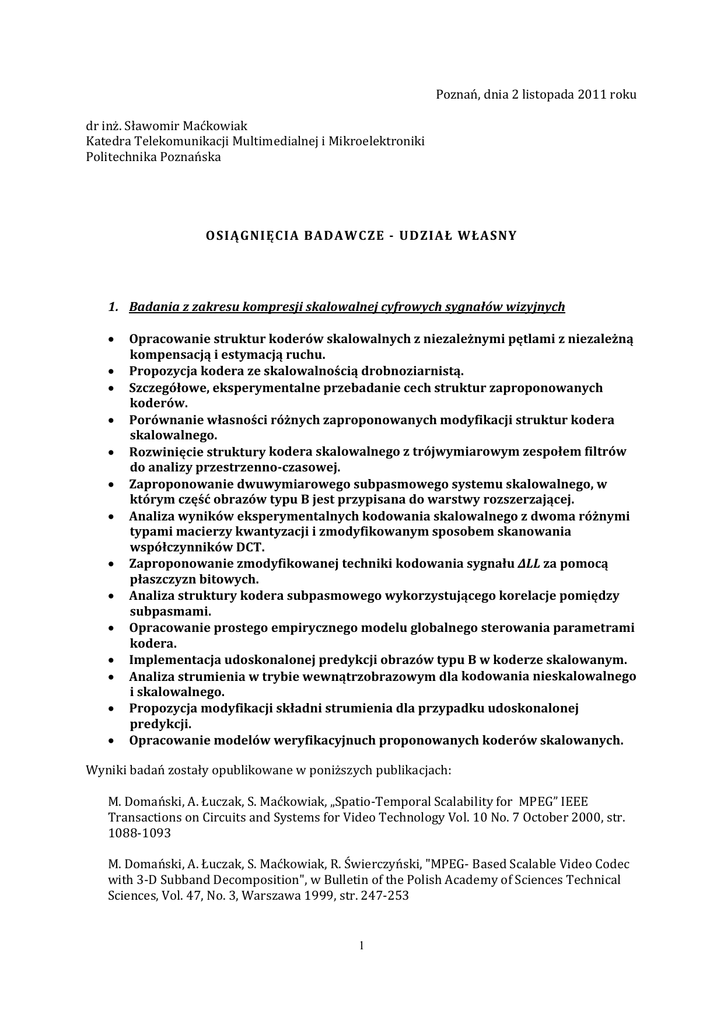 Poznań, dnia 2 listopada 2011 roku dr inż. Sławomir Maćkowiak Katedra Telekomunikacji Multimedialnej i Mikroelektroniki Politechnika Poznańska OSIĄGNIĘCIA BADAWCZE UDZIAŁ WŁASNY 1. Badania z zakresu kompresji skalowalnej cyfrowych sygnałów wizyjnych • • • • • • • • • • • • • • Opracowanie struktur koderów skalowalnych z niezależnymi pętlami z niezależną kompensacją i estymacją ruchu. Propozycja kodera ze skalowalnością drobnoziarnistą. Szczegółowe, eksperymentalne przebadanie cech struktur zaproponowanych koderów. Porównanie własności różnych zaproponowanych modyfikacji struktur kodera skalowalnego. Rozwinięcie struktury kodera skalowalnego z trójwymiarowym zespołem filtrów do analizy przestrzennoczasowej. Zaproponowanie dwuwymiarowego subpasmowego systemu skalowalnego, w którym część obrazów typu B jest przypisana do warstwy rozszerzającej. Analiza wyników eksperymentalnych kodowania skalowalnego z dwoma różnymi typami macierzy kwantyzacji i zmodyfikowanym sposobem skanowania współczynników DCT. Zaproponowanie zmodyfikowanej techniki kodowania sygnału ∆LL za pomocą płaszczyzn bitowych. Analiza struktury kodera subpasmowego wykorzystującego korelacje pomiędzy subpasmami. Opracowanie prostego empirycznego modelu globalnego sterowania parametrami kodera. Implementacja udoskonalonej predykcji obrazów typu B w koderze skalowanym. Analiza strumienia w trybie wewnątrzobrazowym dla kodowania nieskalowalnego i skalowalnego. Propozycja modyfikacji składni strumienia dla przypadku udoskonalonej predykcji. Opracowanie modelów weryfikacyjnuch proponowanych koderów skalowanych. Wyniki badań zostały opublikowane w poniższych publikacjach: M. Domański, A. Łuczak, S. Maćkowiak, „Spatio‐Temporal Scalability for MPEG” IEEE Transactions on Circuits and Systems for Video Technology Vol. 10 No. 7 October 2000, str. 1088‐1093 M. Domański, A. Łuczak, S. Maćkowiak, R. Świerczyński, "MPEG‐ Based Scalable Video Codec with 3‐D Subband Decomposition", w Bulletin of the Polish Academy of Sciences Technical Sciences, Vol. 47, No. 3, Warszawa 1999, str. 247‐253 1 M. Domański, A. Łuczak, S. Maćkowiak, R. Świerczyński, "Hybrid coding of video with spatio‐ temporal scalability using subband decomposition", Signal Processing IX: Theories and Applications, Typorama 1998 str. 53‐56, 1998 M. Domański, A. Łuczak, S. Maćkowiak, R. Świerczyński, "Hybrid coding of video with spatio‐ temporal scalability using subband decomposition", Proc. Of SPIE, vol. 3653, Visual Communication and Image Processing, VCIP’1999, str. 1018‐1025, San Jose, California, USA M. Domański, A. Łuczak, S. Maćkowiak, "Spatio‐Temporal Scalability using modified MPEG‐2 predictive video coding", Proceedings of European Signal Processing X, Tampere, Finlandia 2000, str. 961‐964 M. Domański, A. Łuczak, S. Maćkowiak, "On improving MPEG Spatial Scalability", Proceedings of 2000 International Conference of Image Processing ICIP Vancouver, Kanada, str II‐848 ‐ II‐851 M. Domański, S. Maćkowiak, Ł. Błaszak "Fine Granularity In Multi‐Loop Hybrid Coders With Multi‐Layer Scalability" Proceedings of IEEE Conference on Image Processing ICIP’2002, Rochester, NY, USA Marek Domański, Sławomir Maćkowiak, "Modified MPEG‐2 Video Coders with Efficient Multi‐Layer Scalability", Proceedings of IEEE International Conference of Image Processing ICIP’2001, vol. II, pp.1033‐1036, Thessaloniki, Grecja M. Domański, S. Maćkowiak, Ł. Blaszak "Scalable hybrid video coders with double motion compensation", Proceedings of IEEE International Symposium on Consumer Electronics ISCE'2002, September 23‐26, 2002 Erfurt, Niemcy M. Domański, A. Łuczak, S. Maćkowiak, R. Świerczyński, U. Benzler, "Spatio‐Temporal Scalable Video Codecs with MPEG‐Compatible Base Layer", Proceedings of Picture Coding Symposium, Portland 1999, str. 45‐48 M. Domański, A. Łuczak, S. Maćkowiak, "Scalable MPEG Video Coding with improved B‐ frame prediction", Proceedings of IEEE International Symposium Circuits and Systems ISCAS 2000, Genewa, Szwajcaria 2000 str.II‐273 II‐276 M. Domański, A. Łuczak, S. Maćkowiak, "Video Coding with Spatio‐ Temporal Scalability for applications in heterogeneous communication networks", Proceedings of IWSSIP'2000 7th. Int. Workshop on Systems, Signals and Image Processing, Maribor Słowenia 2000, str.127‐ 130 M. Domański, S. Maćkowiak, Ł. Blaszak "Efficient hybrid video coders with spatial and temporal scalability", Proceedings of IEEE International Conference on Multimedia and Expo ICME'2002, August 26‐29, 2002 Lausanne, Szwajcaria M. Domański, S. Maćkowiak, Ł. Blaszak "Efficient Structure of Video Coders with Motion‐ Compensated Fine‐Granularity Scalability" Proceedings of XI European Signal Processing Conference EUSIPCO'2002, September 3‐6, 2002 Tuluza, Francja M. Domański, S. Maćkowiak, "Three‐Layer MPEG‐2 Based Video Codecs with Spatio‐ Temporal Scalability", EURASIP Conference on Digital Signal Processing for Multimedia Communications and Services, 2001, Budapeszt Węgry 2 M. Domański, S. Maćkowiak, "An MPEG based Multilayer Video Coder with Spatio‐Temporal Scalability and DCT Data Partitioning", International Conference on Signals and Electronic Systems ICSES 2001, str. 203‐208, Łódź M. Domański, A. Łuczak, S. Maćkowiak, "MPEG‐2 Compatible Hierarchical Video Coders with B‐frame Data Partitioning" Proceedings IWSSIP'99 6th. Int. Workshop on Systems, Signals and Image Processing 1999, str. 34‐37, Bratysława, Słowacja M. Domański, A. Łuczak, S. Maćkowiak, R. Świerczyński, "MPEG‐ Based Scalable Video Codec with 3‐D Subband Decomposition", Proceedings of the XXIst National Conference on Circuit Theory and Electronic Networks, Poznan, str. 487‐492, 1998 (przedruk w Bulletin of the Polish Academy of Sciences Technical zob. także poz. 2) M. Doma